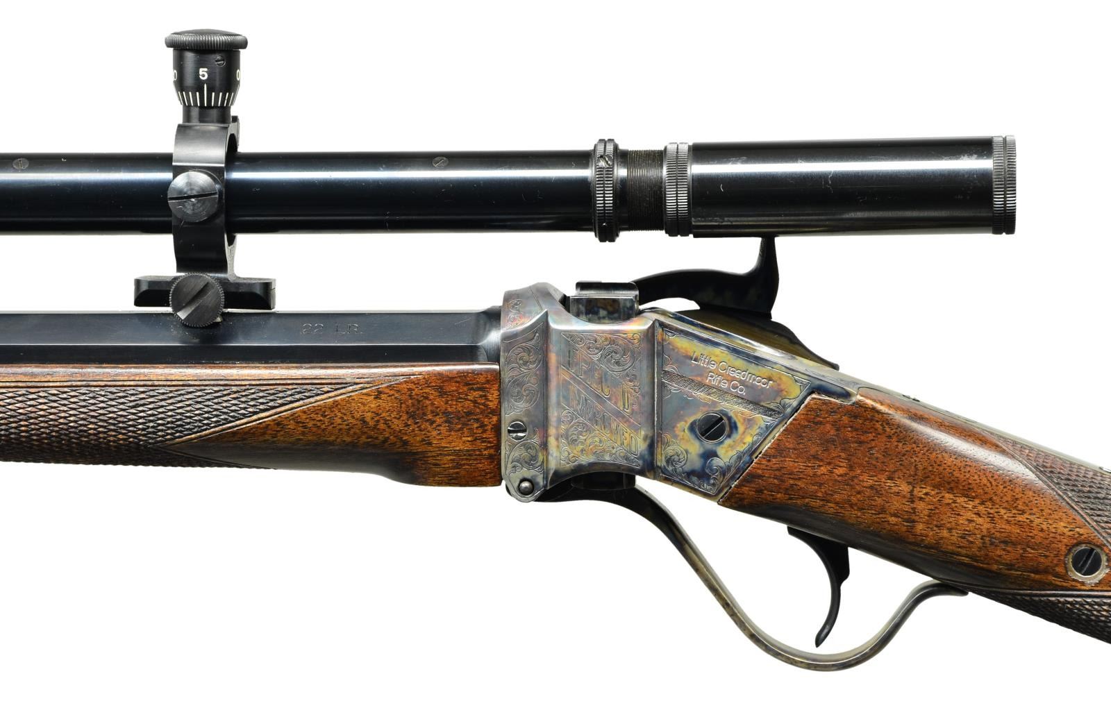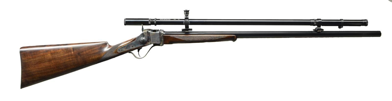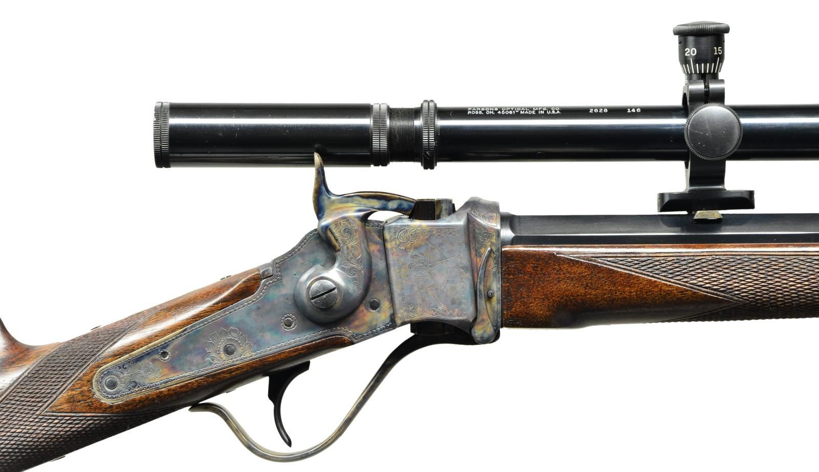 CUSTOM SINGLE SHOT RIFLE. Cal. 22 LR. S# 0101. Bbl. 26" octagon. Engraved scaled down M1874 style action marked "FRUEND IMPROVED" on left side. Right side of frame depicts a native American archer. Balance of frame & lock plate have highlights of foliate engraving w/ chain type borders. Complimenting engraving extends to the lever & hammer. Blue finish w/ case colored action. Parsons Optical Mfg. Co. 28" tubular scope w/ external adj. & multi dot crosshairs on bbl. blocks. Schnable tipped walnut forearm & straight grip stock featuring hand checkering w/ Neidner checkered steel buttplate. WEIGHT W/ SCOPE: 8 lbs. CONDITION: near excellent retaining virtually all wood & metal finish. Near excellent bore. Scope has bright optics. (23-461/DS) MODERN. $5,000-6,000.