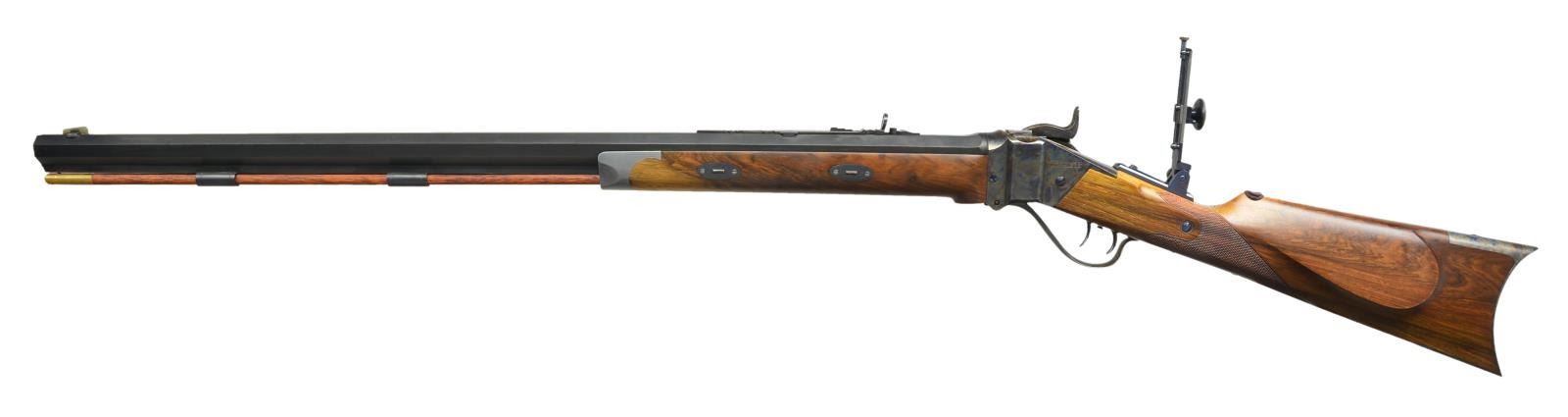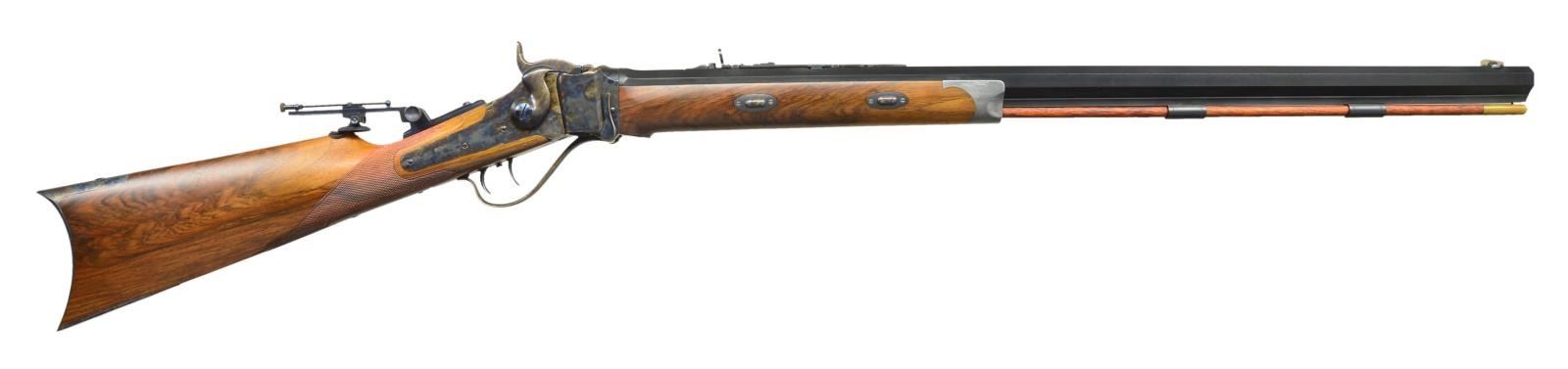 Cal. 45-2/10" (45-70). S# 4392. Bbl. 30" heavy octagon measuring 7/8" across flats at muzzle. Top bbl. flat is marked “Old Reliable”. Rocky mountain blade front sight with long tang buckhorn rear sight and long range Vernier tang sight. Case colored action features double set triggers. Straight grip cheek piece stock of fancy walnut as hand checkering with case colored crescent steel buttplate and toe plate. Brass tipped hardwood ramrod is held on iron under rib bike to faceted iron pipes. Weight; 11 lbs. 2 oz. High quality rifle produced In Big Timber, MT. Since 1976. CONDITION: near new retaining virtually all factory finishes. Bright near excellent bore. (22-5494/DS). MODERN. $1,500-2,200.