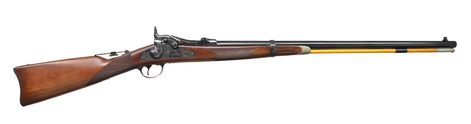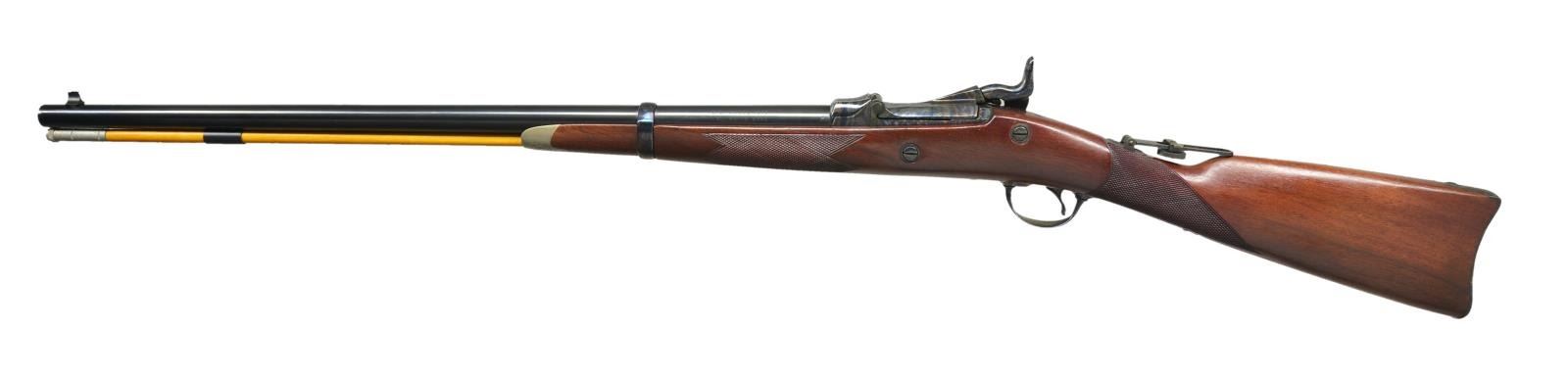 RIFLE. Cal. 45-70. S# 67. Bbl. 26" round. Bead front sight with tang rear sight. Case colored lock and action have scroll ornamentation. Band fastened sporter stock features pewter tip, cut checkering and case hardened carbine buttplate. Hardwood wiping rod is held by single plain pipe. Manufactured 1975-1981. UNATTACHED ACCESSORIES: two piece foam box without label or cover. CONDITION: over 98% wood and metal finish showing small handling marks. Bright near excellent bore. (22-5492/DS). MODERN. $600-900.