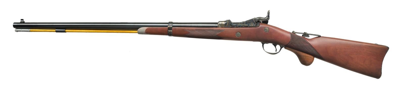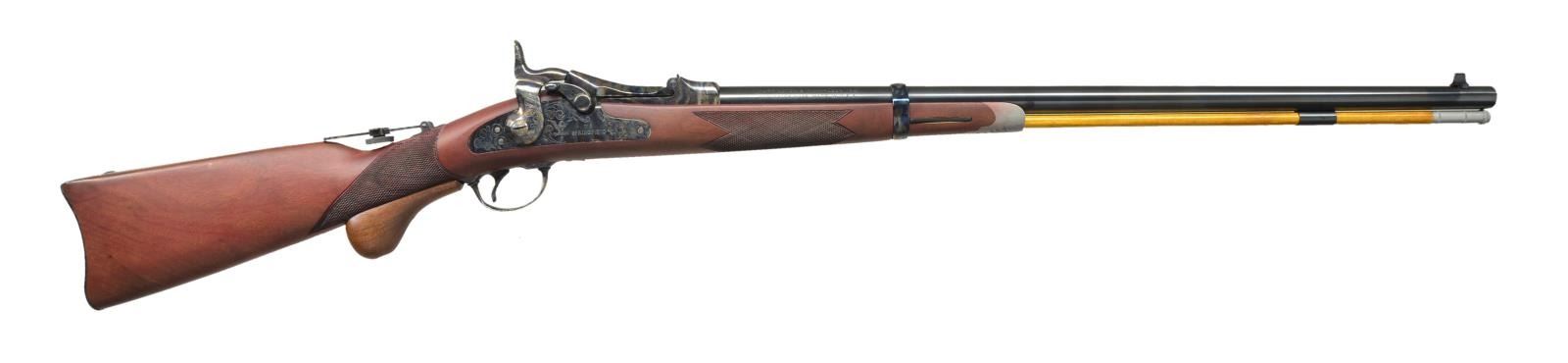 Cal. 45-70. S# 4850. Bbl. 26" having brass bead dovetailed front sight plus adjustable target style at mid point of grip. Mfg. 1972-1986 as reproduction of Springfield Model 1873 Officers Model. Checkered walnut stock having reddish mahogany tone; added grip adapter is distinctly walnut. Case colored barrel band, action, trigger guard, buttplate, lock and hammer; each having varying degrees of engraving. Light colored hardwood ramrod w/ pewter colored tip plus pewter toned forend tip with fir tree style engraving. Vintage military style markings to include "Springfield" on lock plate, circled P behind grip adapter, Model 1873 on breech block plus US at top of buttplate. CONDITION: all aspects near excellent including bore; appears unfired. (22-5530/NW). MODERN. $700-1,000.
