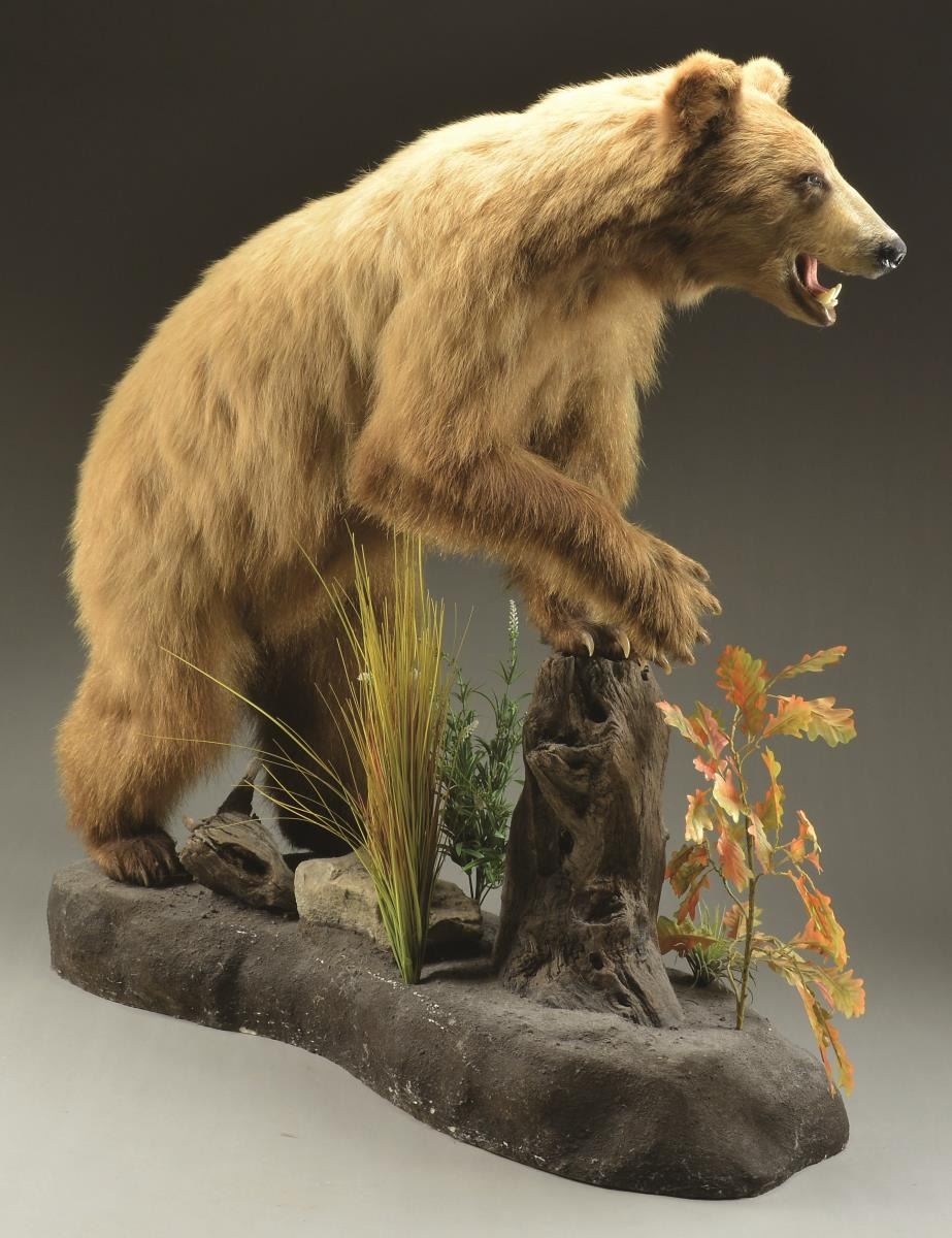 FULL BODY MOUNT BY FAMOUS TEXAS TAXIDERMIST MR. FRED RANOLPH. Mr. Randolph retired with his wife in Texas after 45 years as a taxidermist serving the elite Texas Hunter. This may be the only chance to own Mr. Randolph's work at this extensive level of animal. This mount measures approx. 4 feet tall x 3 1/4 feet long & 1 1/4" wide. Bear appears to be mounted to a rough textured base w/ plastic foliage & tree stump.
