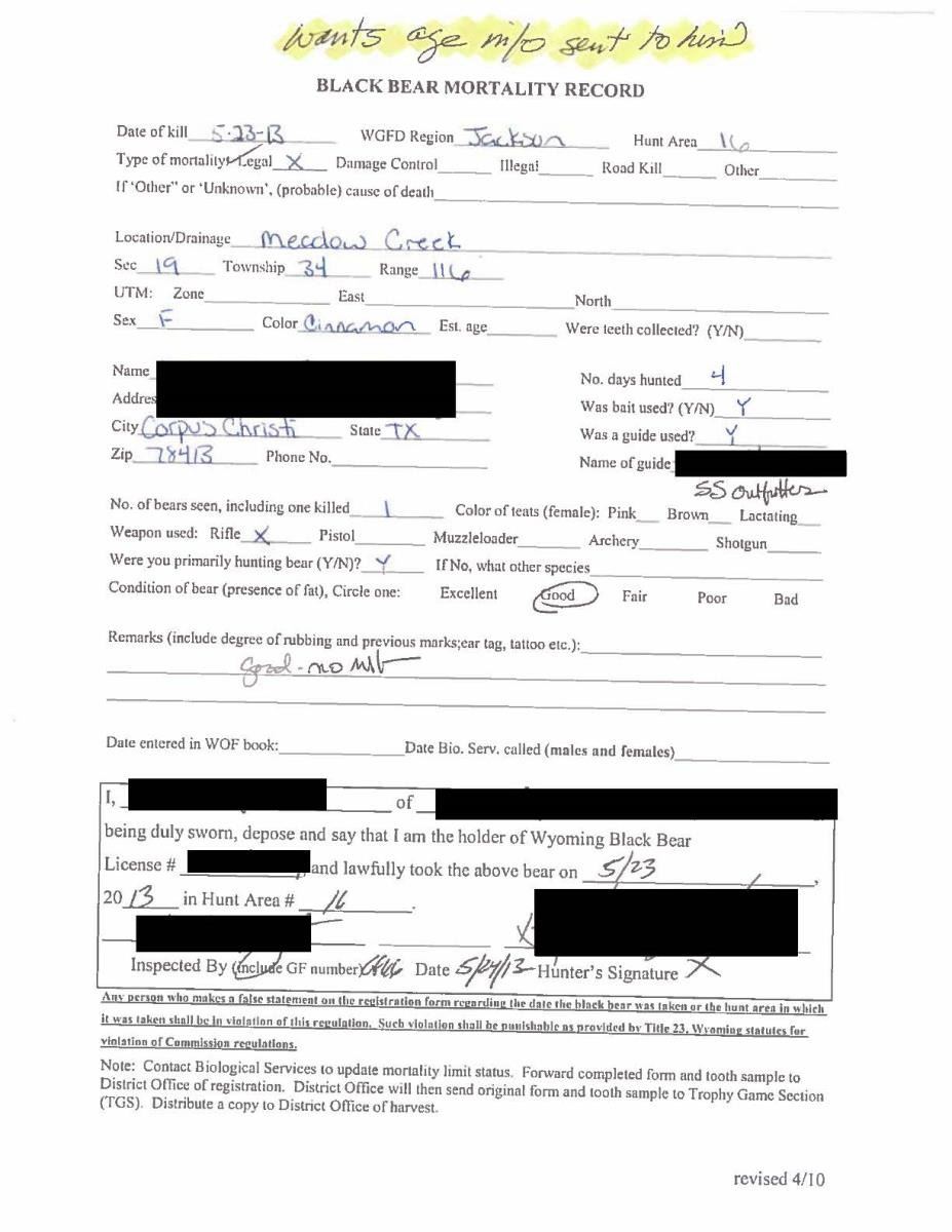 UNATTACHED ACCESSORIES: A skull measuring approx. 10" x 6" x 5" on a wooden base. A Black Bear Mortality Record dated 05-23-13 getting specifications of when the black bear was killed. CONDITION: very good. (02-17681/MD) $400-600
