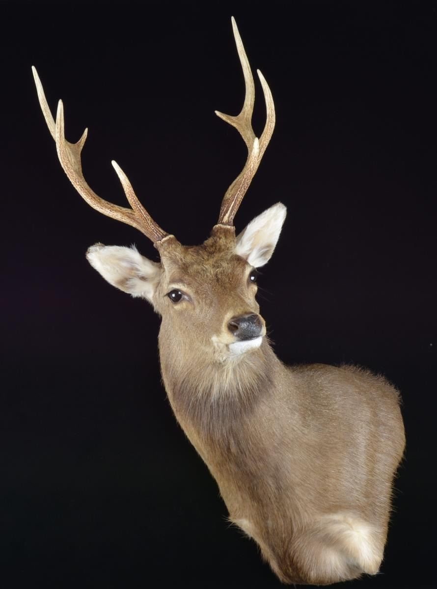 FAMOUS TEXAS TAXIDERMIST MR. FRED RANDOLPH. Mr. Randolph retired with his wife in Texas after 45 years as a taxidermist serving the elite Texas Hunter. This may be the only chance to own Mr. Randolph's work at this extensive level of animal. The Sika deer is native to East Asia & are easily distinctive by the white spots on its back. This mount measures approx. 3 1/2 feet x 1 3/4 feet x 1 1/2 feet. This mount lacks the distinctive spots on its hair, but displays 1 1/2 feet antlers. CONDITION: very good overall w/ smooth brown hair & pleasing toned antlers. A great piece to display. (02-17684/MD). $100-300