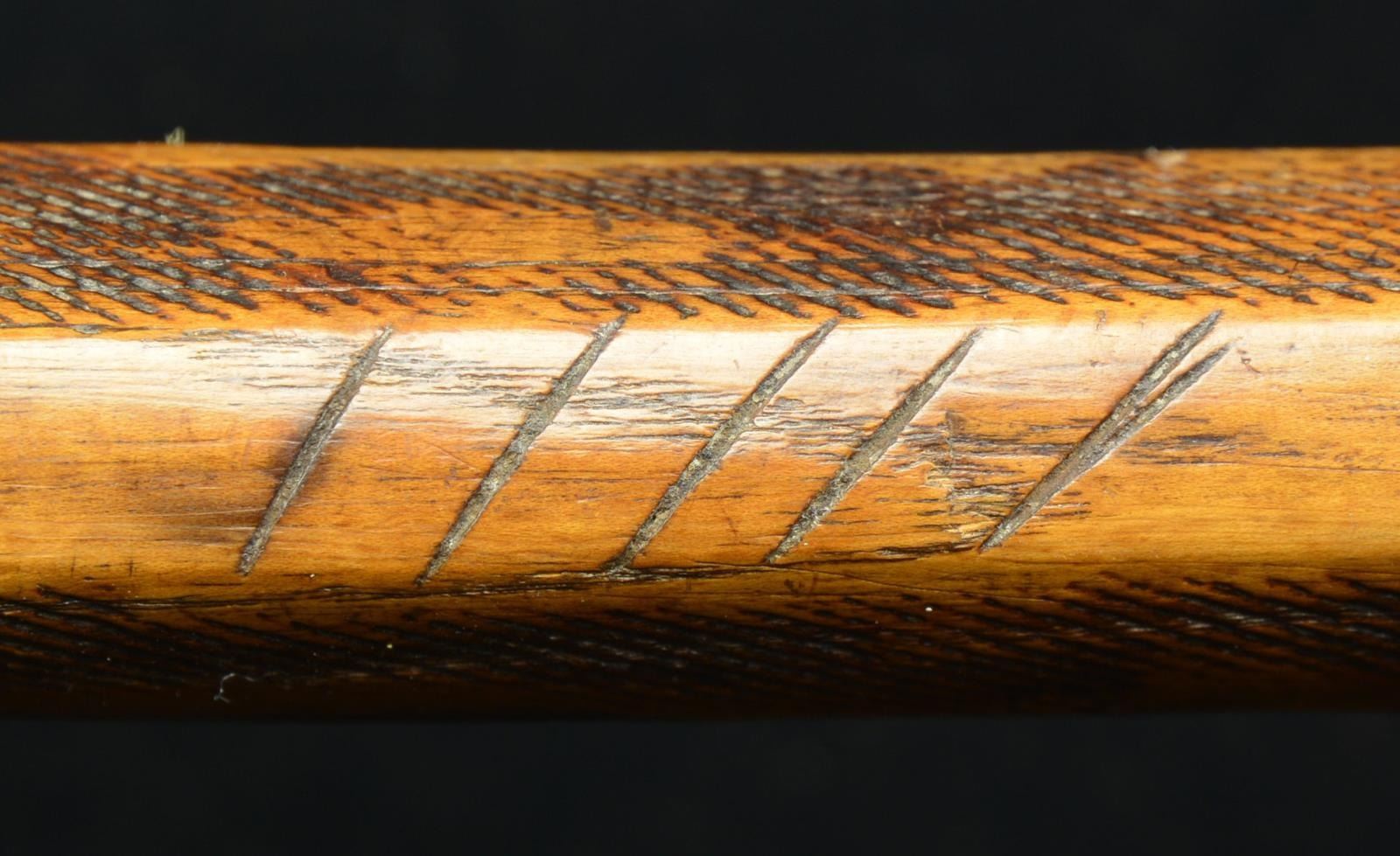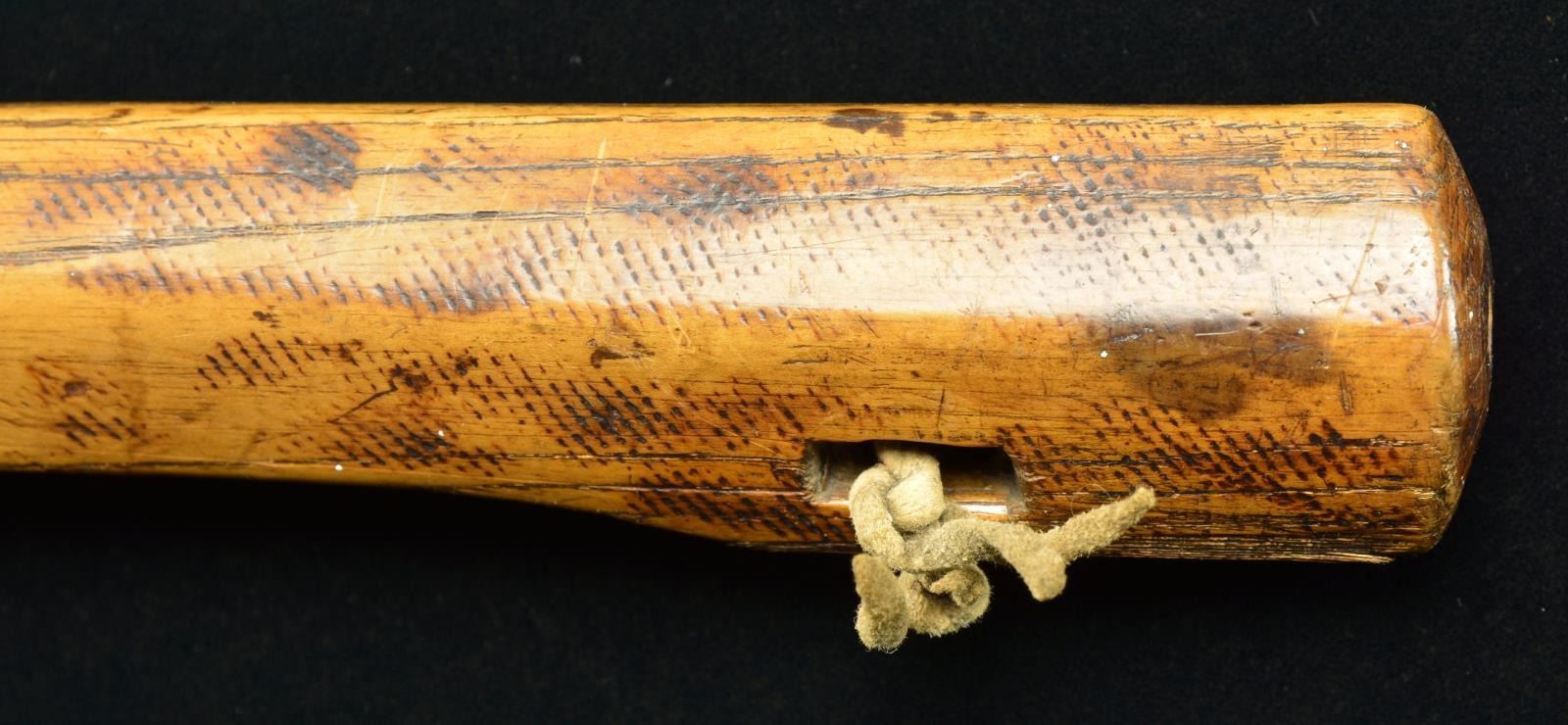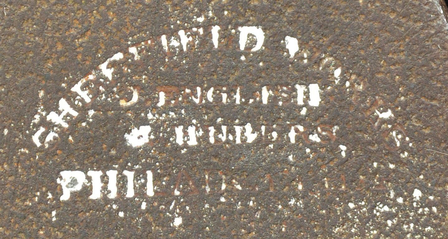 8.25" Head, 2.5" cutting edge, marked with same dies used on their bowies: “SHEFFIELD WORKS” in arc above “J. ENGLISH / & HUBERS / PHILADELPHIA”. This example originated in the well known Jim Dressler collection. English & Hubers can be dated to mid 1830s, the 17.5" fire branded ash haft is in Plains style of the 1870s. UNATTACHED ACCESSORIES: file of provenance and John Baldwin letter of authenticity. CONDITION: very good overall, dark uncleaned patina, marking mostly discernible as can be seen in photos. Haft fits well with age crack, nailed at top as often seen for tightening for better fit. PROVENANCE: From the Lifelong Collection of Glen E. Mattox. (02-18496/JS). $4,000-6,000.
