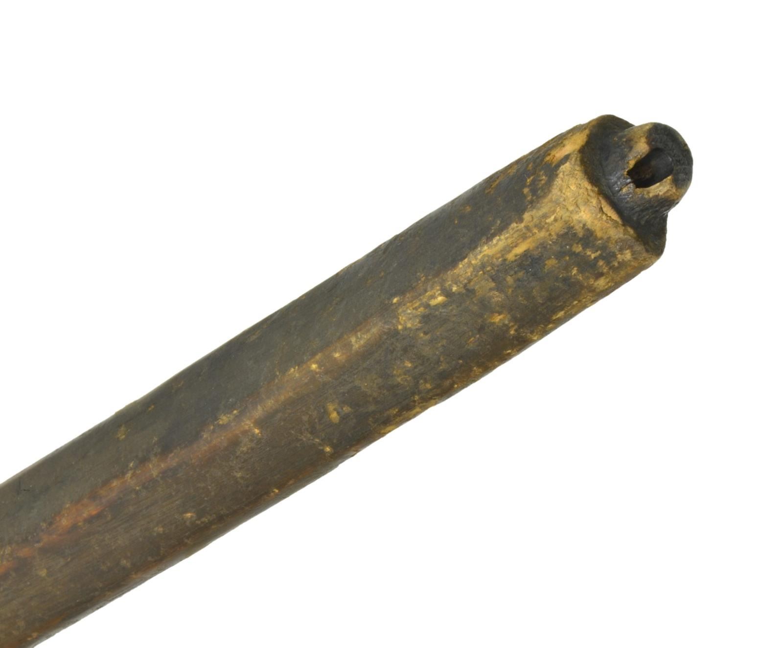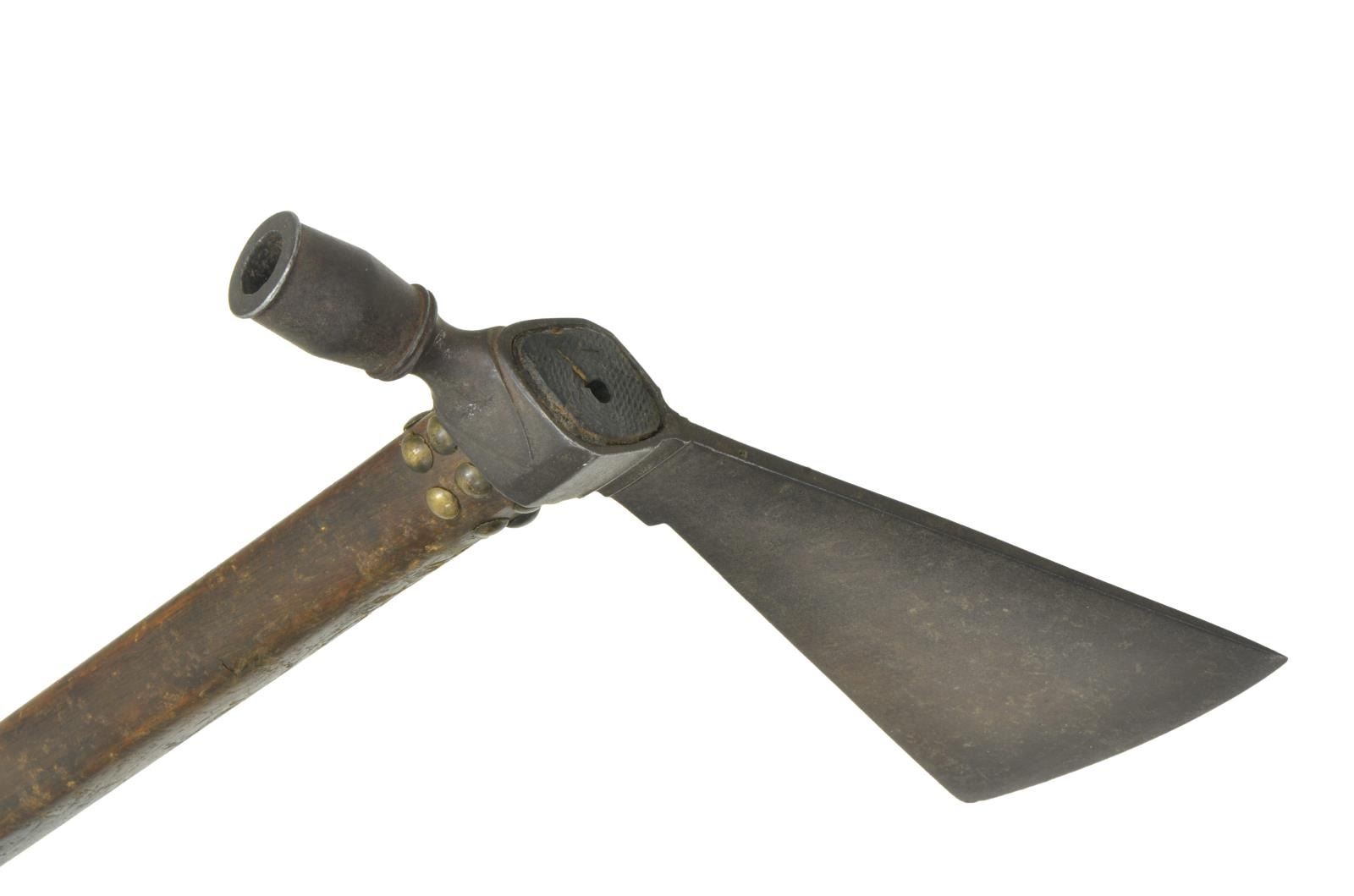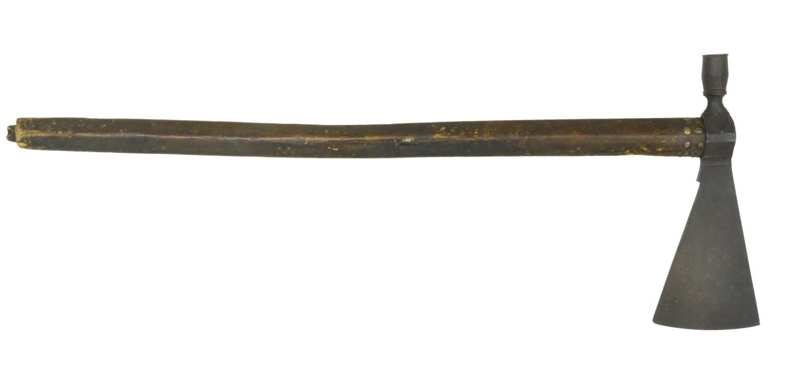 25.5” original well patinaed haft with tack design at 10” forged iron head, 4” cutting edge. Tomahawk overall appears complete and a fine original survivor of the late 19th century. CONDITION: very good overall, head is uncleaned with heavy dark iron patina, haft fits well at eye, missing plug, heavy scuffing on one edge, and skinny chip on one side into pipe channel, well patinaed over. PROVENANCE: From the Lifelong Collection of Glen E. Mattox. (02-18912/JS). $1,500-2,500.