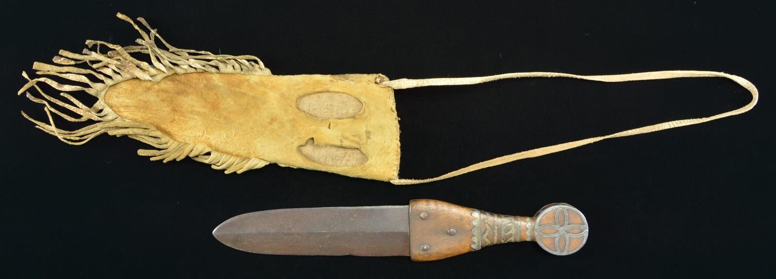 9.5” x 3.5”, thread & sinew sewn, rawhide fringed two-layer deer & buffalo hide, full coverage “4 Winds” design with dark blue, turquoise, transparent red, transparent yellow, and white beads. Blacksmith made 12” dag, 6.5” blade made from file, medial ridge, 1.75” thick, pewter inset design. This sheath from the Floyd Ritter collection is pictured on page 3 with no knife of John Baldwin’s 1997 text “EARLY KNIVES & BEADED SCABBARDS OF THE AMERICAN FRONTIER”. The sheath is also pictured bottom of page 43 with different dag. CONDITION: very good overall, small loss of beads, especially at throat. Blade has dark iron patina with sharpening, rounded point. PROVENANCE: From the Lifelong Collection of Glen E. Mattox. (02-18358/JS). $2,000-3,000.