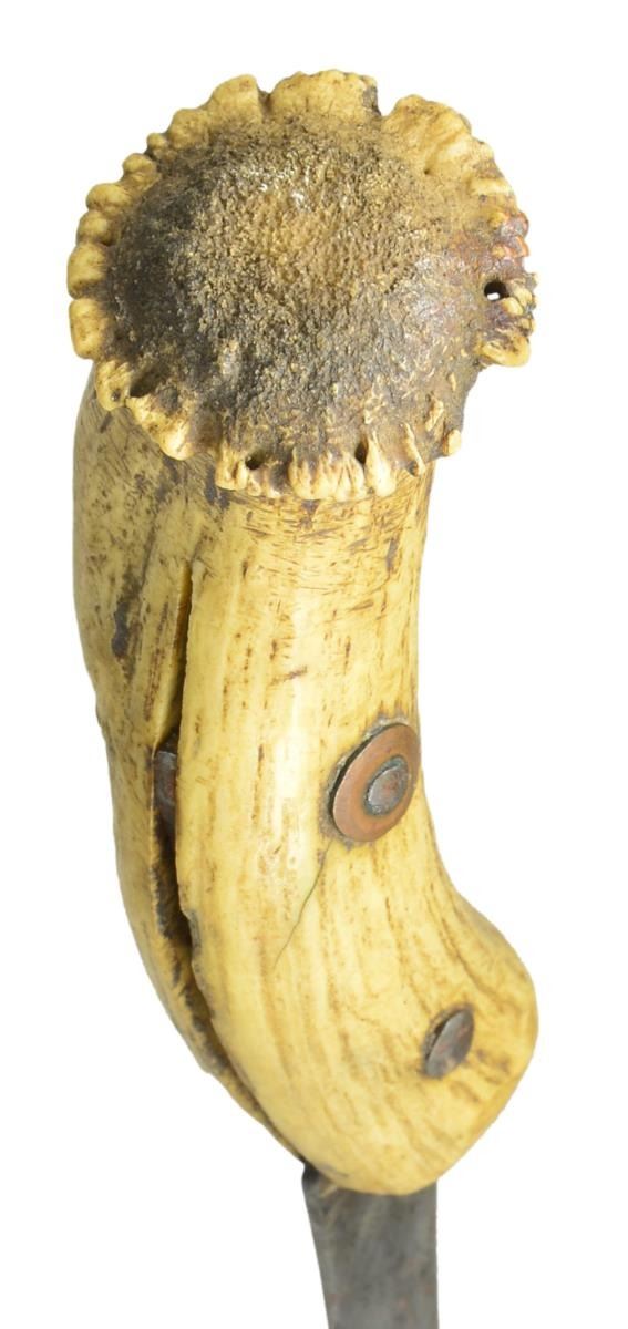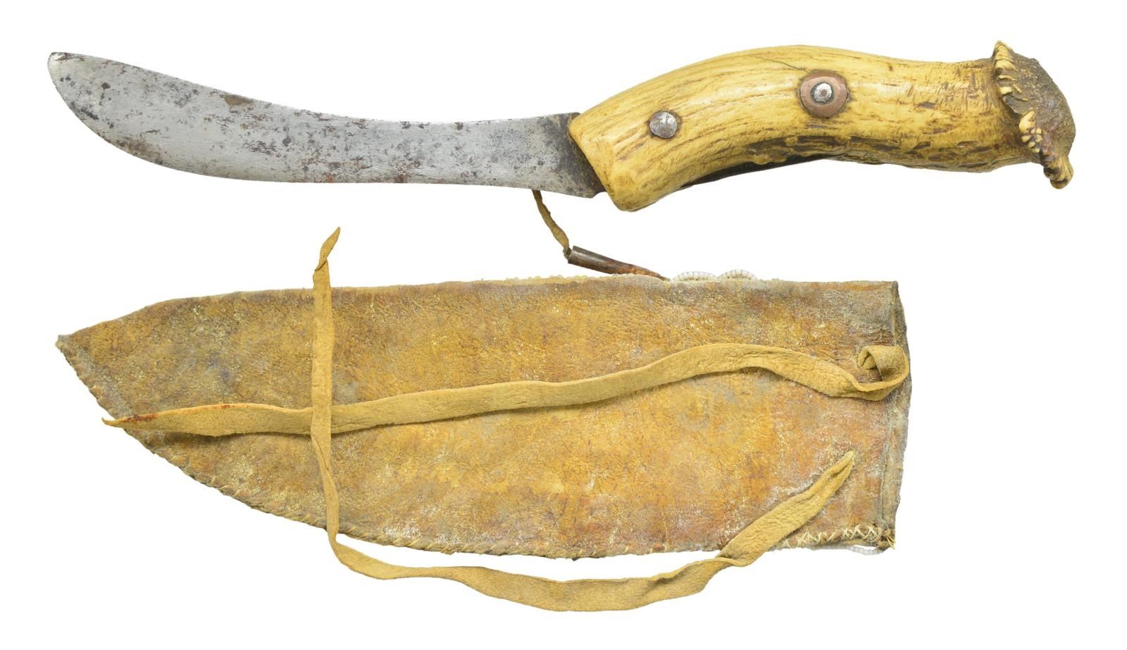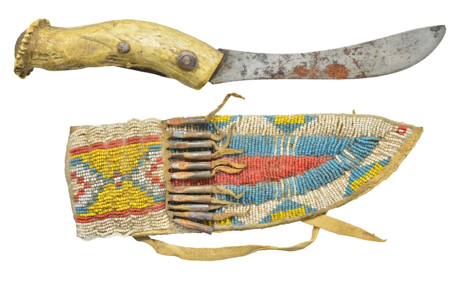 & SKINNING KNIFE. 11" Skinner, or as some folks say "scalper", retains 6" very sharp blade w/ crown stag grip. Sheath is sinew sewn, decorated w/ red, white, blue & greasy yellow beads in typical design. There is also a sewn row of rawhide w/ 11 pinched tin cones, 20" rawhide strap. CONDITION: very good overall. Blade has areas of sharpening, staining & rust. Sheath is supple, complete w/ soiling. PROVENANCE: Collection of John Montague. (02-16581/JS). $900-1,400.