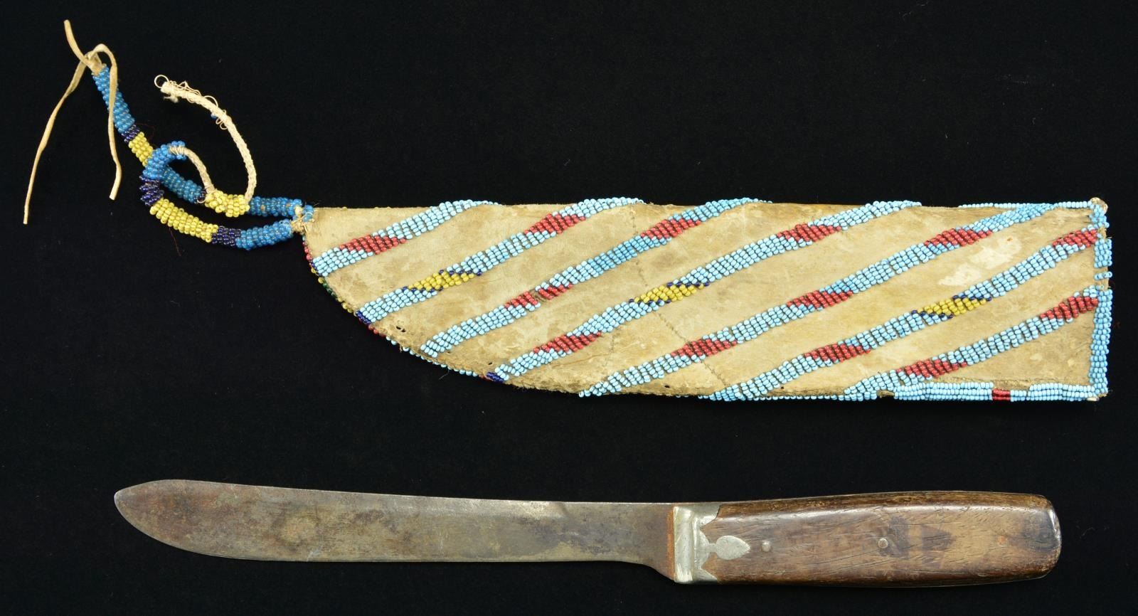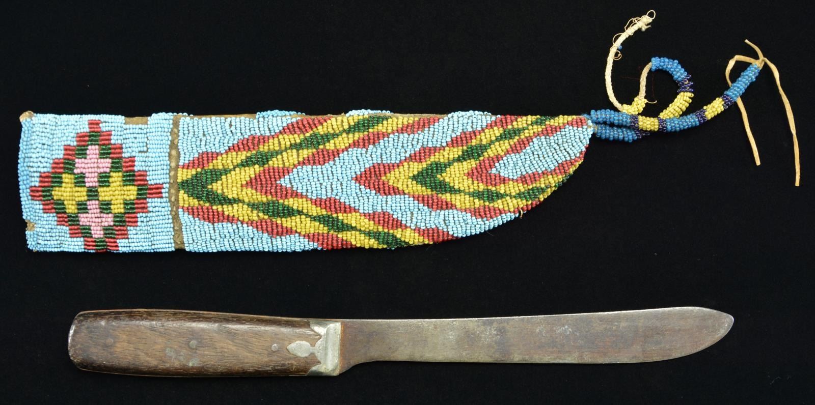 KNIFE SHEATH & KNIFE. 8” x 3”, sinew sewn, full coverage on one side with white-heart red, pink, greasy yellow, & green beads on light blue ground, reverse has 4 diagonals of mostly light blue. 4” beaded drop. 12” pewter bolster skinning knife with 7” blade. CONDITION: very good overall, small loss of beads, central row of rawhide adornment missing. PROVENANCE: From the Lifelong Collection of Glen E. Mattox. (02-18360/JS). $800-1,200.