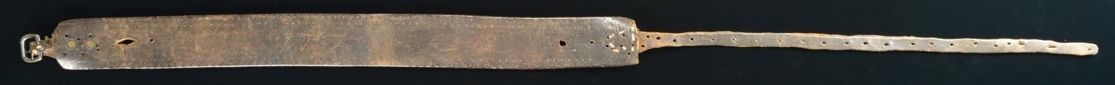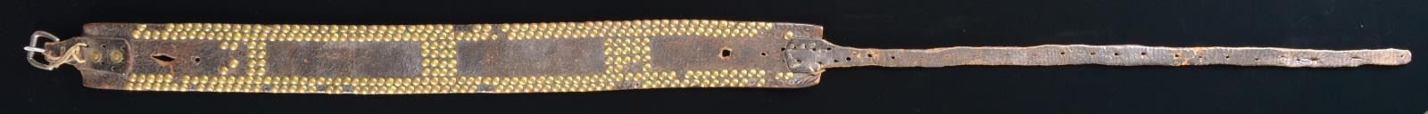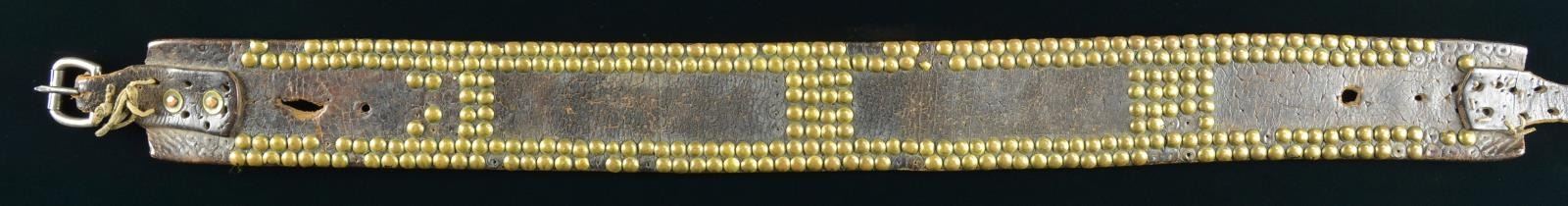 TACK SPOTTED GUN OR KNIFE BELT. 2.75” wide, 32” plus 25” tongue, roller buckle, rarely survived as did holsters and knife sheaths. CONDITION: good overall, missing some brass tacks from use, well patinaed. PROVENANCE: From the Lifelong Collection of Glen E. Mattox. (02-18521/JS). $800-1,200.