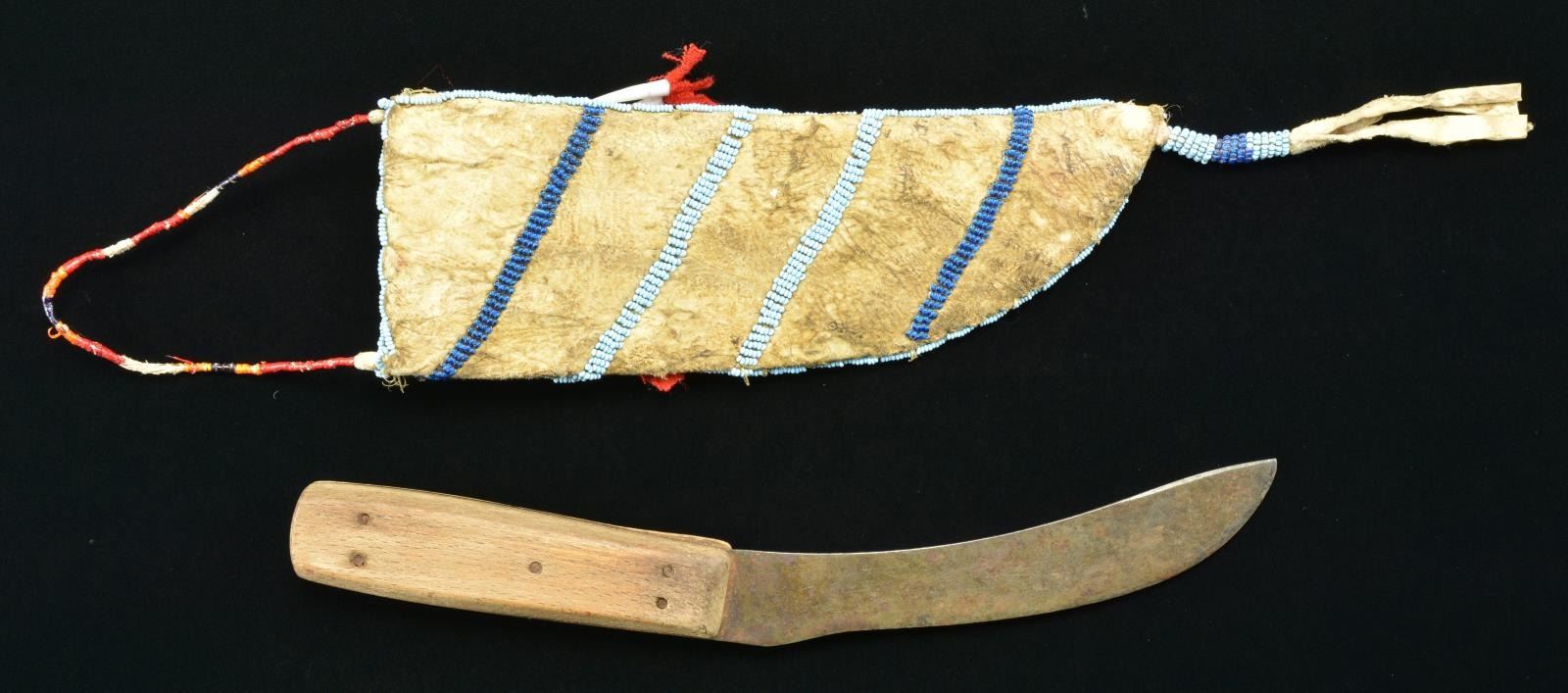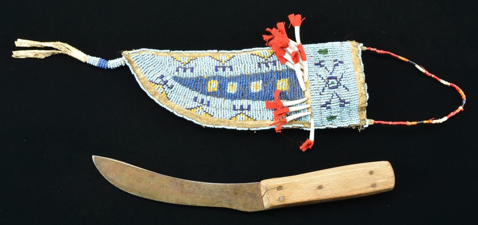KNIFE SHEATH AND KNIFE. 8" x 3", Sinew sewn, full coverage on one side with dark blue, greasy yellow & green beads on light blue ground, reverse has 4 diagonals of light and blue. Row of long cone shaped shells with red trade cloth embellishments below throat, 4" beaded drop, quilled lanyard. 10" Skinning knife with curved 8" blade skinning knife. CONDITION: very good to fine overall, complete beading, about 15% quilling missing. PROVENANCE: From the Lifelong Collection of Glen E. Mattox. (02-18337/JS). $600-800.