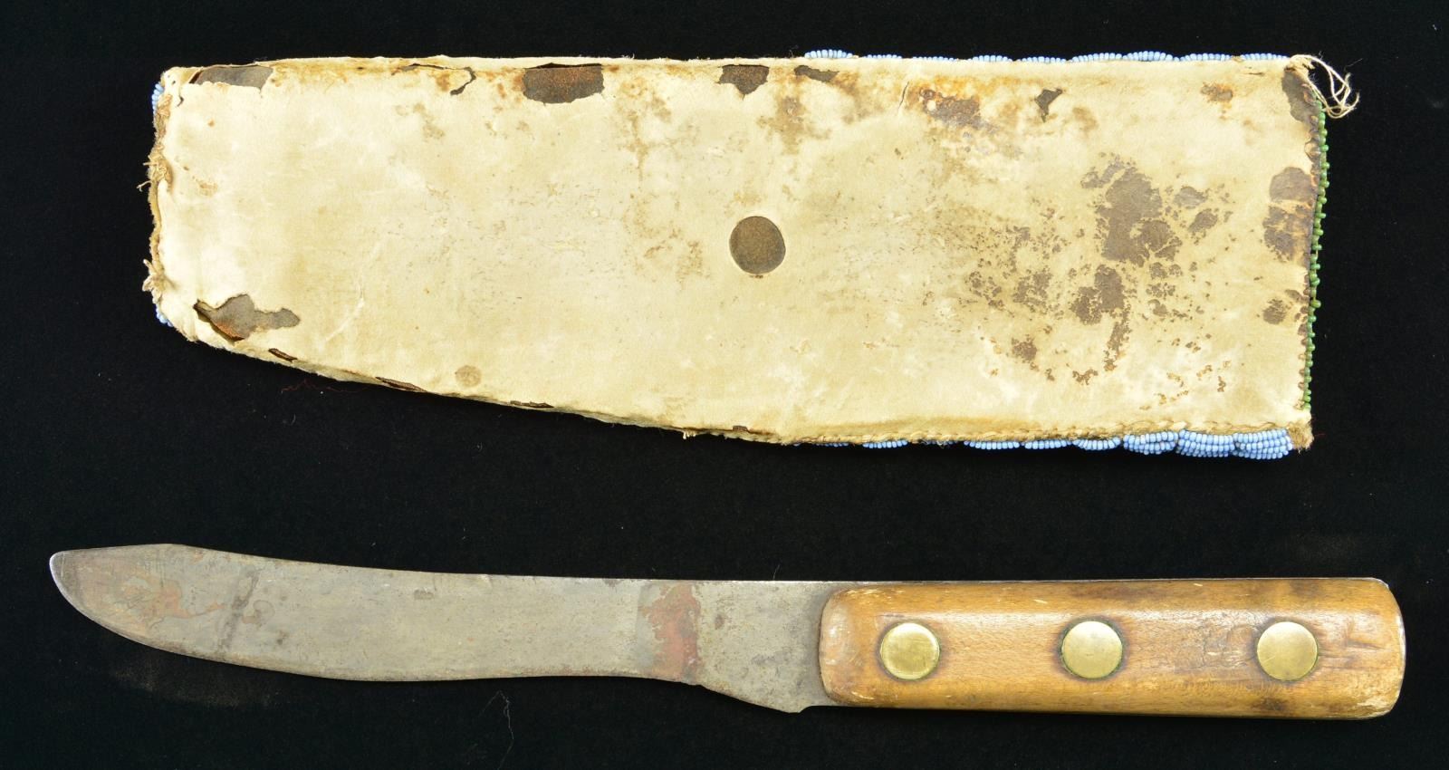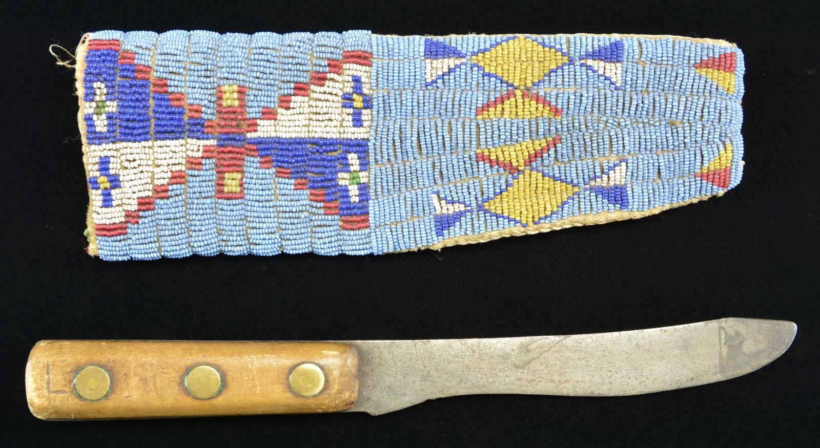 8.5” x 3”, sinew sewn, full coverage with greasy yellow, navy blue, white-heart red, white & green beads on light blue ground, flat tip, 10” unmarked skinning knife. CONDITION: very good overall. PROVENANCE: From the Lifelong Collection of Glen E. Mattox. (02-18339/JS). $600-800.