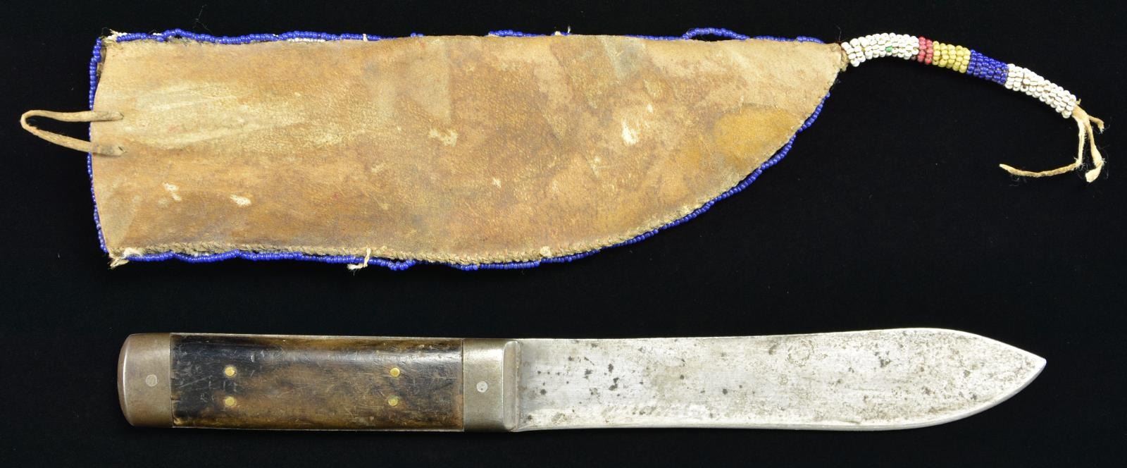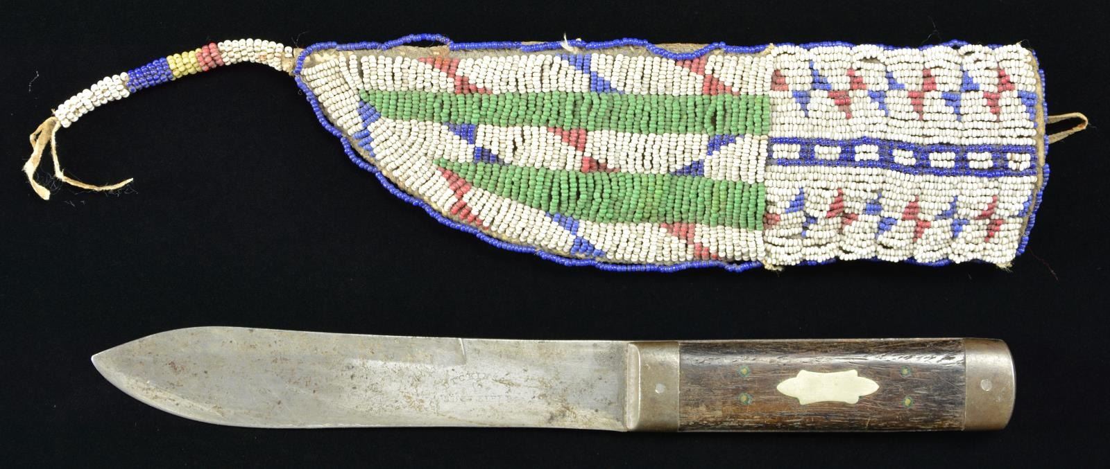 8” x 2.5”, sinew & thread sewn, full coverage with green, greasy yellow, white-heart red, & navy blue beads on white ground, 3” beaded drop. 10” Sheffield made skinning knife with iron mounts. CONDITION: very good overall. PROVENANCE: From the Lifelong Collection of Glen E. Mattox. (02-18342/JS). $600-800.