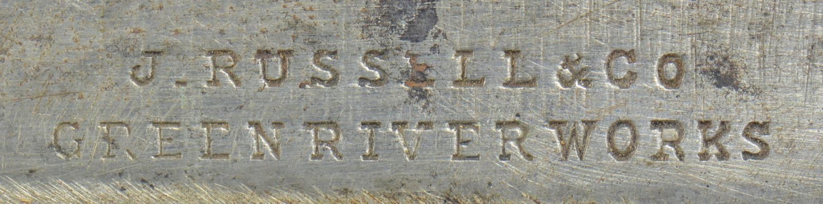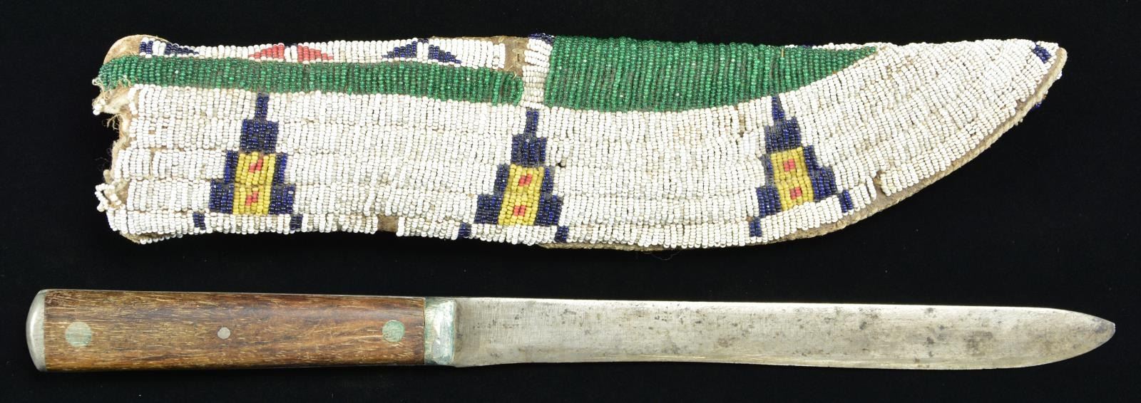 & KNIFE. 10.5” x 2.5”, sinew sewn, full beaded coverage with navy blue, green, black, white-heart red, greasy yellow, turquoise blue beads on white ground. Pewter bolster long 12" skinning knife, 7.” “GEO RUSSELL & CO / GREEN RIVER WORKS” marked blade. This knife & sheath from the Floyd Ritter collection pictured on page 3 of John Baldwin’s 1997 text “EARLY KNIVES & BEADED SCABBARDS OF THE AMERICAN FRONTIER”. CONDITION: very good overall, small loss of beads. PROVENANCE: From the Lifelong Collection of Glen E. Mattox. (02-18344/JS). $600-800.