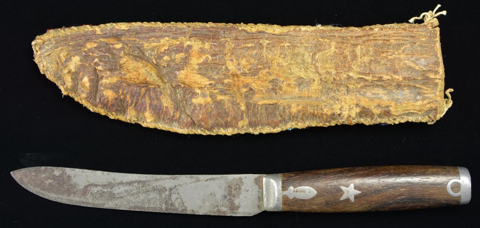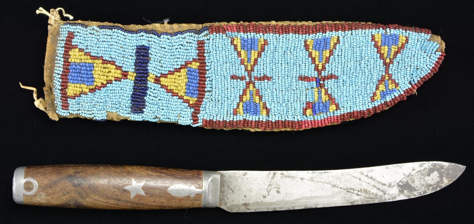 9” x 2.5”, sinew sewn, full coverage with dark blue, black, white-heart red, greasy yellow, & transparent red beads on light blue ground. Pewter mounted hunter/skinner knife 10” overall, 6” blade with indiscernible maker, inset pewter star in burl grip. This knife & sheath from the Floyd Ritter collection is pictured on page 3 of John Baldwin’s 1997 text “EARLY KNIVES & BEADED SCABBARDS OF THE AMERICAN FRONTIER”. CONDITION: good to very good overall, small loss of beads at tip. PROVENANCE: From the Lifelong Collection of Glen E. Mattox. (02-18348/JS). $600-800.