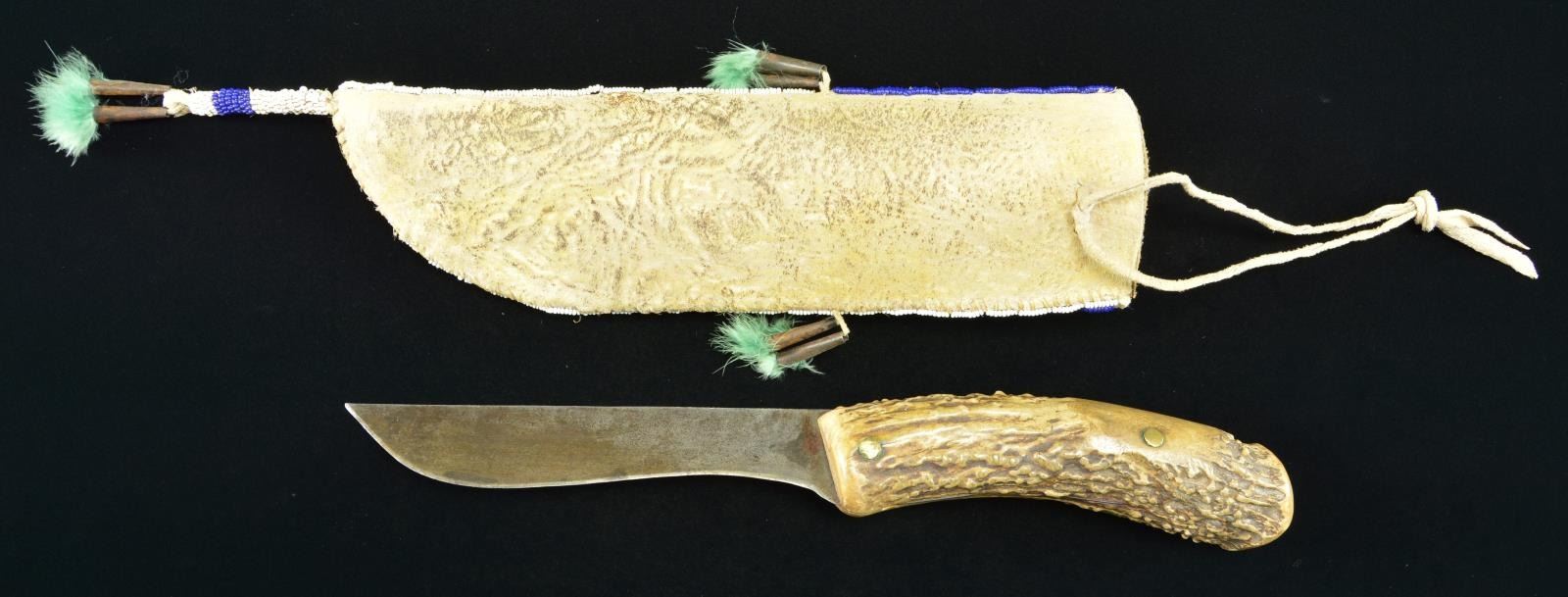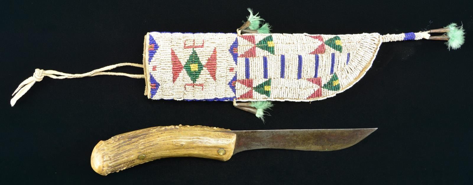 10” x 3”, sinew sewn, full coverage with yellow, white-heart red, green, & navy blue beads on white ground, 3.5” beaded drop and 2 tinkle cones with blue feather. Large unmarked skinning knife with split crown stag grip. CONDITION: very good overall. PROVENANCE: From the Lifelong Collection of Glen E. Mattox. (02-18350/JS). $600-800.