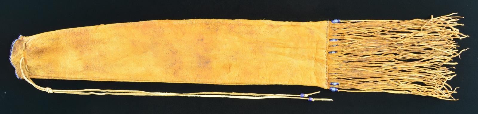 32” overall with rawhide fringe, navy blue, sky blue, light blue sinew sewn beads in floral design, beaded edges top & bottom, larger blue beads on fringe. CONDITION: fine overall. supple leather, beadwork appears all intact as does fringe. (02-19342/JS). $400-600.