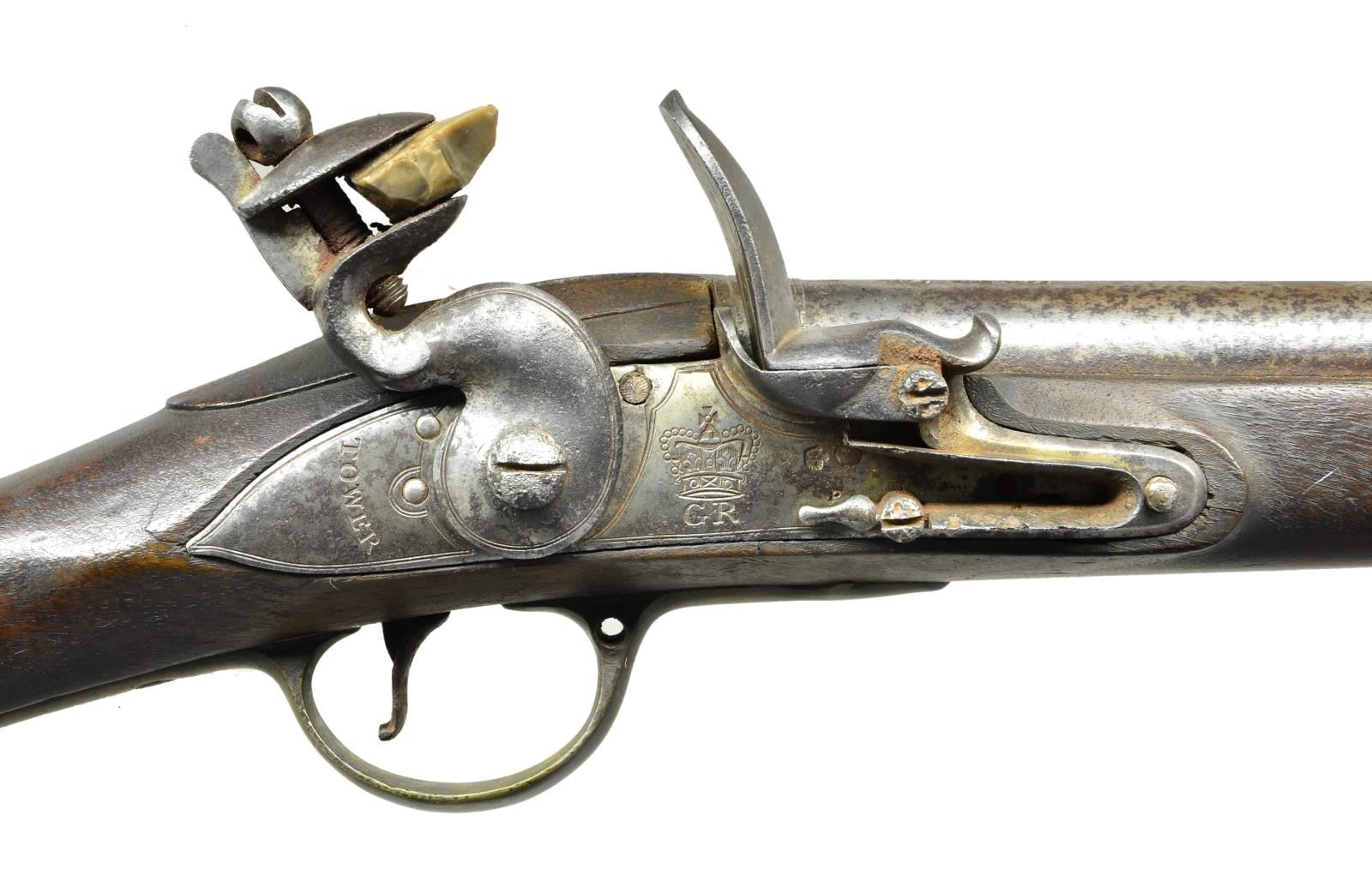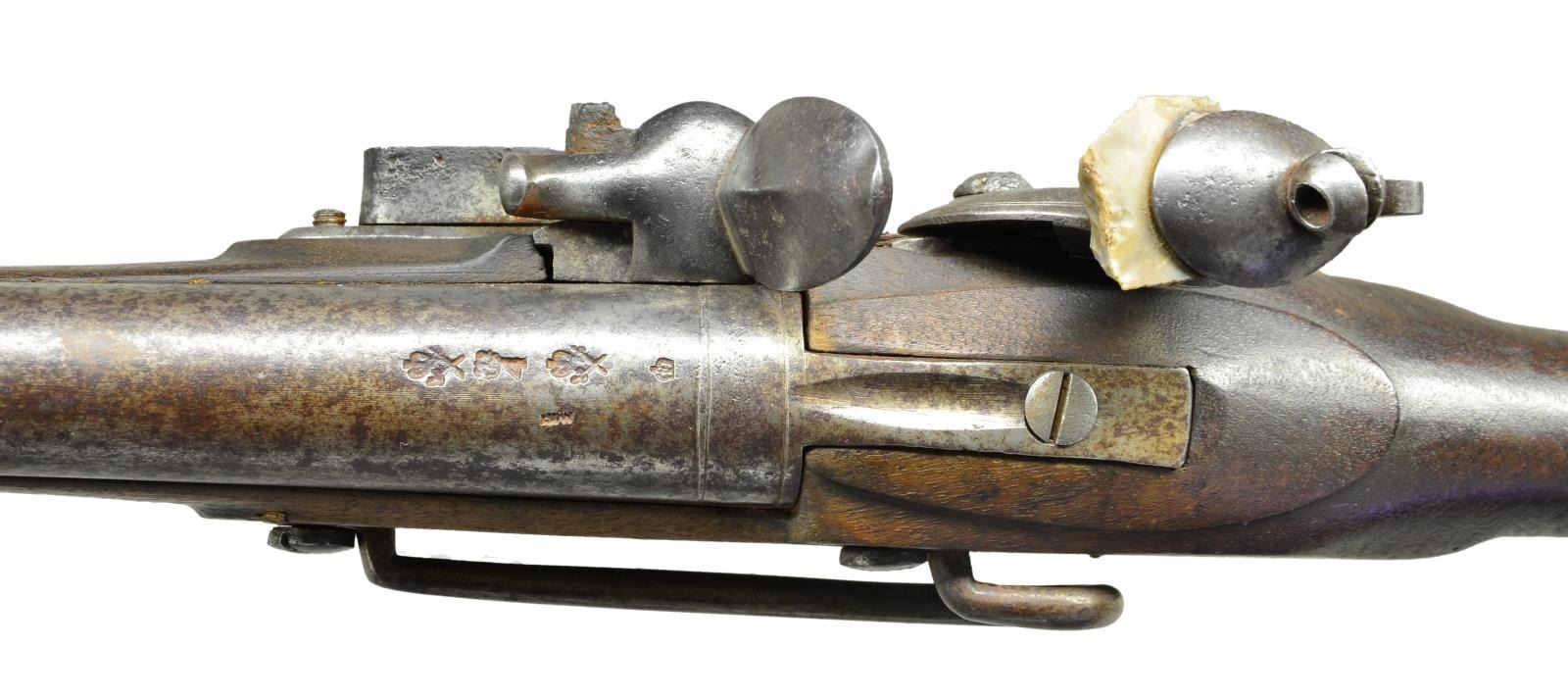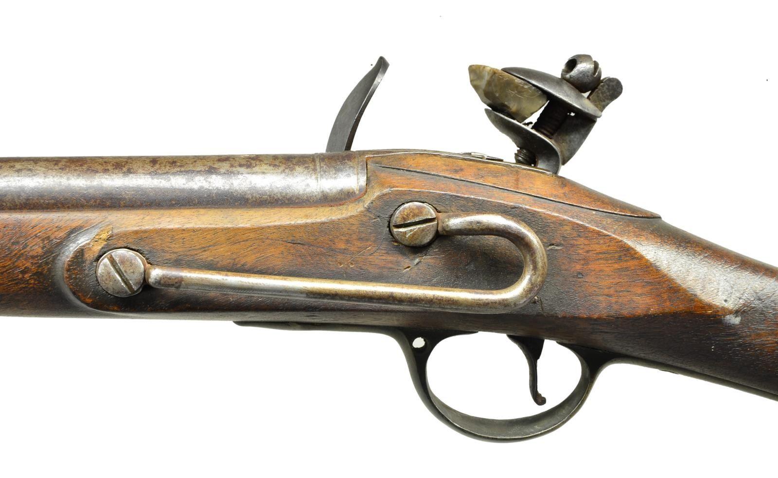 Cal. 75. S# NSN. Bbl. 24.5”. 39.5” overall, military altered musket, lock escutcheon replaced with iron carbine bar, brass furniture. CONDITION: good overall, large crack poorly repaired above front ramrod pipe, mottled iron patina, shortened wood ramrod, stiff functional action, clear dark smooth bore. (01-22916/JS). ANTIQUE. $1,000-1,500.