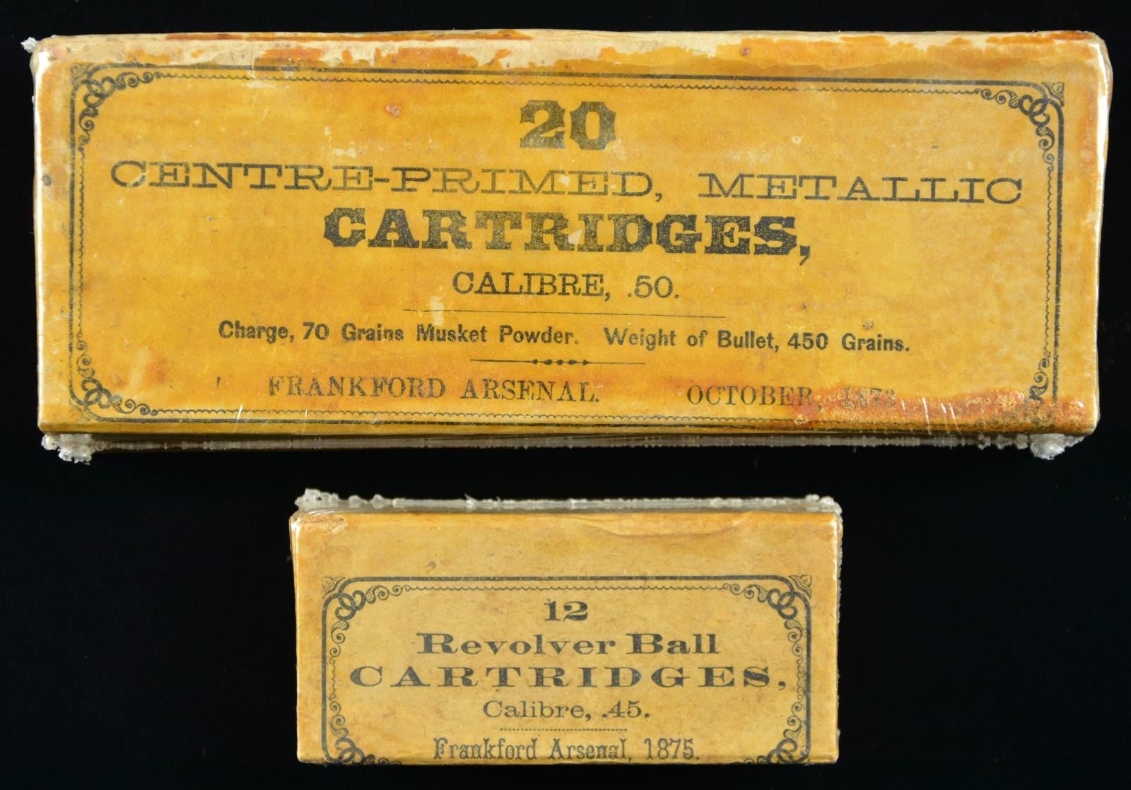 2) Box of 1875 dated Frankford Arsenal .45 Revolver Ball cartridges for Colt SAA, S&W No. 3 Schofield revolvers. CONDITION: appears very good w/ light stains. (02-17814/MD). $300-500.