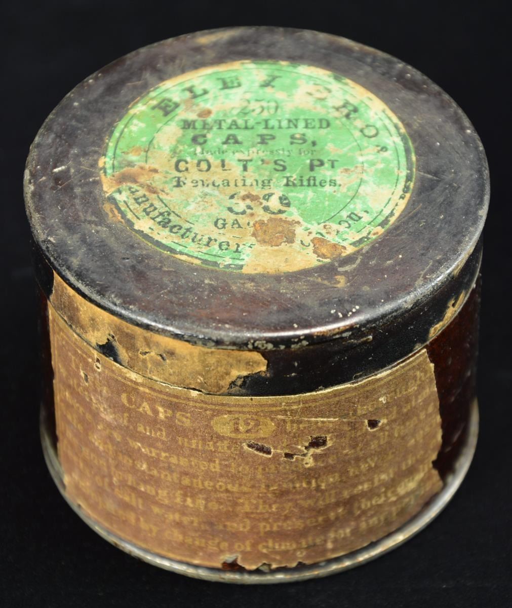 Height: 1 3/4". Diameter: 2 1/4". Green label on lid reads "ELEY BROS. / 250 / METAL-LINED / CAPS / MADE EXPRESSLY FOR / COLT'S PT / REVOLVING RIFLES / 30 / GAUGE / MANUFACTURERS". CONDITION: intact tin has good finish showing some flaking. Labels in fair condition showing portions missing & flaking. (02-19031/MD). $400-600.