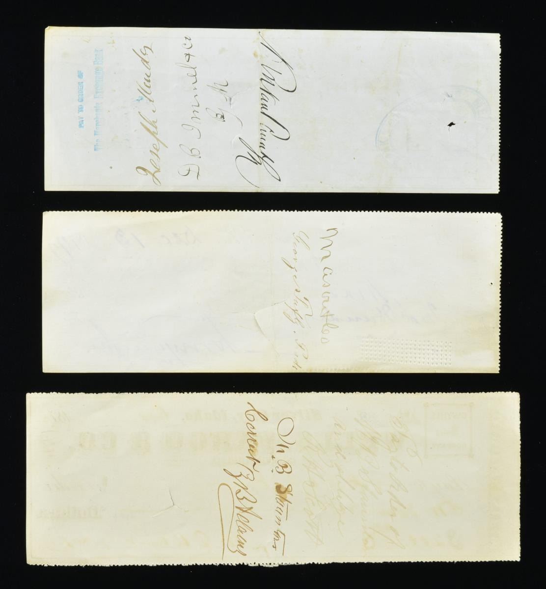 Three 1870s Wells Fargo checks from Silver City Idaho, Carson City NV, and San Francisco. All three checks are paid and endorsed, with interesting early printings and cancellations. Two “Wells Fargo Security Services” badges, one gold and one silver. CONDITION: good-very good overall. PROVENANCE: From the Lifelong Collection of Glen E. Mattox. (02-18572/JS). $800-1,200.