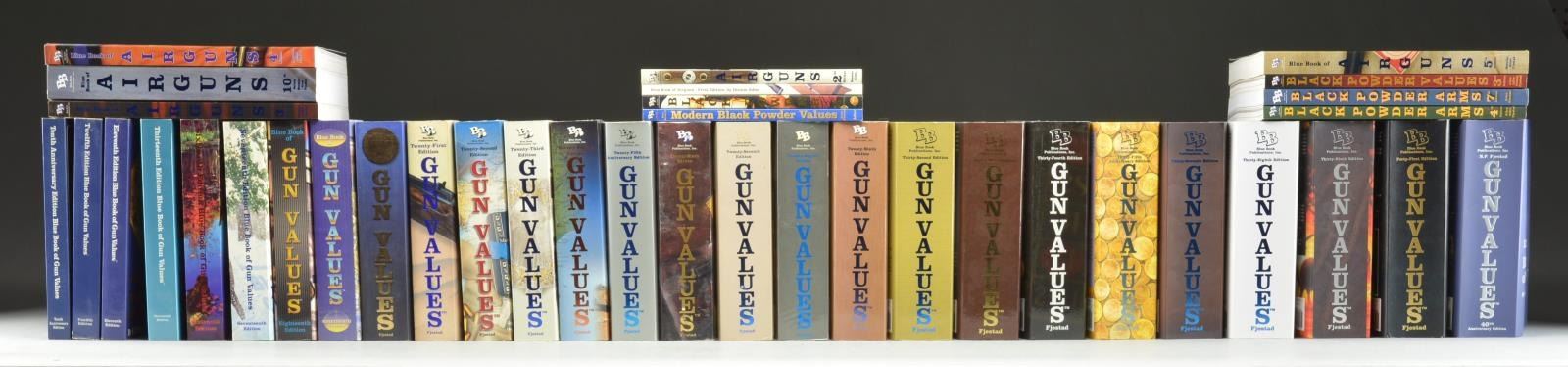 38 different volumes of the popular gun value "Blue Book" editions. 27 different editions of the Blue Book of Gun Values including the 10th, 11th, 12th, 13th, 16th, 17th, 18th, 19th, 20th, 21st, 22nd, 23rd, 24th, 25th, 26th, 27th, 28th, 29th, 32nd, 33rd, 34th, 35th, 36th, 37th, 38th, 39th, 40th, & 41st. 6 editions of the Blue Book of Airguns including the 1st, 2nd, 3rd, 4th, 5th, & 10th. 5 editions of Blue Book of Modern Black Powder Values including 1st, 2nd, 3rd, 4th & 7th. CONDITION: All books are in very nice condition. Some look like they have spent their life in a bookcase and other used as reference books. (02-17405/JZ). . $100-200.