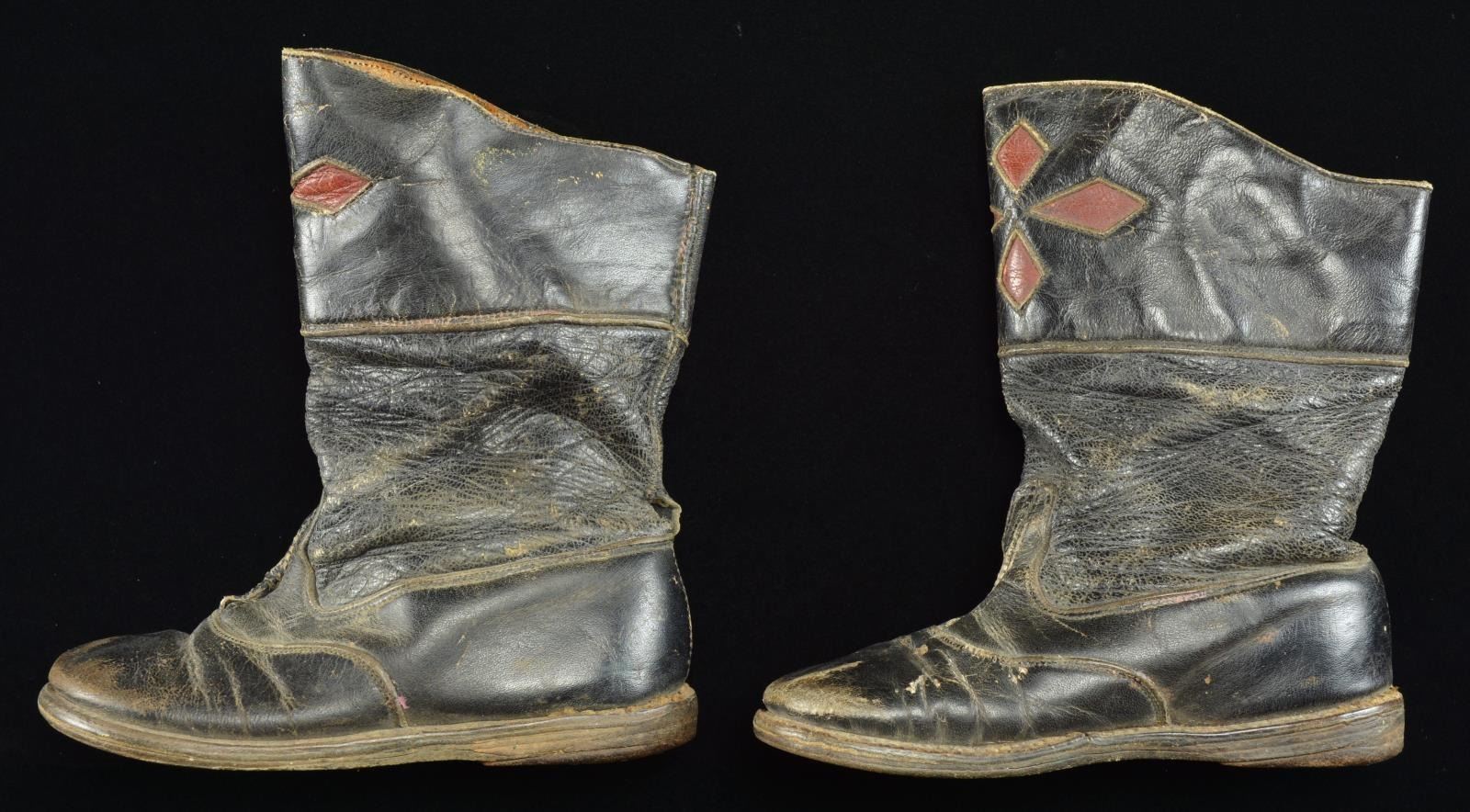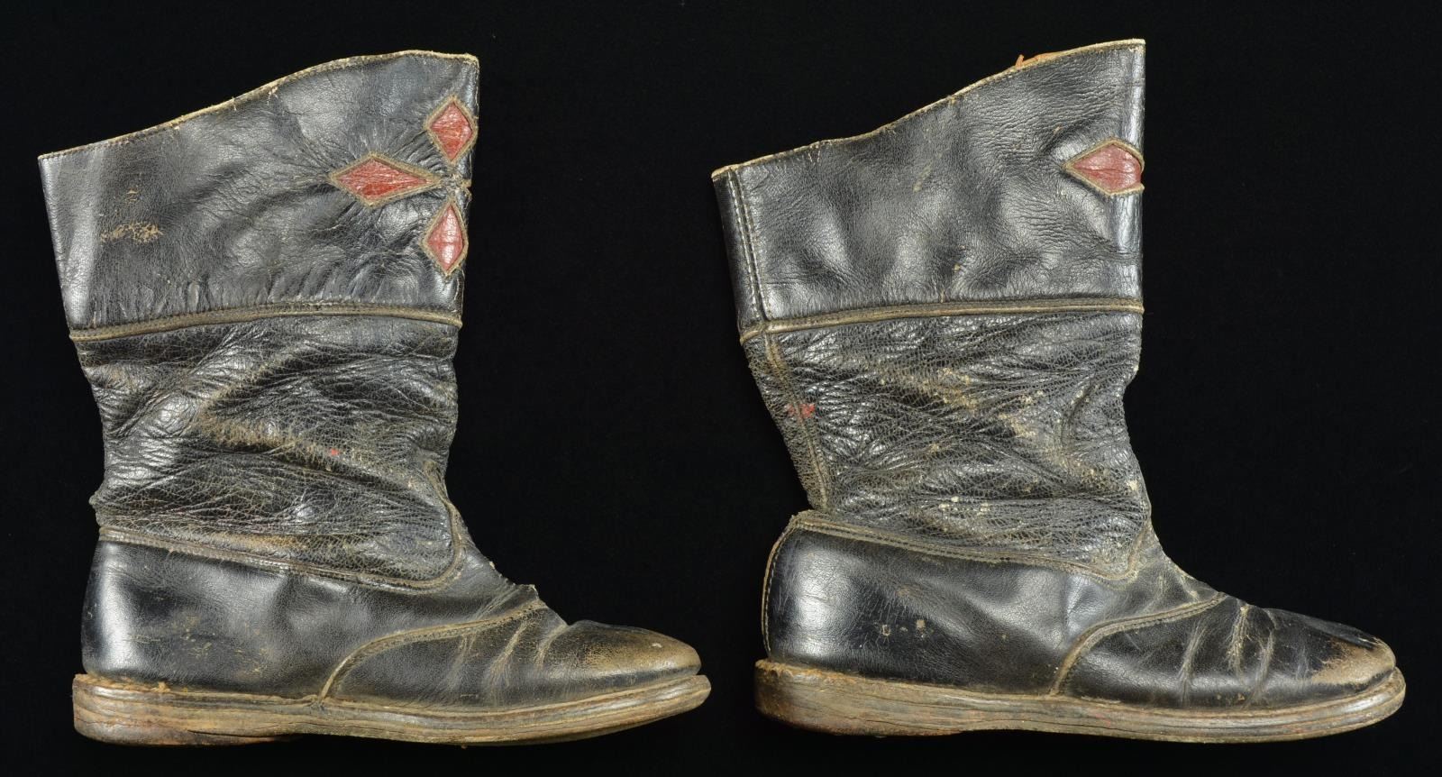 6" Long, 6 1/2" high black leather boots have supple leather midsection. 2" Top cuff has cutouts at front w/ red leather laid underneath. Interior lining on tops are stamped “460UM35366”. CONDITION: fair to good, boots have been worn for a considerable time w/ black finish rubbed through on toes & considerable wear to tacked on leather heals. (02-17694/MGM). $25-40.