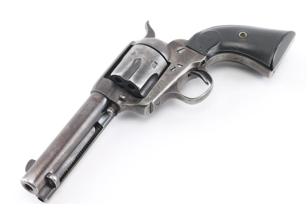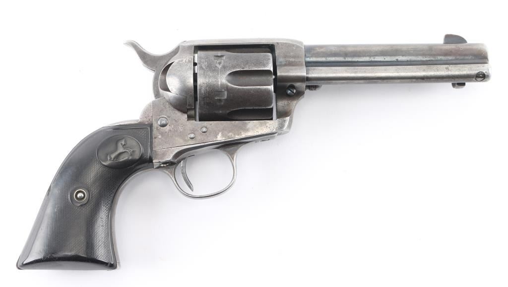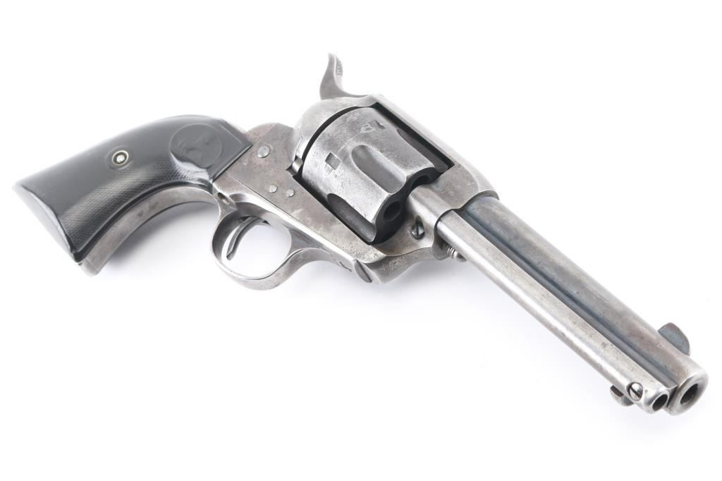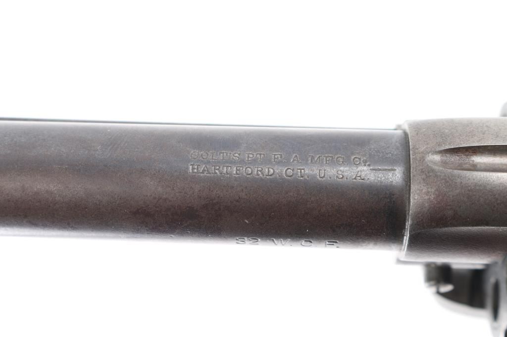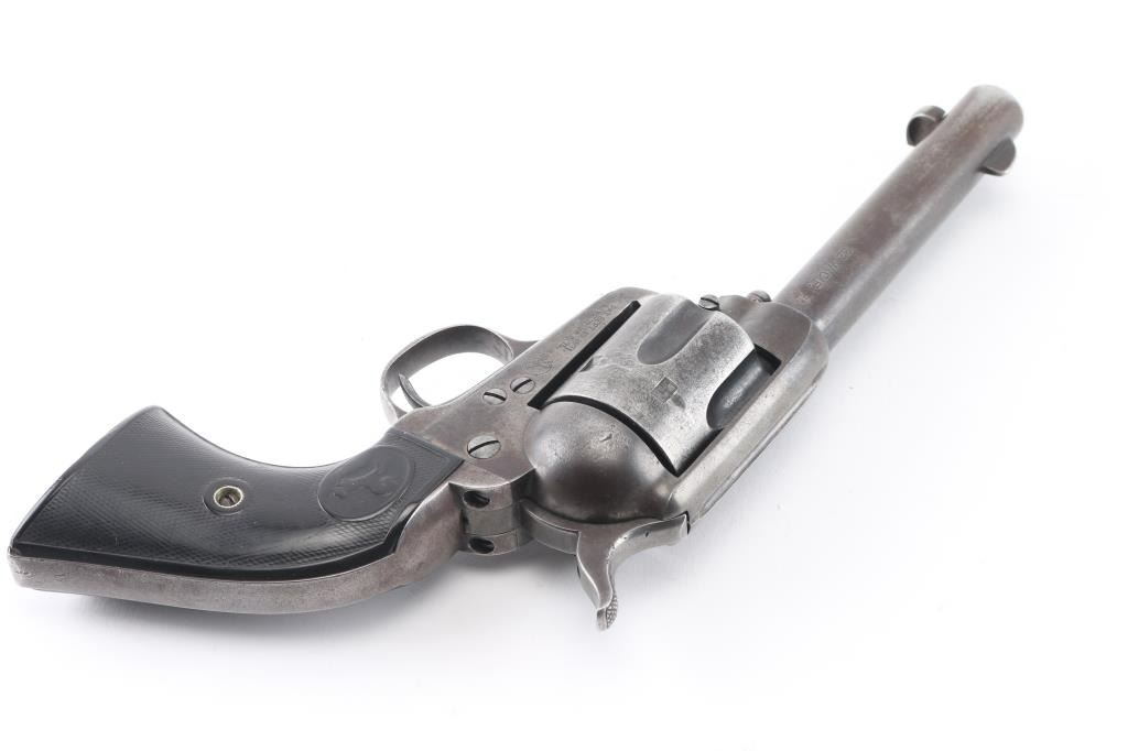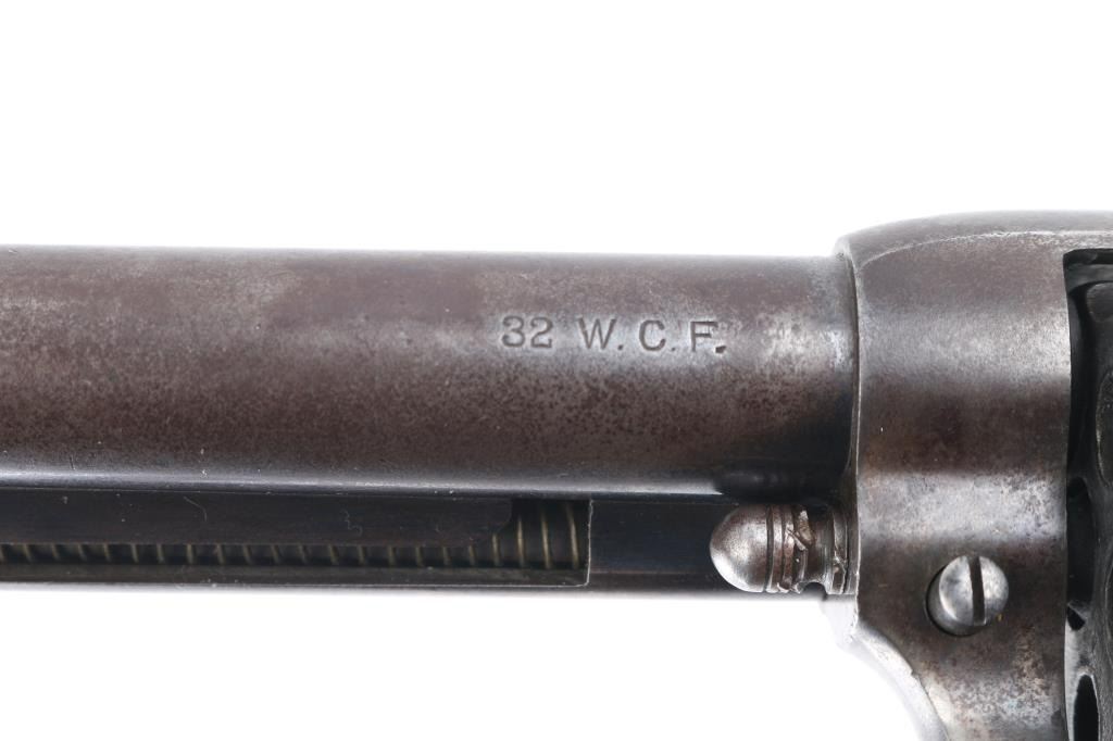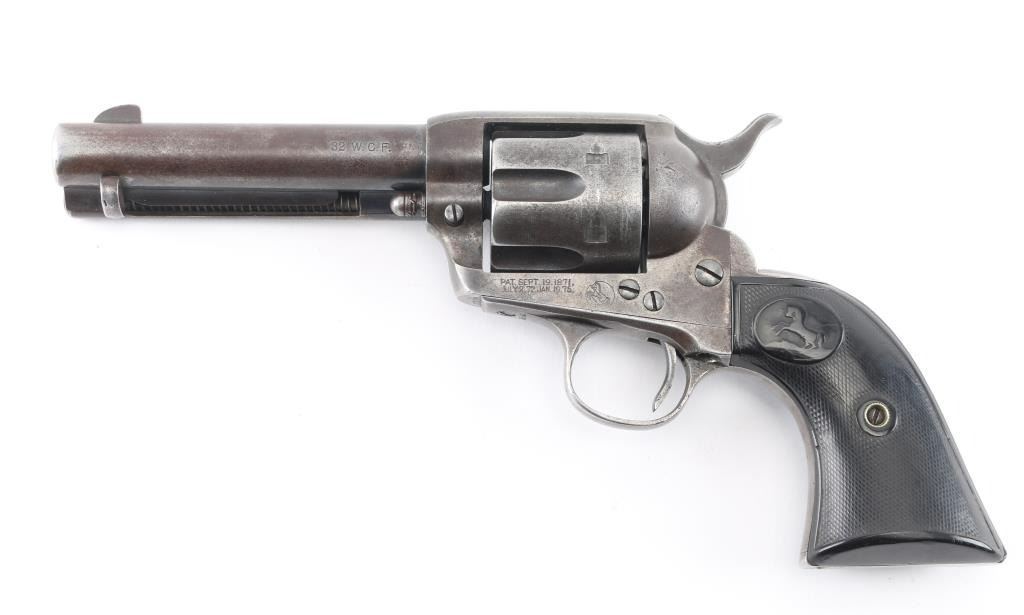 Revolver, single-action. 6-rd capacity. The classic American Colt SAA 1st Generation smokeless chambered in .32 W.C.F. (32-20). Blued metal finish, with black, hard rubber checkered grips with Rampant Colt. 4 3/4" barrel, with open iron sights. V-notched frame. 2 line Colt address on top of barrel. Caliber on left side of barrel. 'VP' proof on left triggerguard. Patent dates, and rampant Colt on left frame. Serial numbers match on frame, triggerguard, and backstrap. Numbers, and markings are clear. Assembly number is clear on the loading gate. (1706) Manufactured in 1906. Cylinder chambers appear excellent. Bore appears excellent/bright with strong rifling. Blued finish is about 20%, with some blue remaining on the barrel, triggerguard, and ejector housing. The rest has turned to a dull gray/brown patina. Correct ejector, and cylinder pin for this model. Grips are good, somewhat worn. Action is crisp/tight. NRA Condition-Good. C&R Firearm.