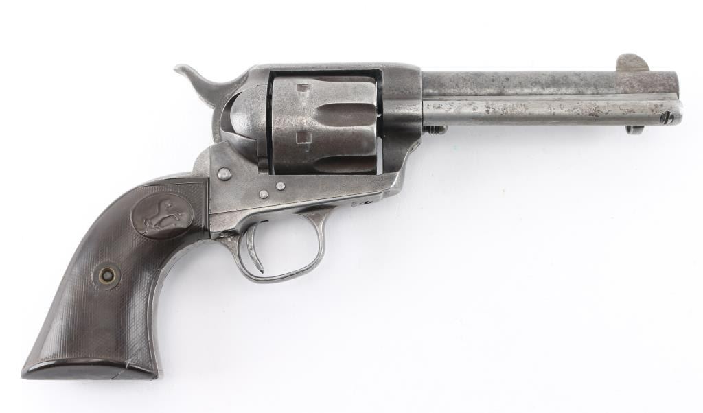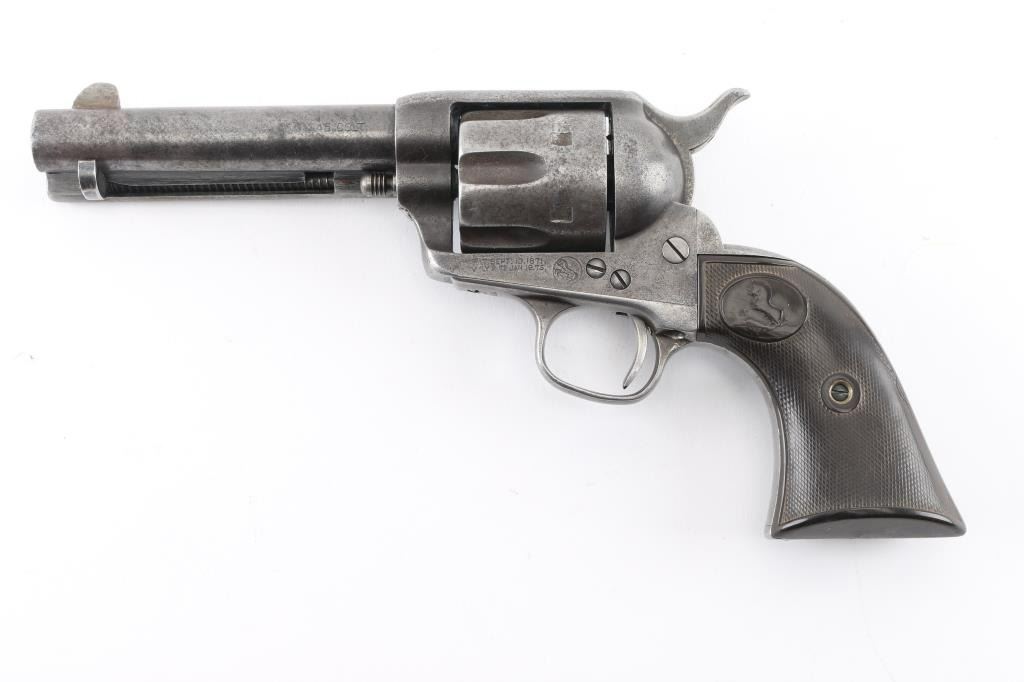 Revolver. Single-Action. 6-rd capacity. 1st Generation manufactured 1892. 4 3/4" barrel with front blade and v-notch rear sights. Top of barrel stamped "COLT'S PT.F.A.MFG. CO HARTFORD CT. U.S.A." Patent dates are visible on the left frame, along with the 'Rampant Colt'. "45 Colt" stamped on left barrel. The serial number matches on the frame, triggerguard, and backstrap, assembly number '571' on the loading gate, all marking are clear. There is no finish left, and the revolver has turned a gray patina, with light scattered pin-prick pitting The cylinder pin screw may be a later replacement. Bore is good with strong rifling, but small traces of pitting are present. Cylinders appears good. Action is crisp, and hammer locks up tight. The grips are good with handling wear to the Rampant Colt, and checkering. The right grip panel has a crack at the bottom. A early, well used, but not abused SAA. NRA condition Very Good Antique Firearm