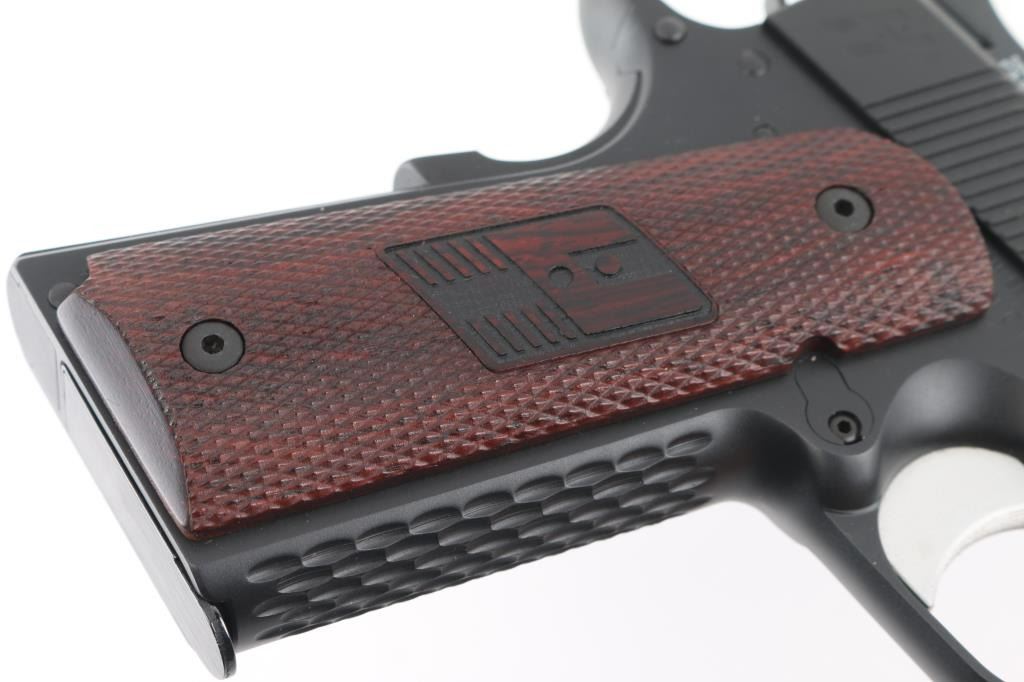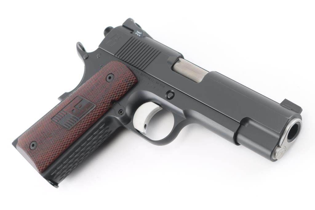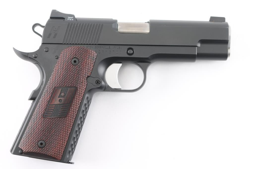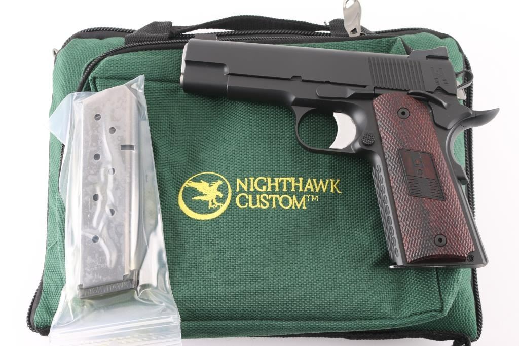 SN: NCP15700 Premium custom built 1911 type pistol. Features Commander length 4.25" barrel, dovetail mounted tritium white dot front sight, dovetail mounted rear sight with single tritium dot, extended thumb safety, upswept beavertail safety with memory bump, skeletonized hammer, adjustable over travel stop trigger, dimpled front strap & mainspring housing, monogram bushing, matte black finish, checkered Heinie logo wood grips. Overall like new condition, with few handling marks. Night sight inserts retain dim glow. Includes original paperwork, two Nighthawk marked magazines, several bushing wrenches, logo marked carry case. Condition is NRA Excellent - like new *** Modern Firearm ***
