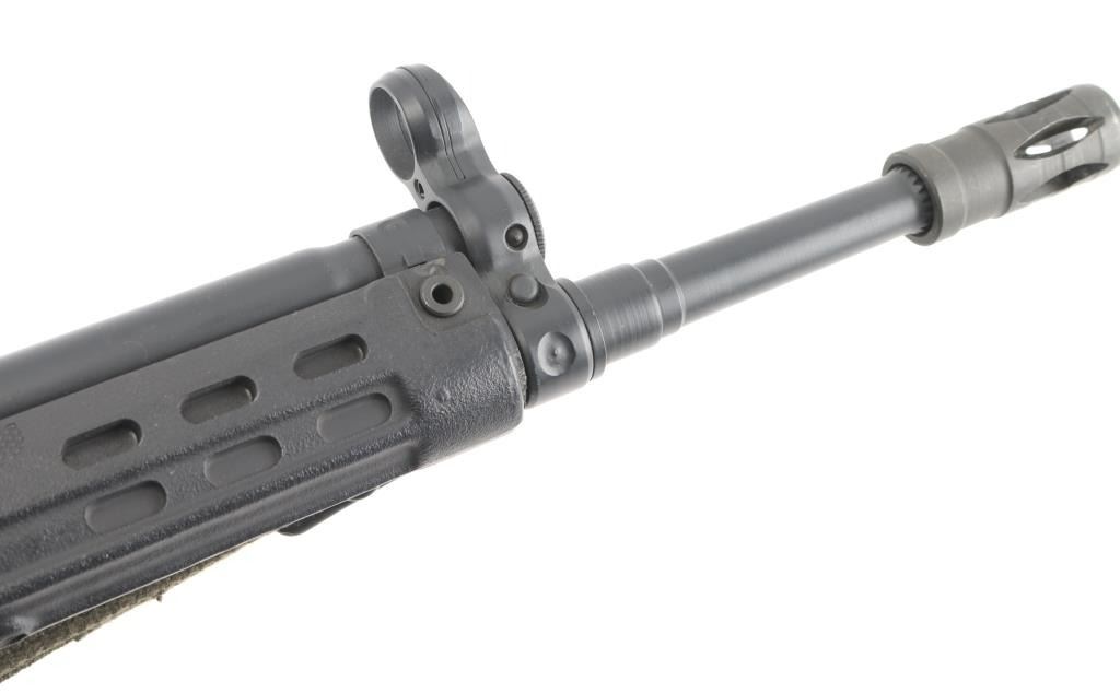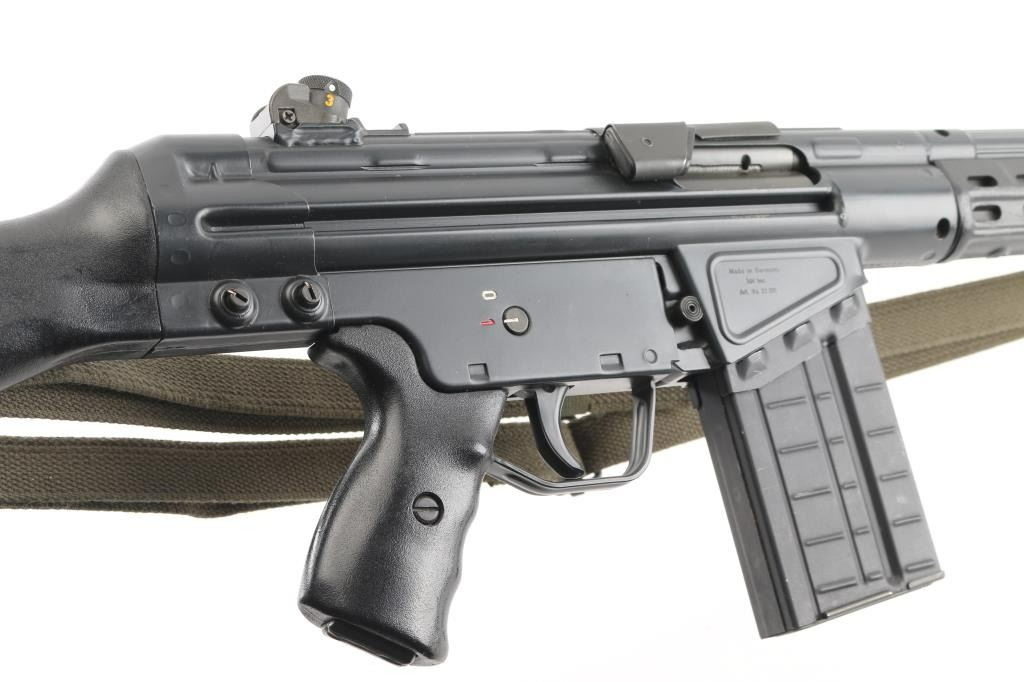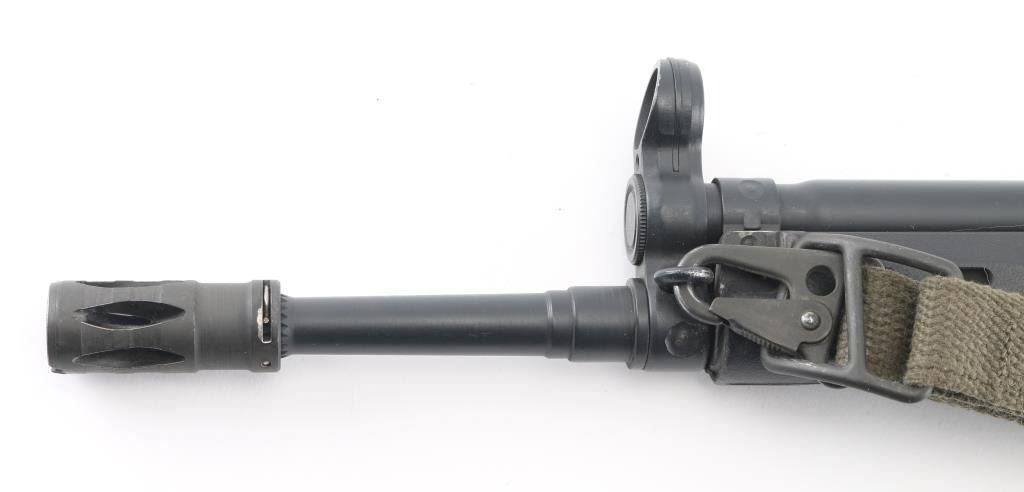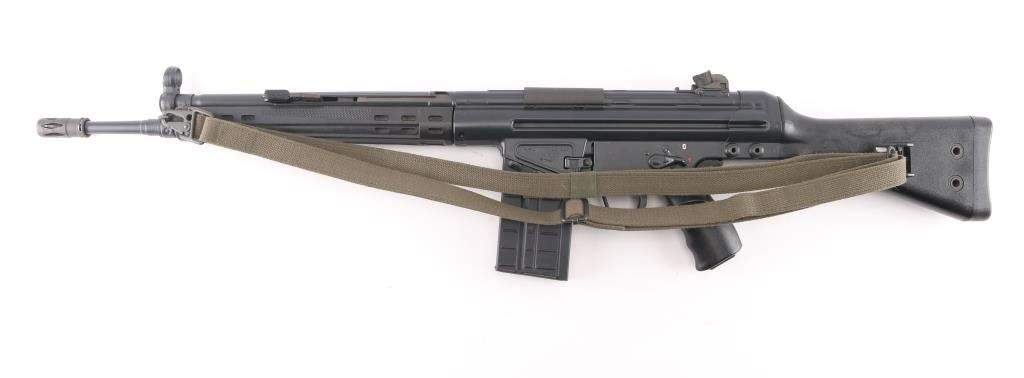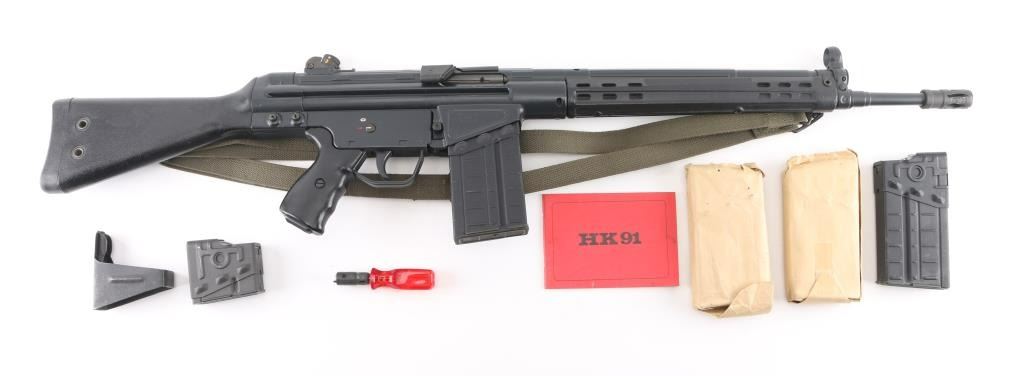 German semiautomatic rifle chambered in 308 Winchester, imported by HK Inc, Arlington VA. Manufactured circa 1981. Features a dark grey/black finish, black polymer furniture, globe post front sight, turret type adjustable rear sight, manual safety, threaded muzzle with flash suppressor, 17.7" barrel. Has the narrow forearm. Bore is excellent/bright. Finish is 97% with some scratching and bare metal at sharp edges, especially at magazine well and around ejection port. Flash hider is a dark gray color, a bit lighter colored than other metal parts. Plastic furniture is very good to excellent condition with minor handling marks. Includes green cotton web sling and (1) good condition high quality (marked HJ) aluminum 5 round magazine. Included are four 20 rd HK magazine, two still in the paper wrappings, manual, mag loader, and take-down tool. Condition is NRA Excellent Modern Firearm.