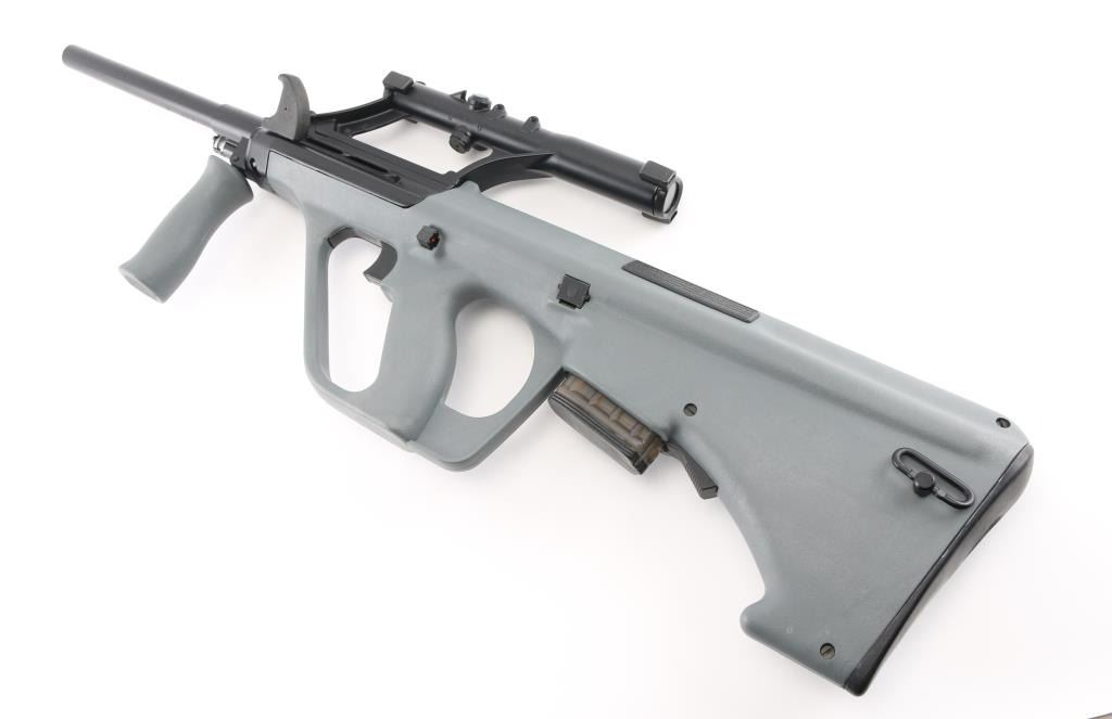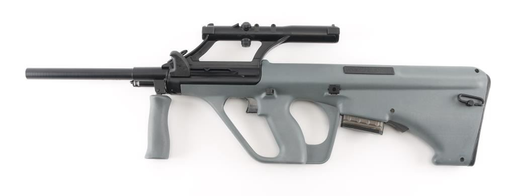 Austrian semiautomatic rifle imported by Gun South, Trussville AL. Barrel stamped 223. Features bullpup layout, gray polymer furniture, quick detachable 16" barrel with plain unthreaded muzzle, folding forward grip, integrated 1.5x optical sight with circle reticle and rudimentary back up iron sights molded into tube, manual safety, storage in butt, sling swivels. Bore is very good condition, appears hard chrome lined. Retains 95% finish on metal surfaces, with handling marks. Stock is very good condition. Includes (1) magazine (9 rd). Condition is NRA Excellent *** Modern Firearm ***