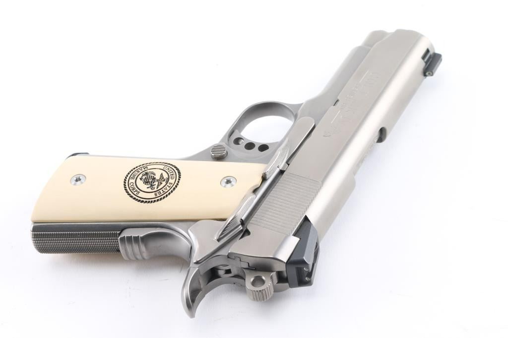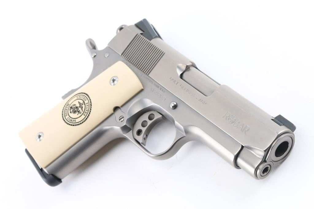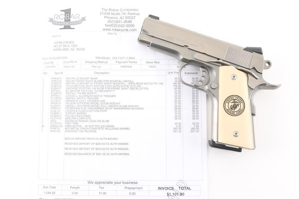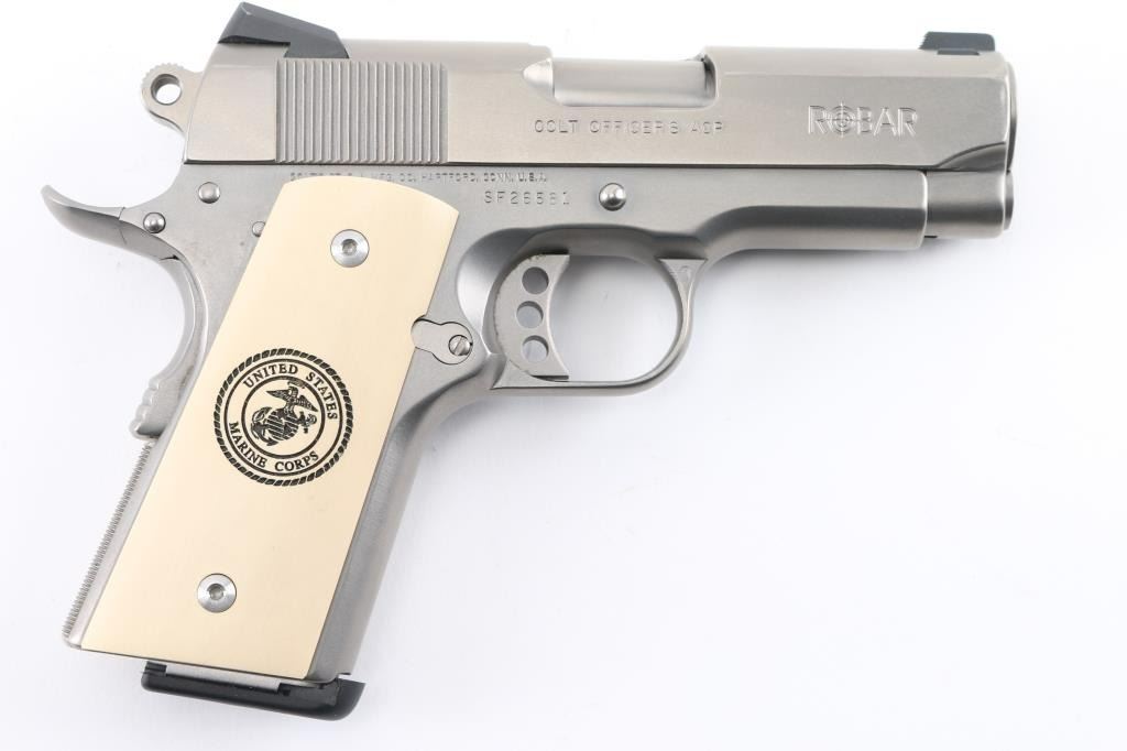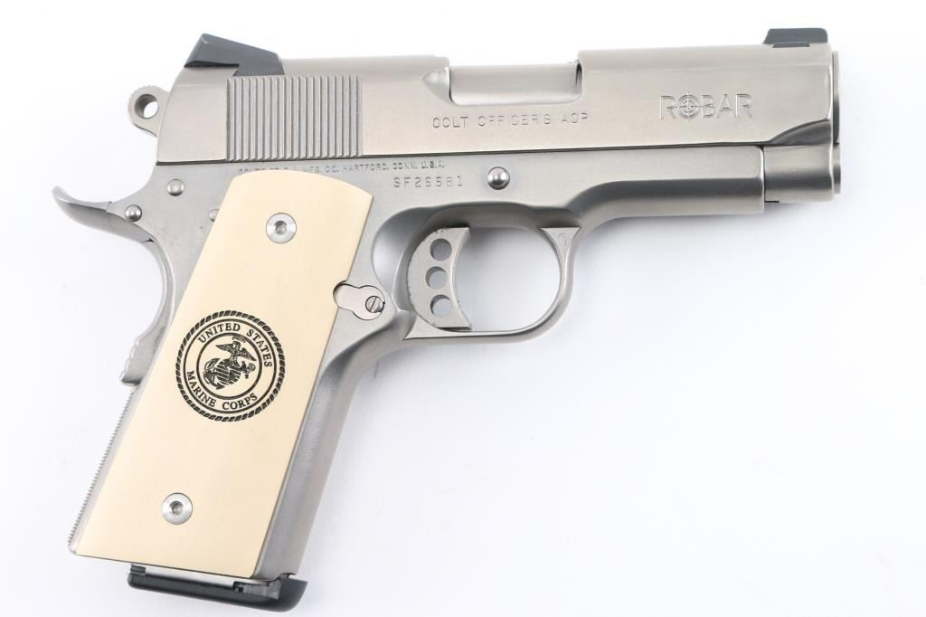 "ROBAR" marked slide, customized Mark IV Series 80 semiautomatic pistol. Extensive custom modifications detailed on included invoice. Features 3-5/8" barrel, Robar NP3 coating (including barrel), Novak Lo-Mount three dot night sights in dovetails, Ed Brown tactical thumb safety & memory groove beavertail grip safety, Casuell match trigger (and trigger job), full length recoil spring guide rod, Ed Brown 30 lpi checkered flat mainspring housing, lowered & flared ejection port, polished feed ramp & throated barrel, complete de-burr. Faux ivory polymer grips with USMC logos have been installed. Included Wilson Combat magazine does not lock slide open on empty mag. Overall condition is like new, as customized. Night sights retain dim glow. Invoiced cost of custom work is over $1200, circa 2006, not counting original purchase price for the pistol. Includes the original factory cardboard box. Condition is NRA Excellent as Customized *** Modern Firearm ***