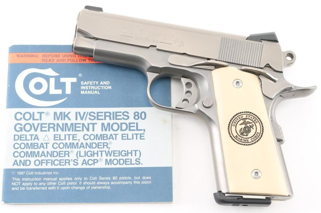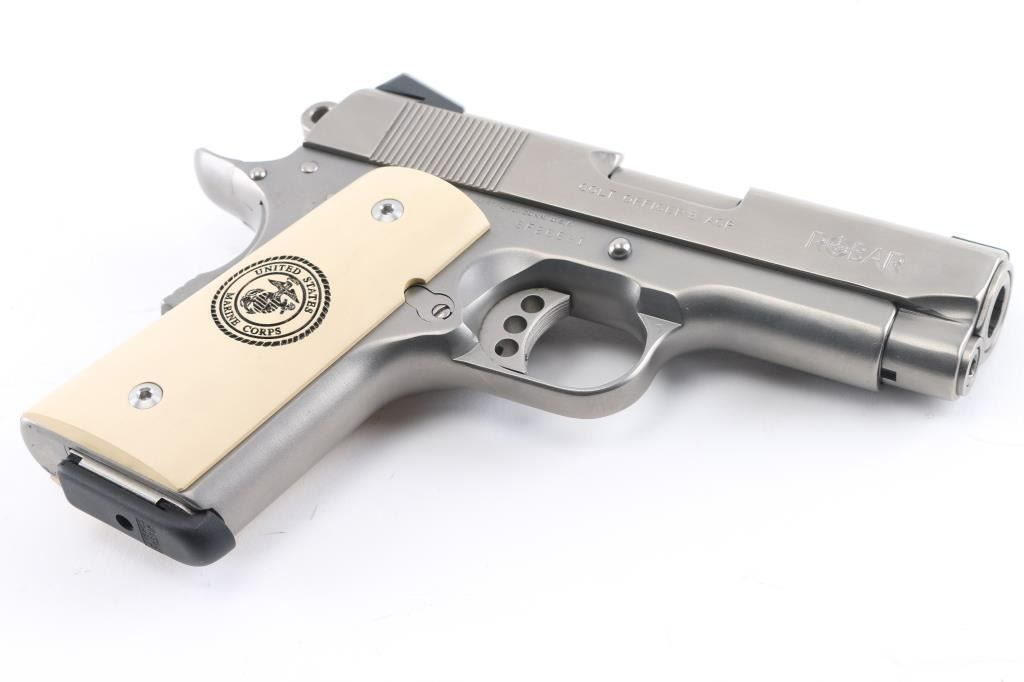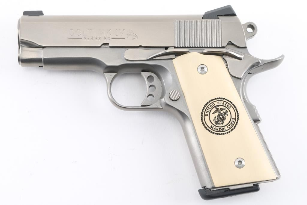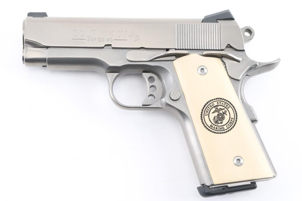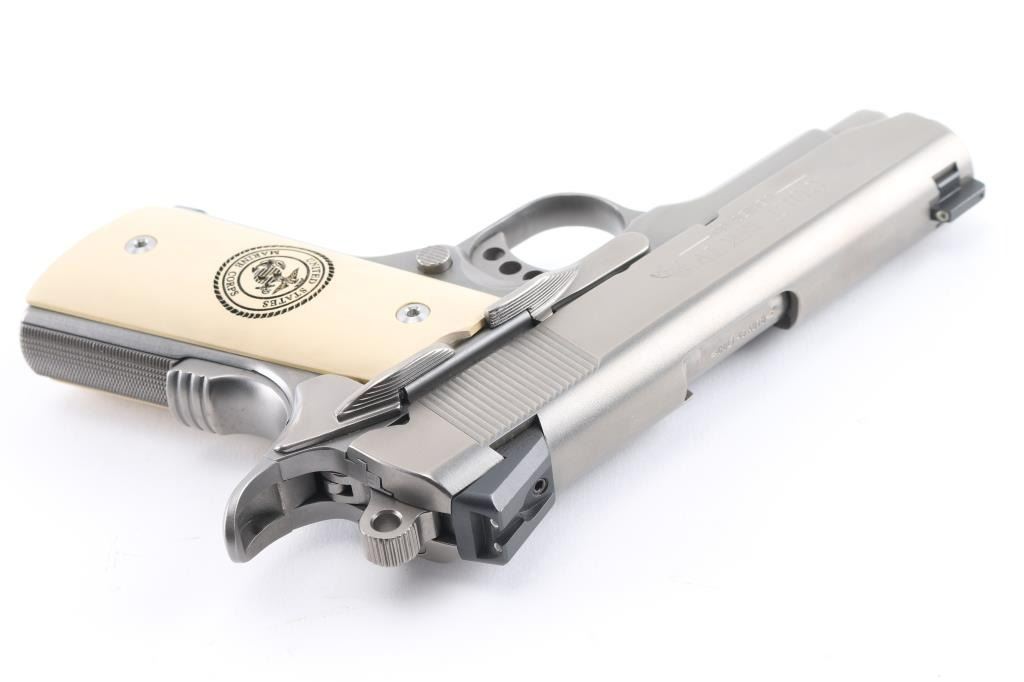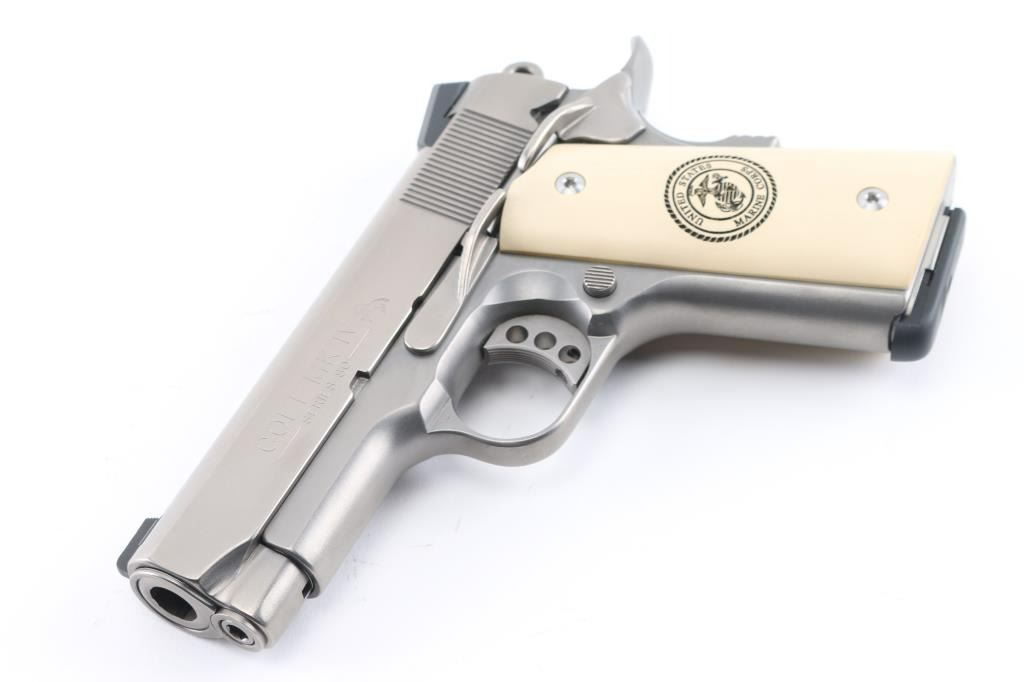 "ROBAR" marked slide, customized Mark IV Series 80 semiautomatic pistol. Extensive custom modifications detailed on included invoice. Features 3-5/8" barrel, Robar NP3 coating (including barrel), Novak Lo-Mount three dot night sights in dovetails, Ed Brown tactical thumb safety & memory groove beavertail grip safety, Casuell match trigger (and trigger job), full length recoil spring guide rod, Ed Brown 30 lpi checkered flat mainspring housing, lowered & flared ejection port, polished feed ramp & throated barrel, complete de-burr. Faux ivory polymer grips with USMC logos have been installed. Included Wilson Combat magazine does not lock slide open on empty mag. Overall condition is like new, as customized. Night sights retain dim glow. Invoiced cost of custom work is over $1200, circa 2006, not counting original purchase price for the pistol. Includes the original factory cardboard box. Condition is NRA Excellent as Customized *** Modern Firearm ***