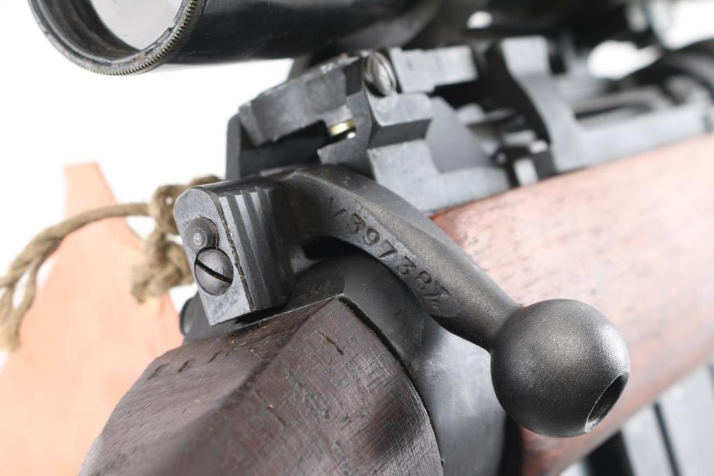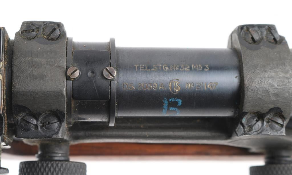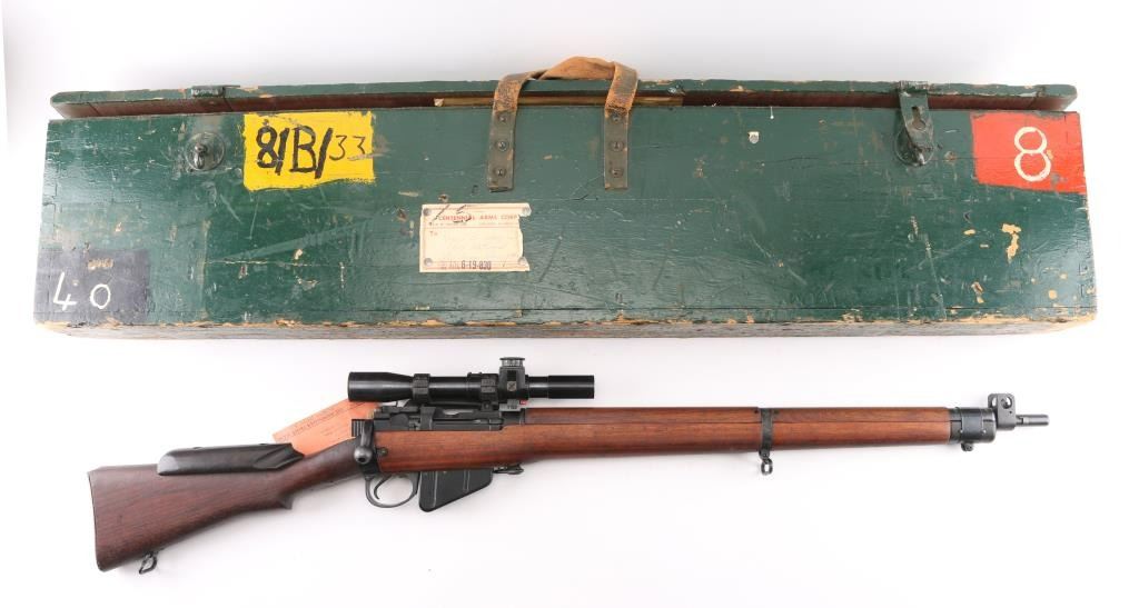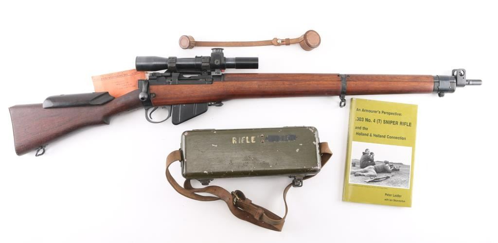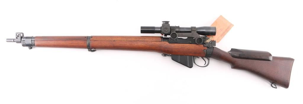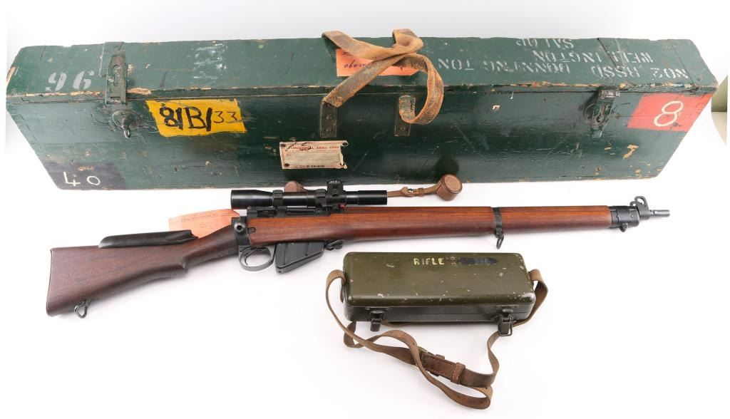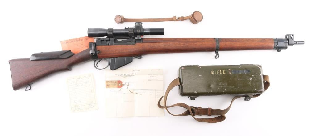 SN: V39738. WW2 British 1945 dated bolt action sniper rifle with No. 32 Mk I scope and mount. Used from WW2 into the early 1960's until they were replaced by the L42 series sniper rifles. The left butt-socket is marked 'm47 C 1945 V39738TR England', the left receiver side wall is marked 'T'. The sniper scope is marked 'Tel. Stg. No.32 Mk3OS. 2039 A. CTS No. 21147' There is a "B' stenciled in blue paint beneath this. The scope has the standard British post and cross hair reticle pattern, and the brown leather lens cover. The mount is marked 'P 33160" and the rings are stamped '112' and '113' respectively. The underside of the buttstock is stamped with the standard makers mark of 'S 51', with proofs and acceptance marks. The top flat of the wrist is stamped '28184'. The underside of the forestock is stamped with matching serial number 39738 with various proofs and Broad Arrow. Matching serial number on the bolt handle. The comb is fitted with a wood cheekpiece secured with two wood screws. 10 rd magazine, brass buttplate. Birmingham proof house tag attached to rifle. Absolutely correct, rifles came to Holland & Holland after giving better than average zeroing groups after test firing at the B.S.A and Maltby factories, then earmarked as possible sniper rifles by having the 'TR' stamp. Once it passed the final test it was stamped with the 'T', and the "S51", Holland & Holland's wartime code.. The bore is excellent/.bright, action is crisp/tight, the matte black/blue finish is excellent, and the wood is near excellent with a few very minor dings, the buttstock is a little darker than the rest. Comes with the No.15 Mk I green painted wood transit chest with intact leather carrying straps, labels, metal No. 8 Mk I scope case with label, carrying strap. Also included is a book on these rifles. Consignor bought this rifle from Centennial Arms Corp , Chicago on 9-1-1967 for $77.75, and has been in his possession ever since. (Bill included) NEA Condition-Very Good++ C&R Firearm.