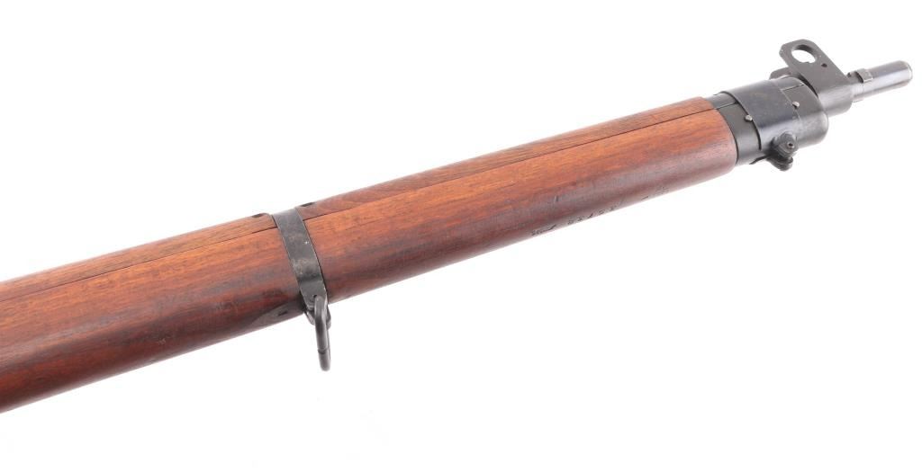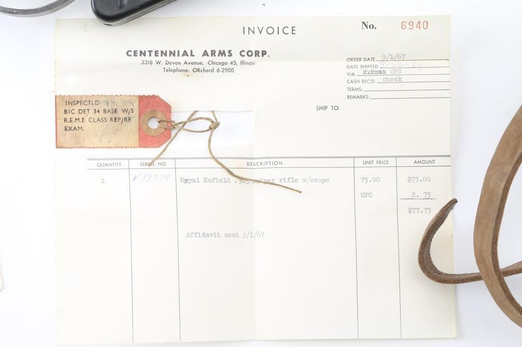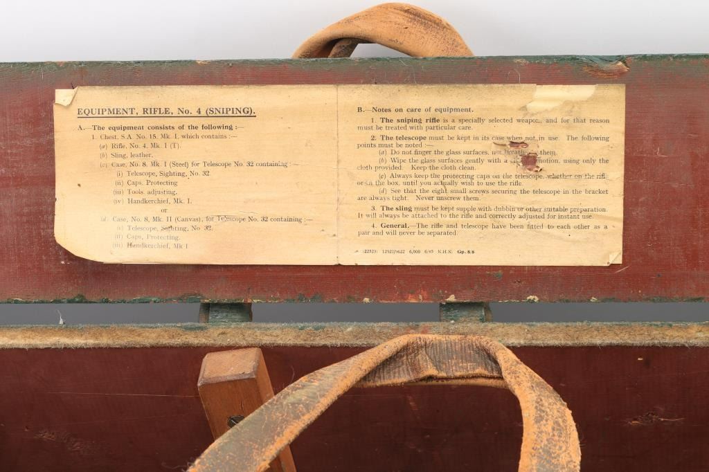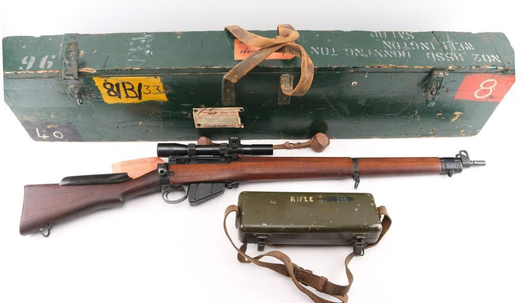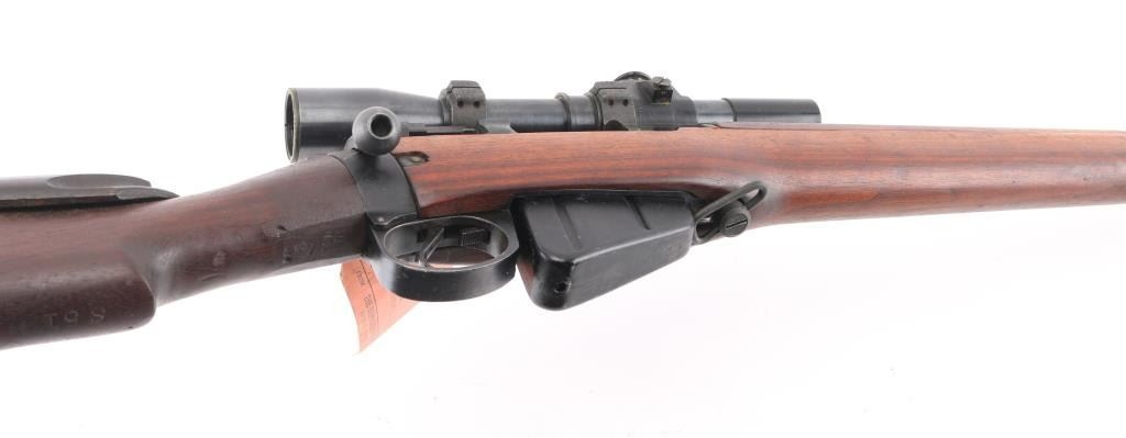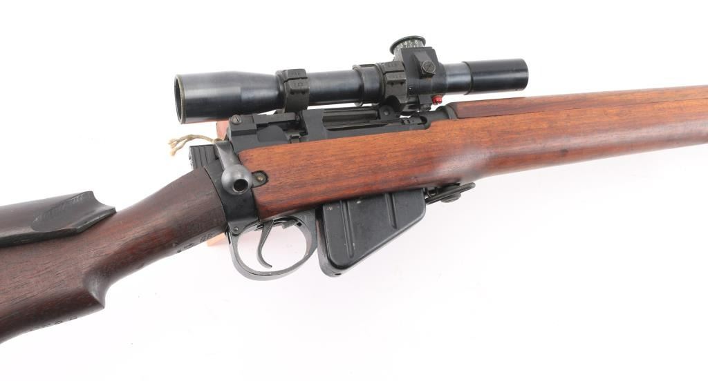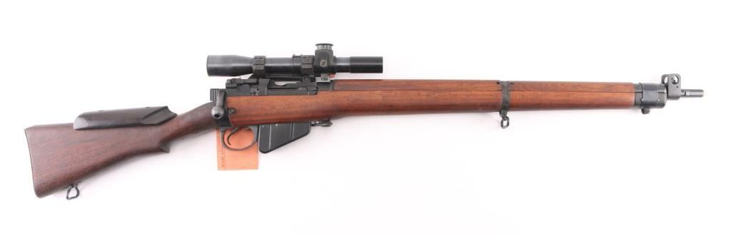 SN: V39738. WW2 British 1945 dated bolt action sniper rifle with No. 32 Mk I scope and mount. Used from WW2 into the early 1960's until they were replaced by the L42 series sniper rifles. The left butt-socket is marked 'm47 C 1945 V39738TR England', the left receiver side wall is marked 'T'. The sniper scope is marked 'Tel. Stg. No.32 Mk3OS. 2039 A. CTS No. 21147' There is a "B' stenciled in blue paint beneath this. The scope has the standard British post and cross hair reticle pattern, and the brown leather lens cover. The mount is marked 'P 33160" and the rings are stamped '112' and '113' respectively. The underside of the buttstock is stamped with the standard makers mark of 'S 51', with proofs and acceptance marks. The top flat of the wrist is stamped '28184'. The underside of the forestock is stamped with matching serial number 39738 with various proofs and Broad Arrow. Matching serial number on the bolt handle. The comb is fitted with a wood cheekpiece secured with two wood screws. 10 rd magazine, brass buttplate. Birmingham proof house tag attached to rifle. Absolutely correct, rifles came to Holland & Holland after giving better than average zeroing groups after test firing at the B.S.A and Maltby factories, then earmarked as possible sniper rifles by having the 'TR' stamp. Once it passed the final test it was stamped with the 'T', and the "S51", Holland & Holland's wartime code.. The bore is excellent/.bright, action is crisp/tight, the matte black/blue finish is excellent, and the wood is near excellent with a few very minor dings, the buttstock is a little darker than the rest. Comes with the No.15 Mk I green painted wood transit chest with intact leather carrying straps, labels, metal No. 8 Mk I scope case with label, carrying strap. Also included is a book on these rifles. Consignor bought this rifle from Centennial Arms Corp , Chicago on 9-1-1967 for $77.75, and has been in his possession ever since. (Bill included) NEA Condition-Very Good++ C&R Firearm.