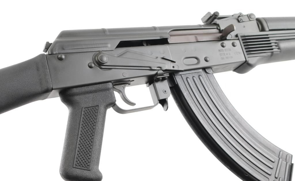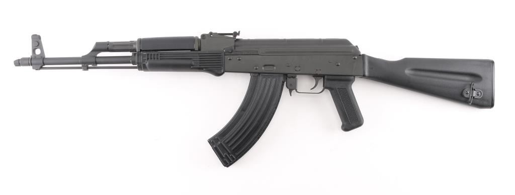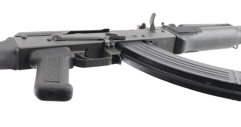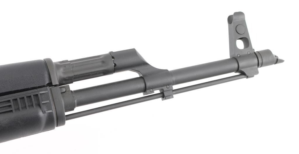 US made AKM/AK47 Kalashnikov type rifle assembled by Vector Arms, using a surplus parts kit and a US made receiver & furniture (possibly other parts). Front trunnion is Polish made, "(Circle) 11" marked; other numbered parts have matching numbers to the trunnion. Features matte black finish, black polymer shoulder stock with steel trap door buttplate, stamped receiver, checkered black plastic pistol grip, ribbed black polymer handguards, protected post front & tangent rear sights, ribbed dust cover, manual safety, bayonet lug, cleaning rod, slant muzzle brake. Bore is pristine. Retains 95% finish, with handling marks. Polymer is excellent with few blemishes. Includes (1) 30 rd magazine. Condition is NRA Excellent *** Modern Firearm ***