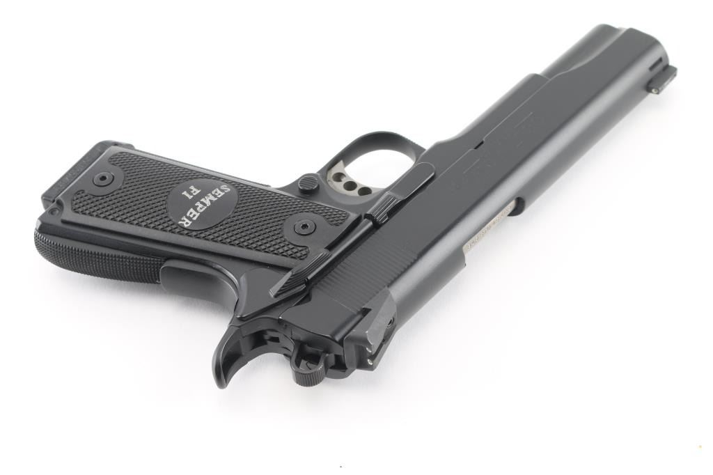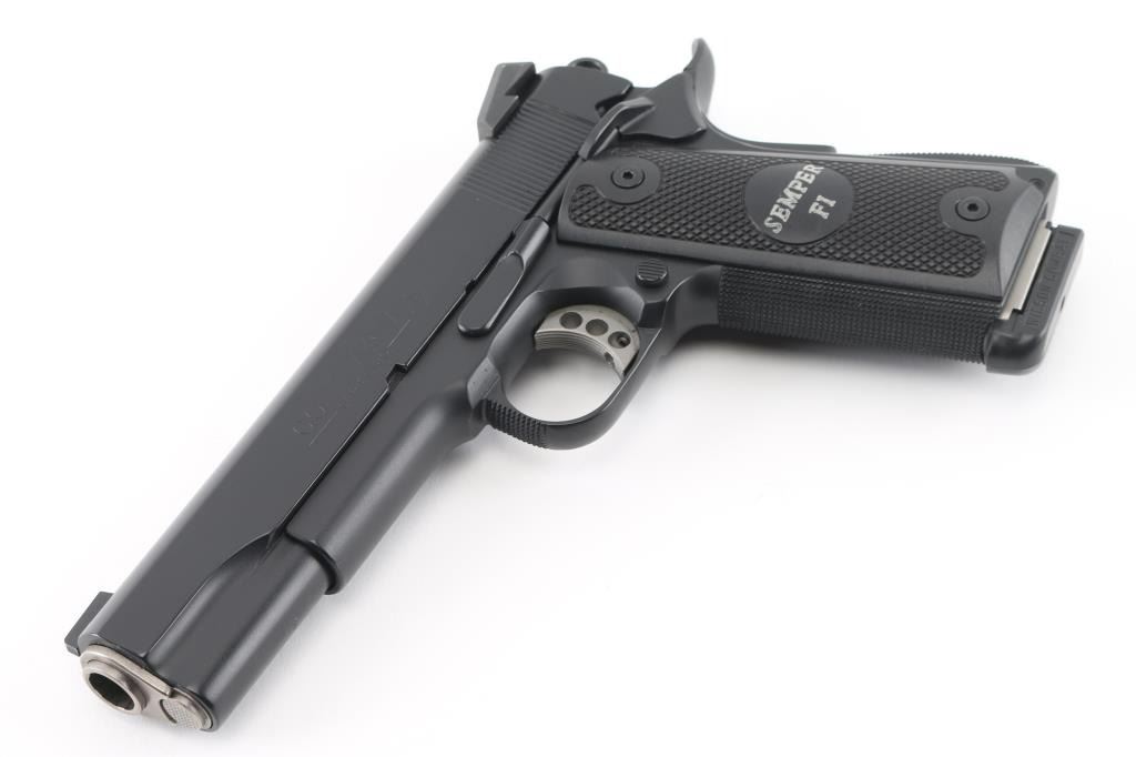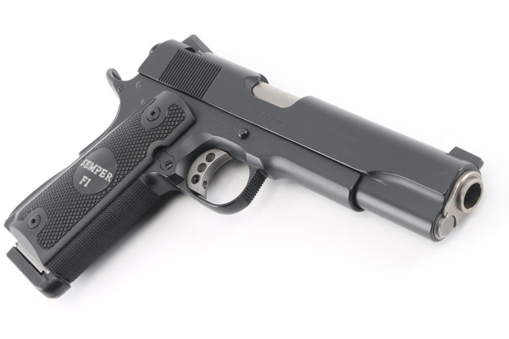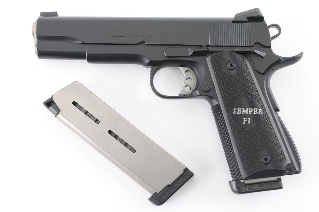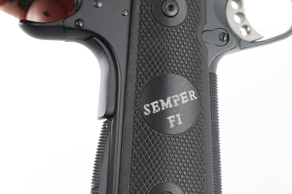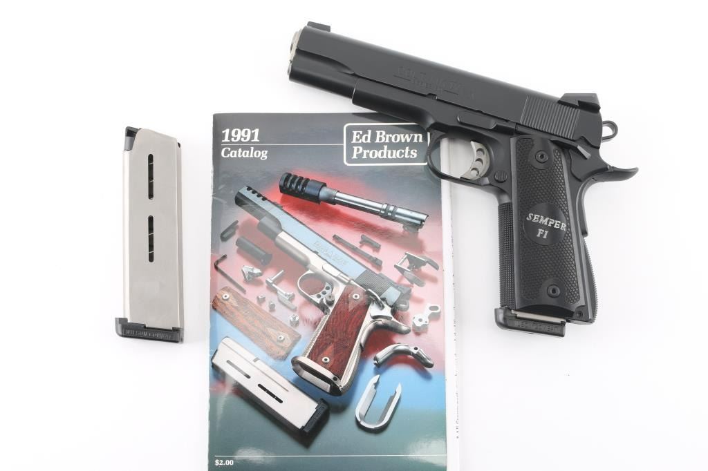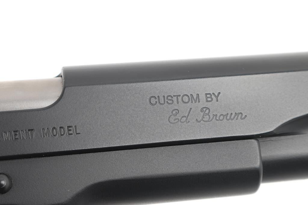 Ed Brown Customized (and marked on slide) Mk IV Series 80 semiautomatic 1911 type pistol, invoices and other papers included. Invoiced features include: Bar-Sto 5" barrel, Novak Lo-Mount 3 dot night sights in dovetails, '700AC' carry package, 20 lpi checkering on front strap & arched mainspring housing, Ed Brown match hammer & sear, upswept beavertail grip safety, De-burr complete gun and re-finish with matte black Roguard, NP3 finish internal parts & barrel, checkered black polymer grips with "SEMPER FI" stenciled into center circle. Also features extended thumb safety, skeletonized trigger with adjustable over travel stop, push button mag release. Night sights retain dim glow. Includes original factory cardboard box, two Wilson Combat magazines and gunsmith paperwork. Rear sight is positioned very far to the left. Condition is NRA Excellent as customized. *** Modern Firearm ***