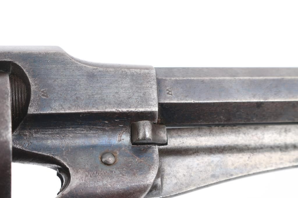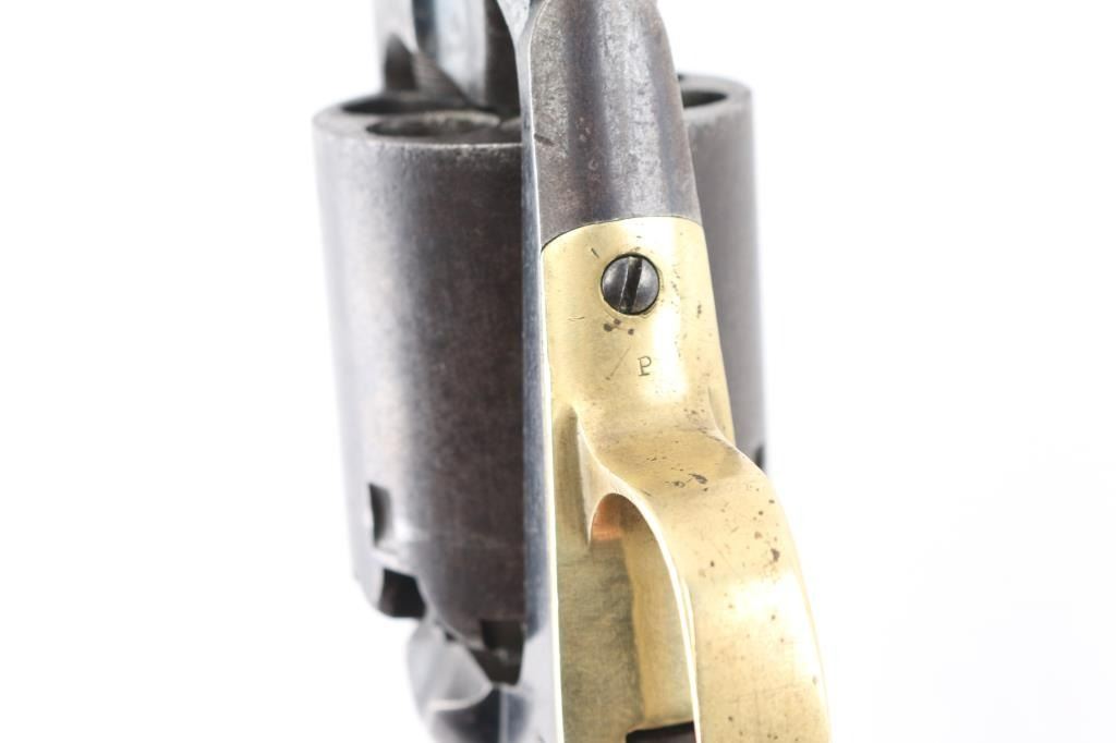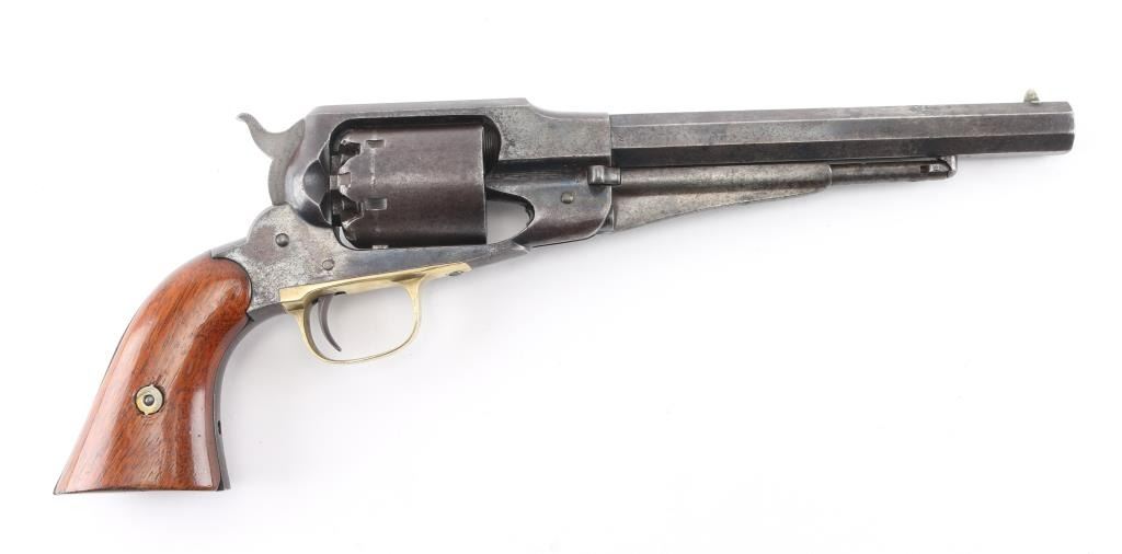 SN: 20192 Antique U.S. Army contract single action percussion revolver chambered for .44 caliber ammunition, circa 1863-1875. Features an 8" octagonal barrel, dovetailed cone front sight, 'v' notched rear sight, loading lever, non-fluted six shot cylinder with safety notches, smooth trigger, knurled low-profile hammer spur, brass trigger guard and two-piece walnut grips. Serial numbers match on the frame, cylinder and barrel. Inspector stamps are found on the loading lever, frame, trigger guard, barrel, cylinder and grips. Revolver exhibits about 30% original blue with the rest turning a gray patina. The patent date on the barrel is very faint. The bore is excellent/bright, nipples appear good, Action is crisp/tight. The grips have faint inspectors cartouches they have been varnished. A really nice conditioned 1858. The serial number puts it in the Civil War time frame. Condition is NRA very good. Antique Firearm.