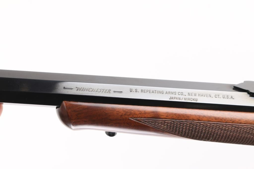 SN: 00016MW85E This is a Miroku Winchester made in Japan. It is a special 1885 Limited Series single shot, falling block rifle chambered for 45-90 and the barrel is marked "Black Powder Only". It has a blued, 34" octagon barrel, dovetailed blade front sight, Buckhorn rear sight, serrated trigger, checkered hammer spur, crescent metal butt plate. Tang is drilled and tapped for a peep sight. Receiver and barrel drilled and tapped for scope base. Very nice wood stocks with checkering at the wrist and forearm which has a schnabel forend. Also has swivel studs installed. Comes with original factory box. Bore looks great, bright. Metal finish looks great. Wood stocks look great with two tiny dings on the left side of the butt stock. Condition is NRA Very Good+