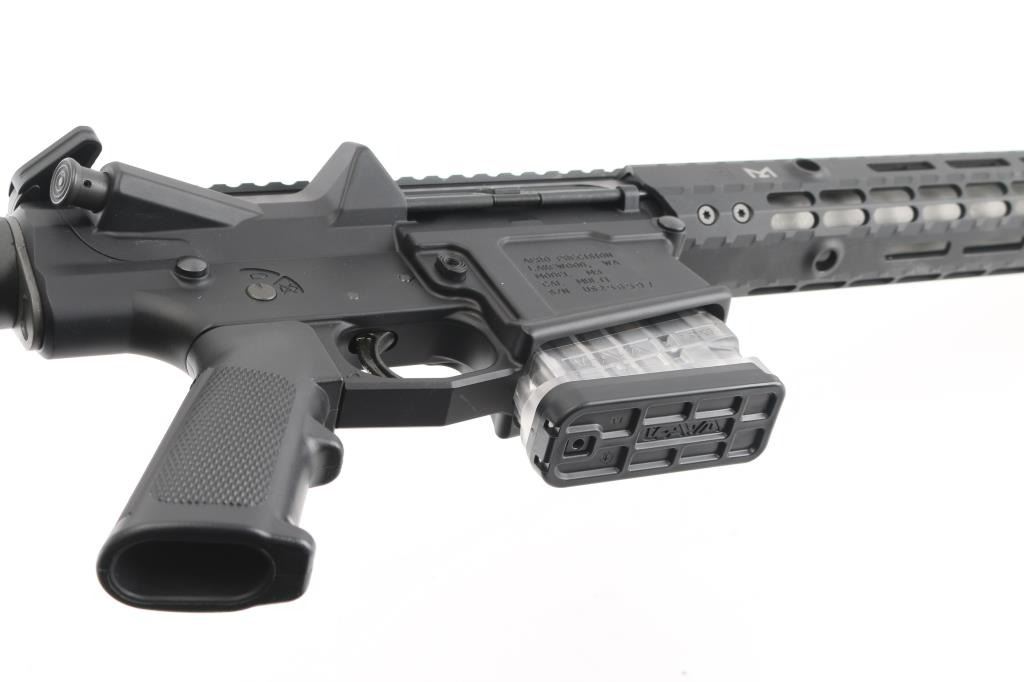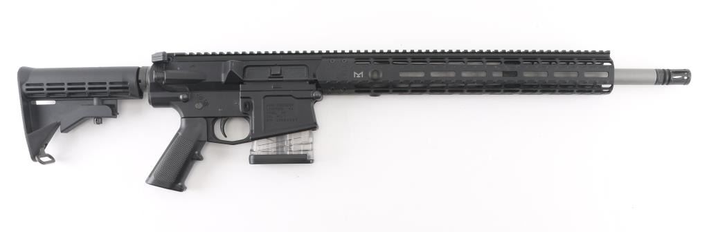 SN: US256597 Quality, direct impingement operated semi-automatic long range rifle chambered in 6.5 Creedmoor. Features a bead blasted 18” 416R stainless steel barrel with 1:8 twist & threaded muzzle, 5/8-24 threaded birdcage flash hider, mid-length gas system, 15” free-floating Enhanced M-LOK compatible aluminum handguard with multiple QD points & continuous top rail, flat-top upper receiver with forward assist, shell deflector & dust cover, Breach ambidextrous charging handle, black nitride finish BCG, mil-spec lower parts kit, manual two-position safety, Lancer L7AWM 10 round magazine, A2 pistol grip and M4 telescoping shoulder stock. Includes the original cardboard boxes for the upper & lower receivers. Also includes a spare 10 round ASC magazine. Rifle retains approximately 99% of its original matte black anodized finish showing minor wear at the 6 o’clock position on the handguard from installation of a bipod and the barrel shows a couple superficial scratches. Action is sound, the bore is pristine and the synthetic stocks are excellent.