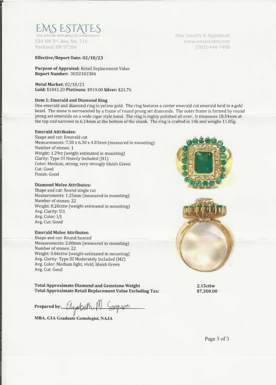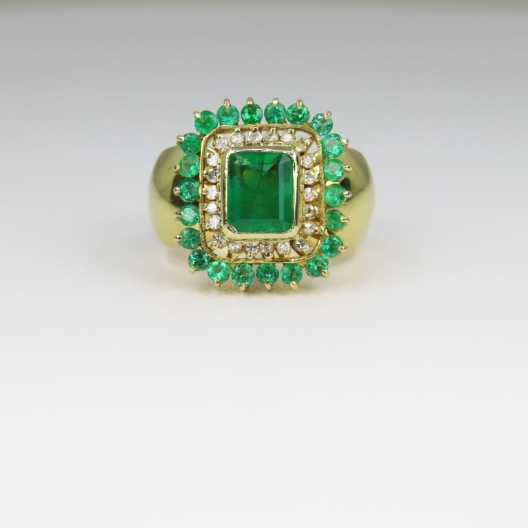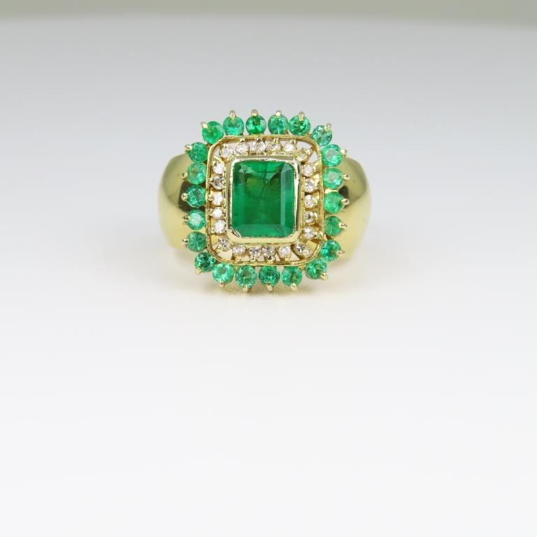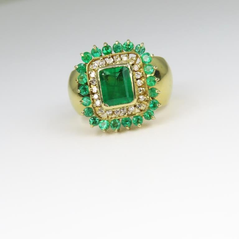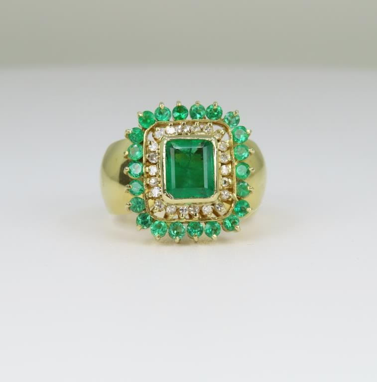 and Diamond Ring featuring a fine Emerald with rich Bluish Green color weighing approx. 1.29 carats framed with 22 vivid green round cut Emeralds weighing approx. 0.66 carats and 22 round cut Diamonds weighing approx. 0.20 carats with I-J colors and SI clarity set in an opulent vintage 14 karat yellow gold setting. Full Retail Appraisal - $7,300.00
