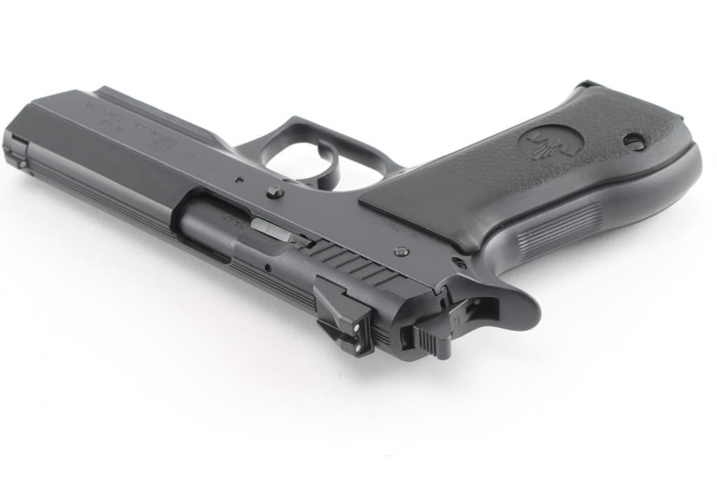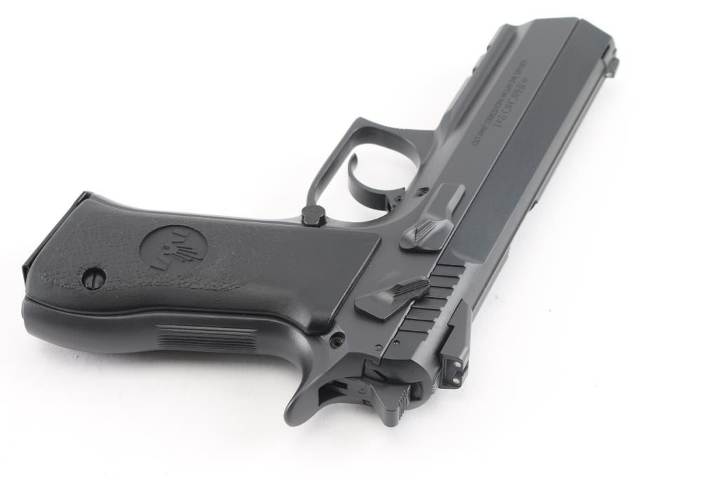 High quality Israeli made CZ 75 pattern double action semi-automatic pistol chambered in 9x19mm. Features a matte black parkerized finish, 4.4” cold hammer forged CrMo V barrel with 1:10 twist, drift adjustable three-dot sights, full-length steel guide rod, smooth curved trigger, serrated hammer spur, thumb safety mounted on the left side of the frame, push button magazine release, factory 16 round magazine, steel frame with serrated grip straps & integral accessory rail, and two-piece textured black composite grips with molded IWI insignias. Includes the original factory hard case with literature, lock and spare magazine. Condition is like NRA Perfect ***Modern Firearm***