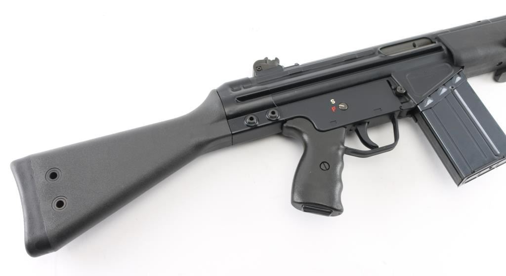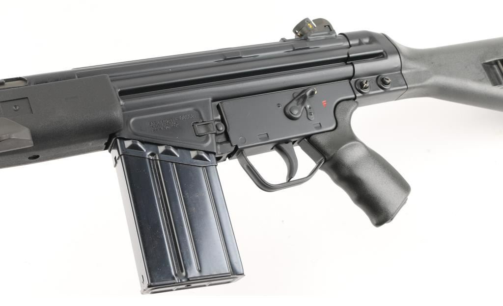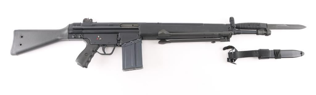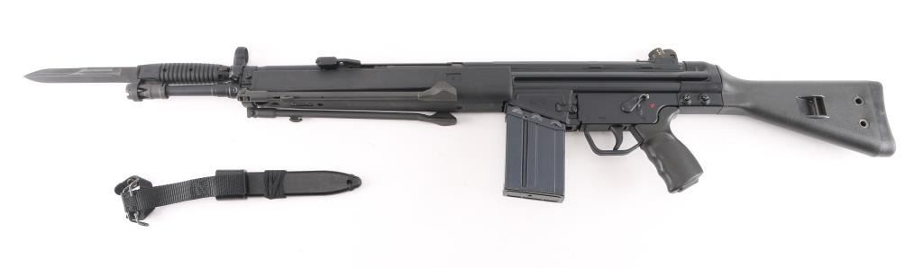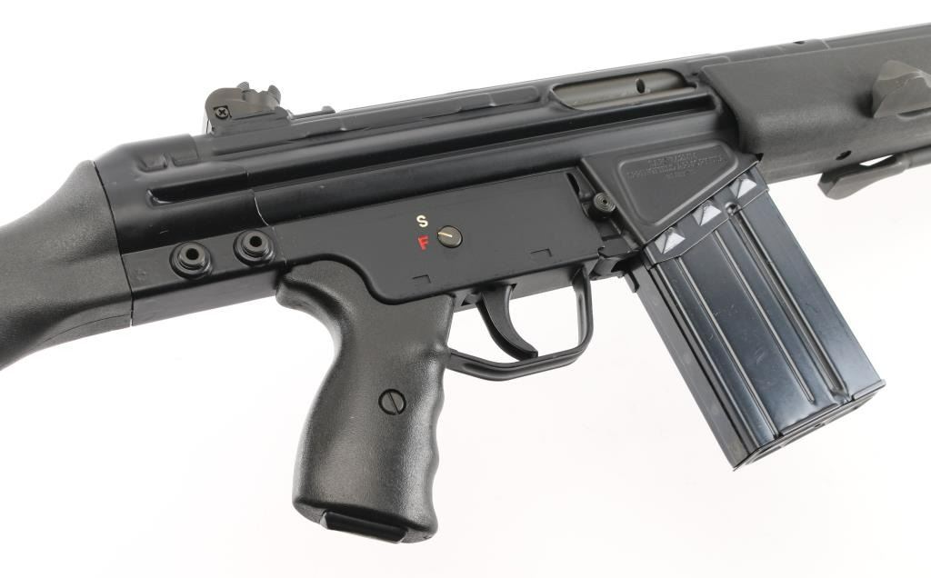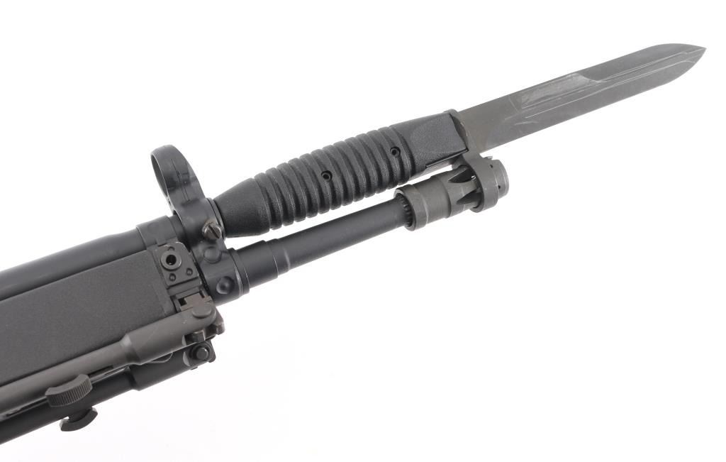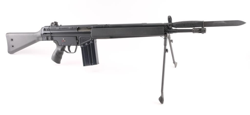 Greek semiautomatic rifle chambered in 7.62mm NATO and imported by Springfield Armory, Geneseo IL. Clone of the HK-91 rifle. Features approx 16" barrel, protected post front & turret adjustable rear sights, flash suppressor, matte black finish on metal parts, black polymer furniture, folding bipod, manual safety, forward sling eye, rear sling bar. Forend missing the sling clip. Bore is very good condition. Retains 95% finish with handling marks. Polymer furniture is pristine. Includes (1) 20 round magazine, bayonet (no scabbard). Condition is NRA Excellent *** Modern Firearm ***