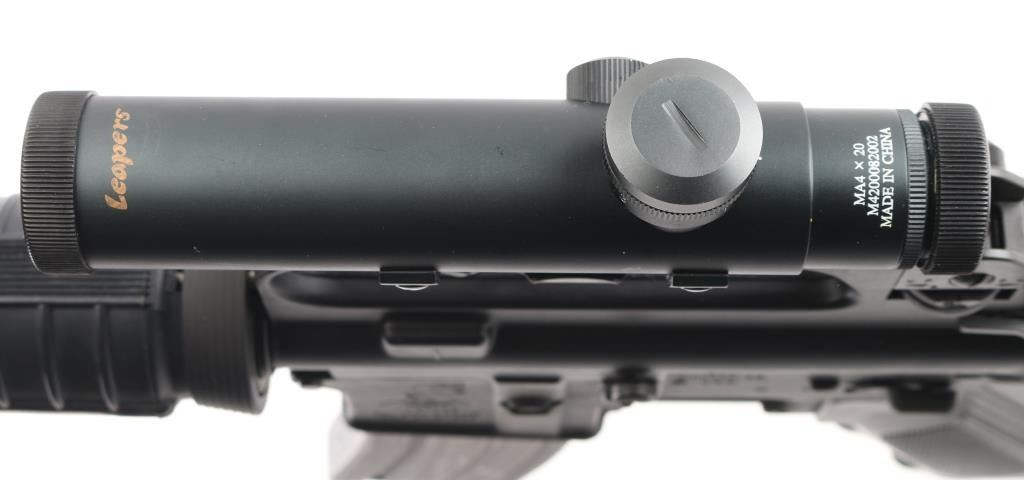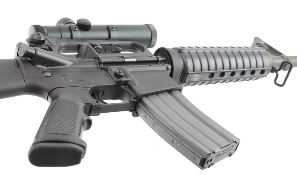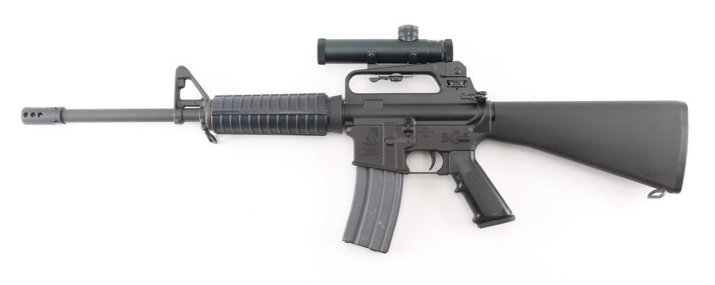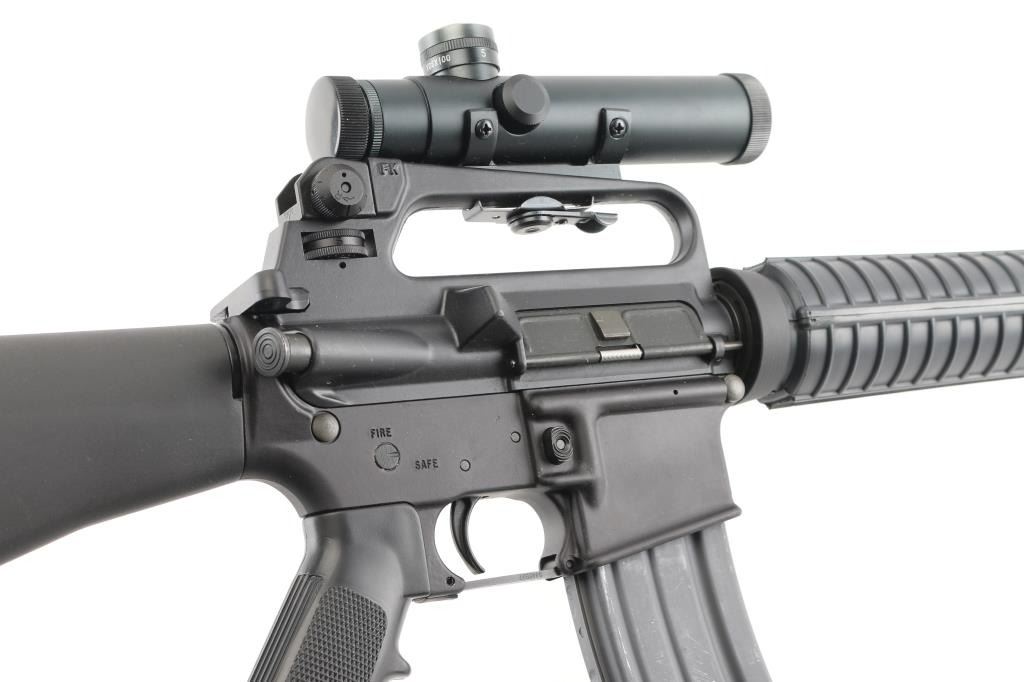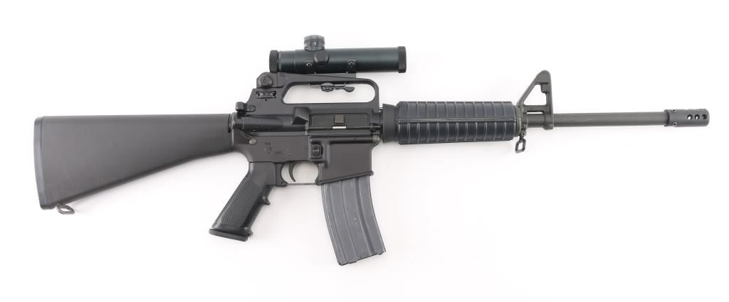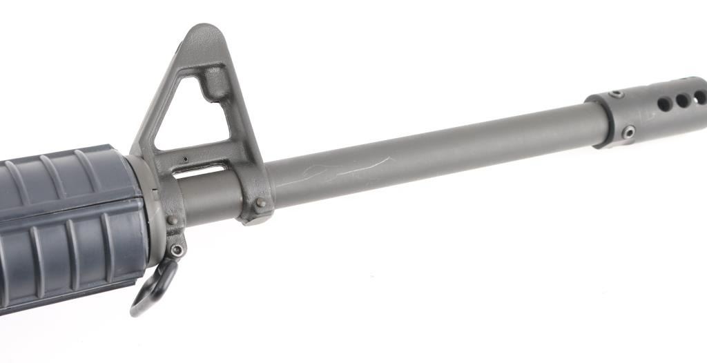 Semi-automatic AR15 platform modern sporting rifle chambered in 5.56x45mm NATO. Features a matte black finish, factory 16" chrome lined 1/9 twist HBAR profile barrel, muzzle brake secured with set screws, carbine length gas system, triangular front sight/gas block with bayonet lug, A2 upper receiver (with forward assist, shell defector & ejection port cover, adjustable rear peep sight), push button magazine release, manual safety, A2 style pistol grip & fixed shoulder stock, round carbine handguards with heat shields, sling swivels. Bore is very good. Retains 95% finish with handling marks. Polymer shows minor scratches. Mounts a very good condition Leapers 4x20mm scope with BDC, integral mount for the "carry handle", clear view. Includes one 30-rd aluminum magazine. Condition is NRA Excellent *** Modern Firearm ***