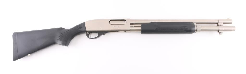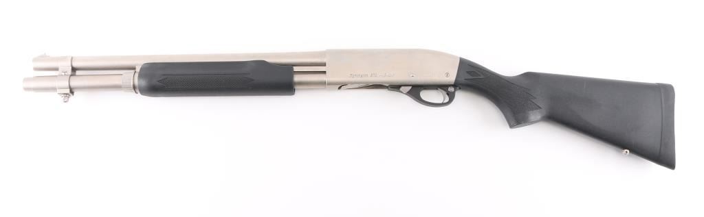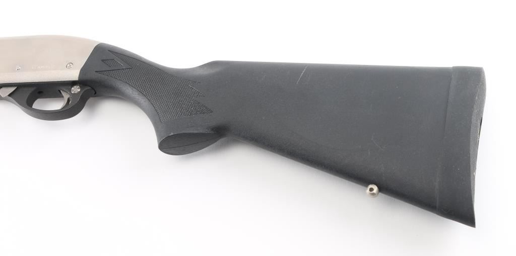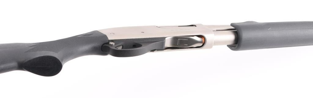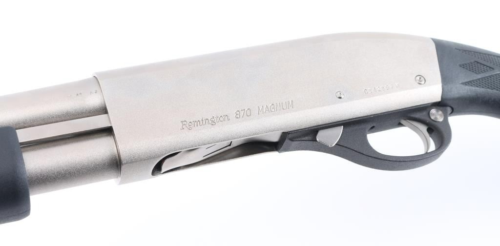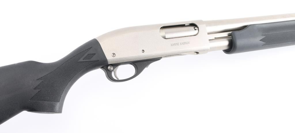 The 870 Special Purpose Marine Magnum™ is a modern pump action, 12ga shotgun, specifically made to resist corrosion from both fresh and saltwater. The receiver and barrel, and all other metal parts are plated with Electroless nickel, and the black synthetic stock and pump handle are impervious to water. The 18.5" barrel has a fixed cylinder choke for optimum performance with buckshot and slugs at close range. The extended magazine holds 6 rounds of either 2-3/4" or 3" shells, plus one in the chamber for a total of 7 rounds. It comes with sling swivel studs, push button safety, a durable rubber recoil pad and bead front sight. Bore is very good condition. Externally in excellent condition with few handling marks, several scratches on butt stock. Condition is NRA Excellent *** Modern Firearm ***