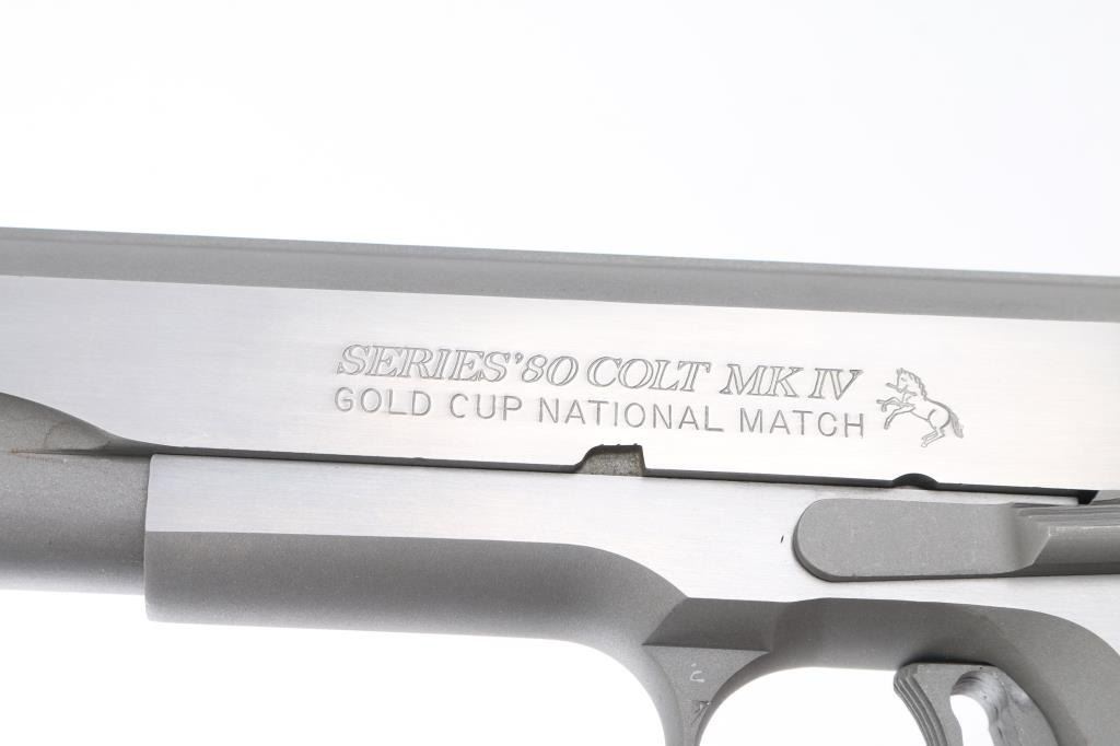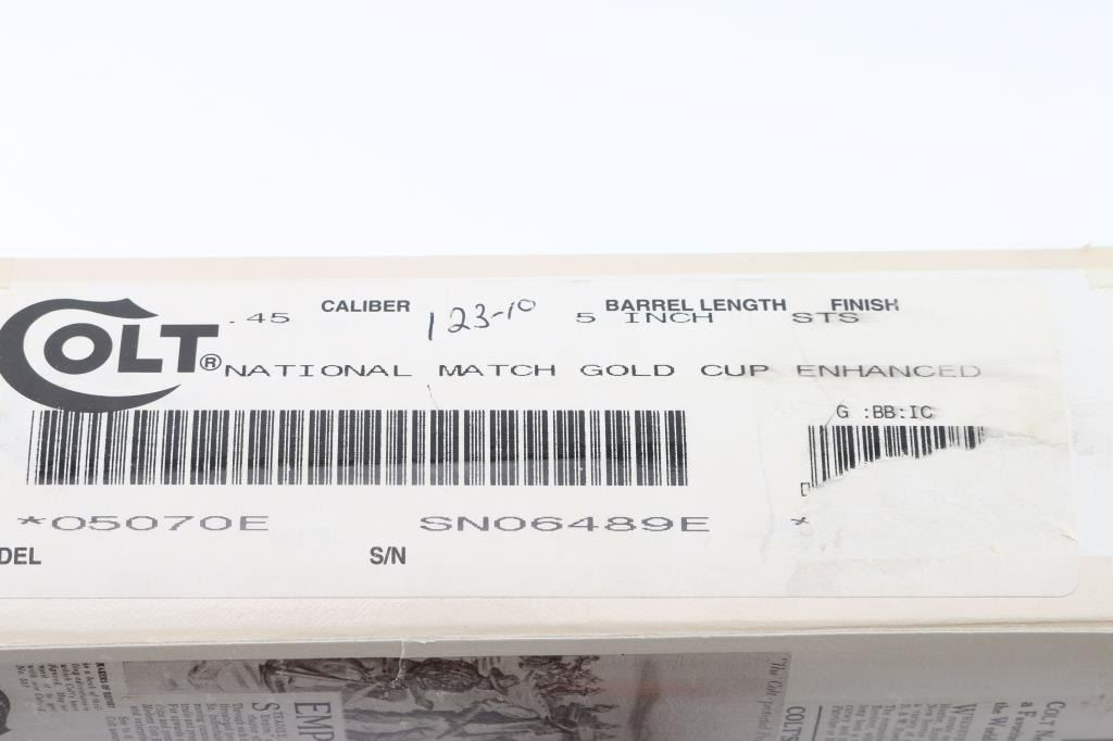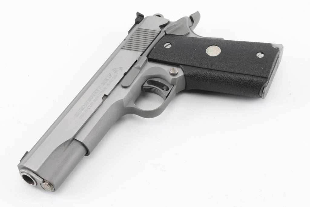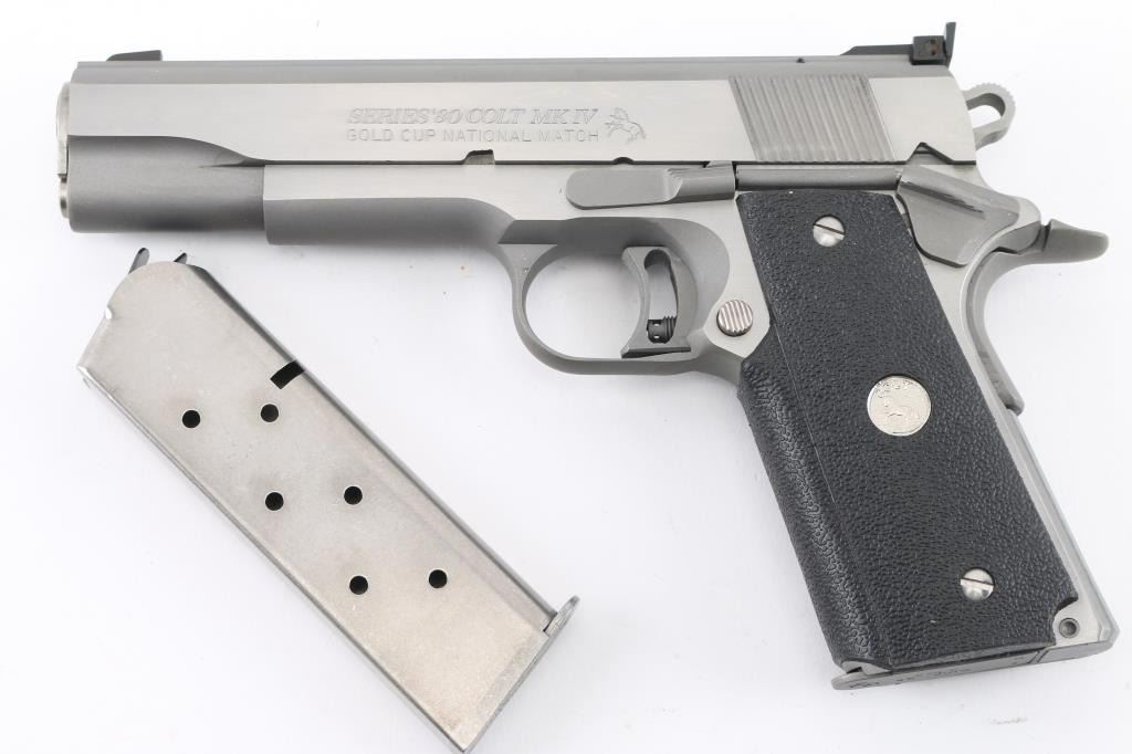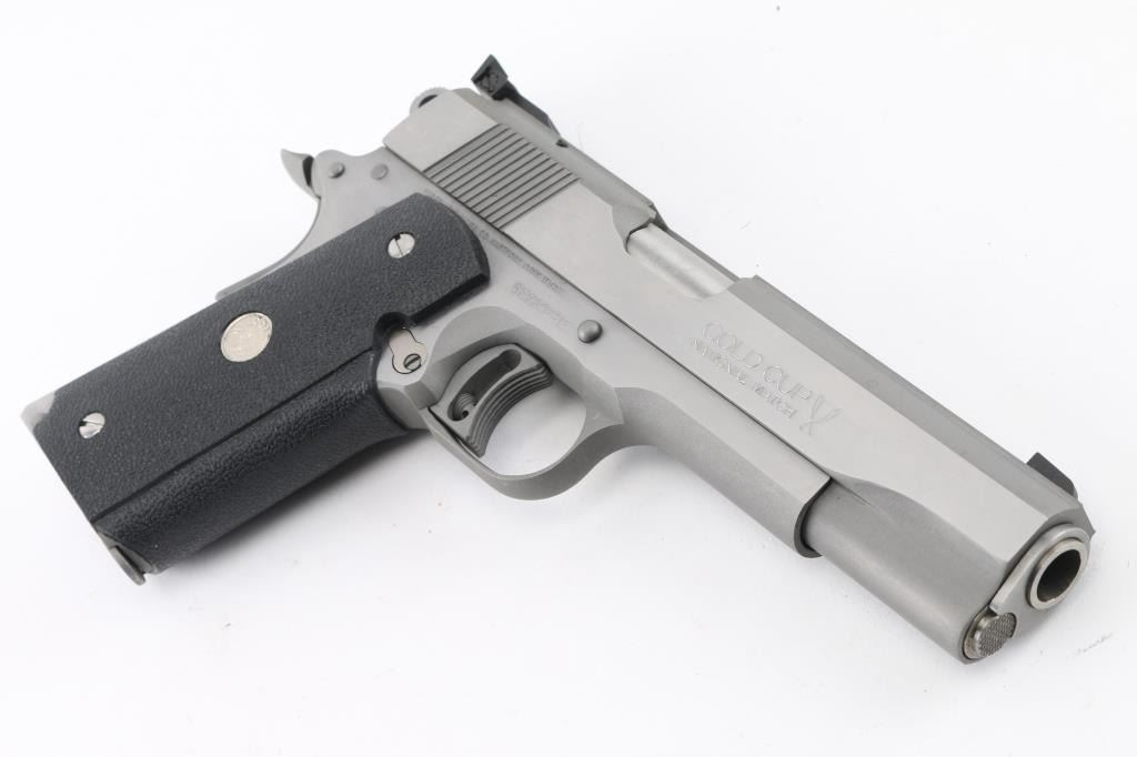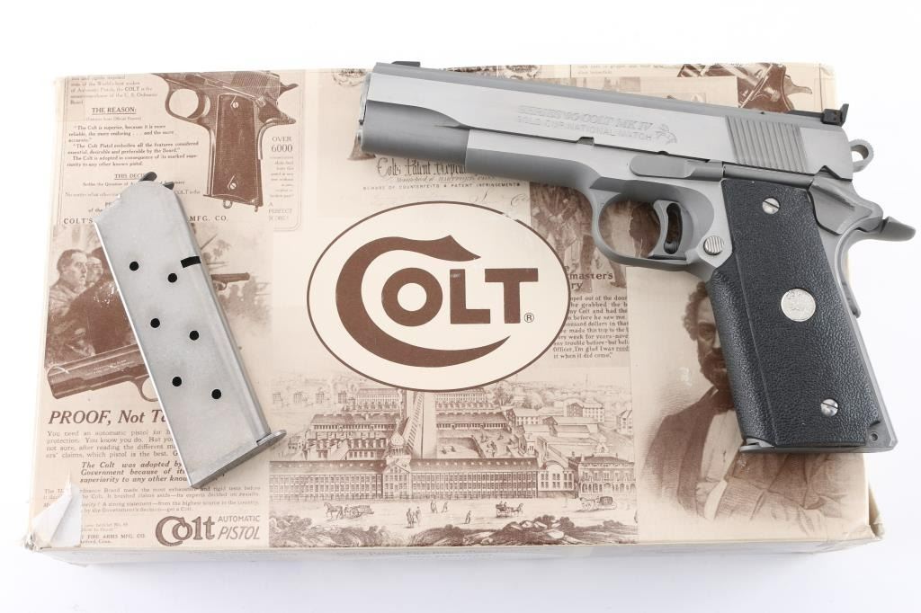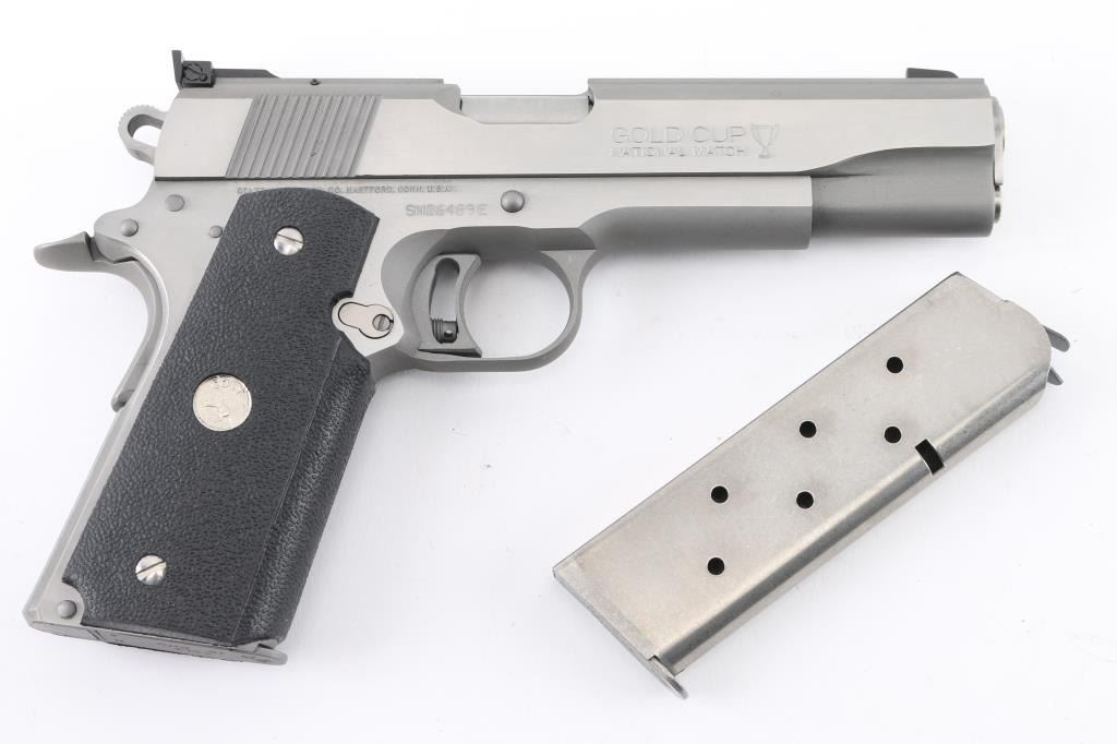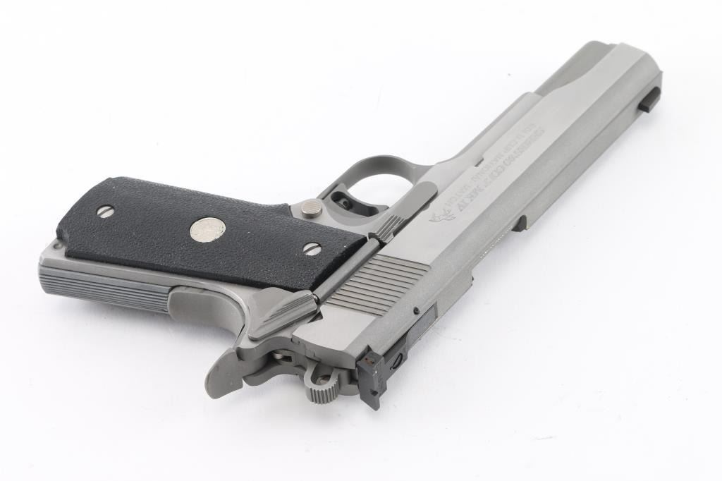 SN: SN06489E. Desirable 1911A1 pattern single action semi-automatic target pistol chambered in .45 Auto, manufactured circa 1993. Features stainless steel construction, matte finish with polished flats, 5" N.M. barrel, partridge front sight, fully-adjustable Elliason rear sight, wide serrated trigger with overtravel adjustment, serrated skeletonized hammer, manual safety on the left side of the frame, beavertail grip safety, push button magazine release, serrated flat mainspring housing, textured black rubber wrap around grips with silver color Colt medallions. Bore is excellent/bright. Condition of this pistol is new with few minor blemishes. Includes Colt blue plastic box, manual, matching Colt cardboard box, (2)Colt magazines. Condition is NRA Excellent - Near Perfect in Box. Modern Firearm