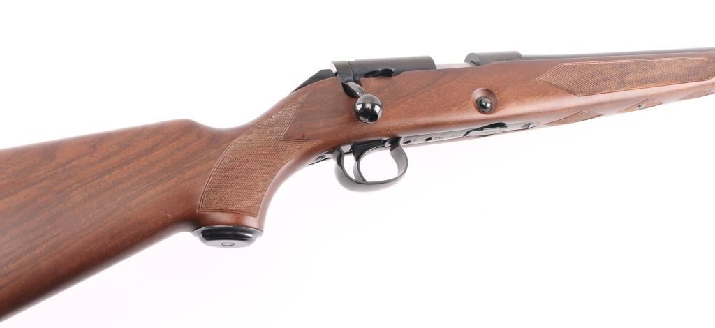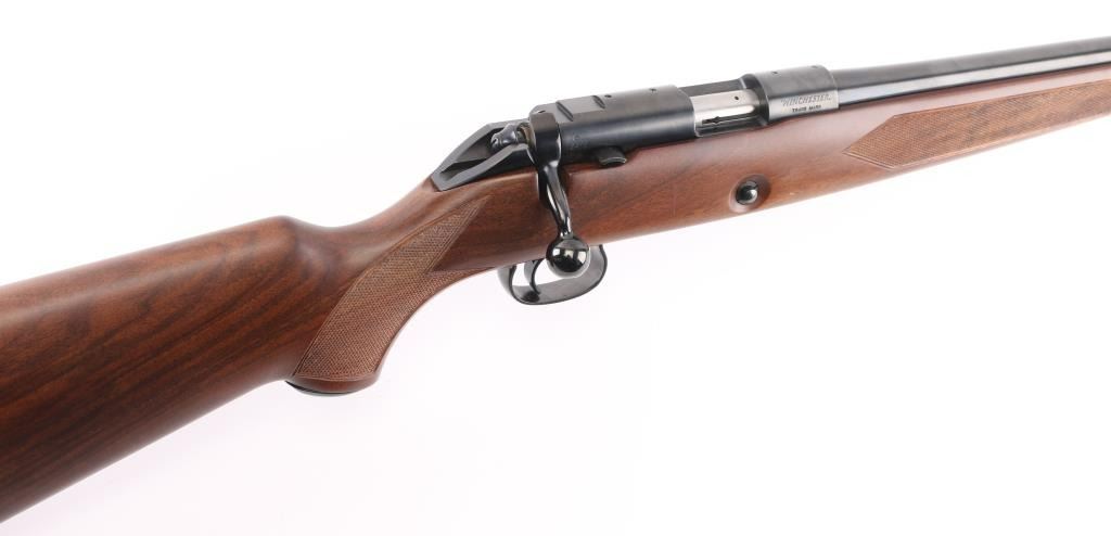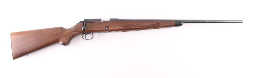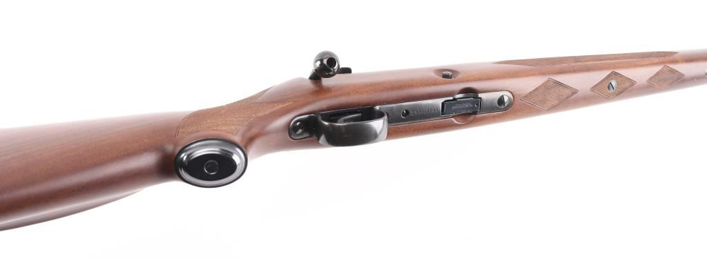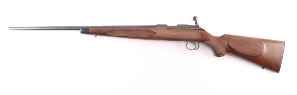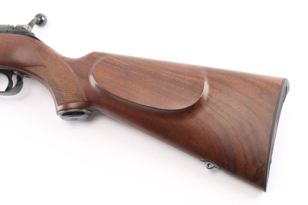 SN: 10NR801674 Bolt action rifle manufactured in Japan for US Repeating Arms Co, circa 1997. Features blued finish, highly figured checkered walnut stock, checkered steel buttplate, 24" tapered barrel, no sights, receiver drilled & tapped across top, manual safety, push button release on right side of stock for detachable magazine, European style inlet oval base sling studs. Bore is pristine. Retains 98% blued finish with minor handling marks. Wood is like new with few minor blemishes. Includes (1) magazine. Condition is NRA Excellent - like new *** C&R Firearm ***