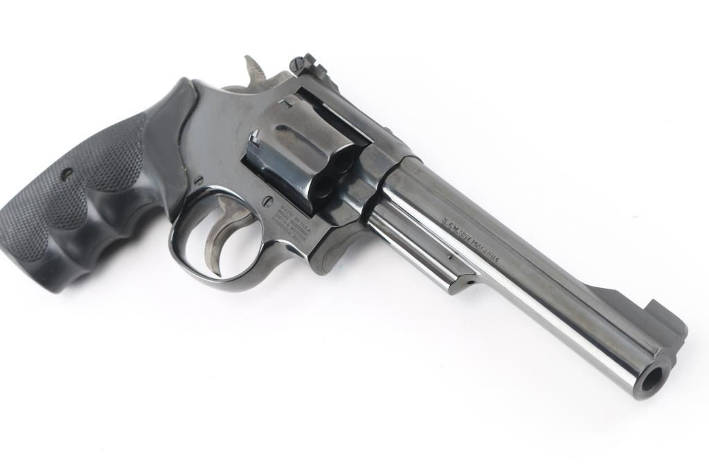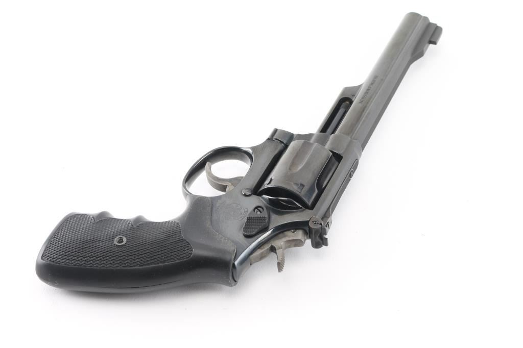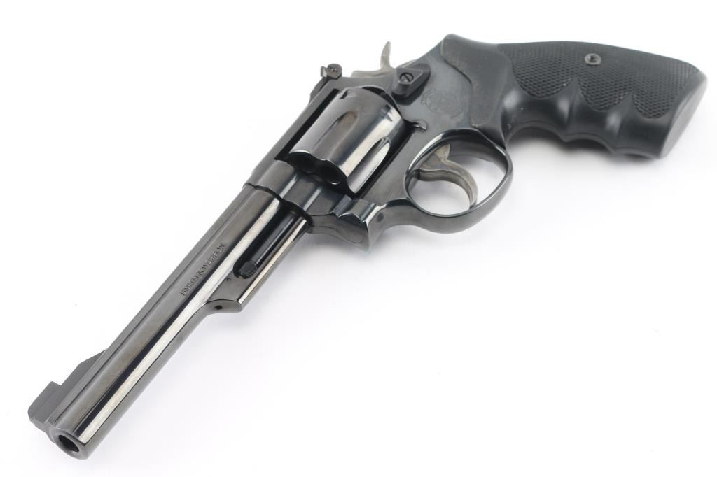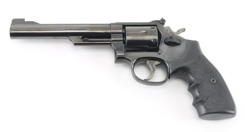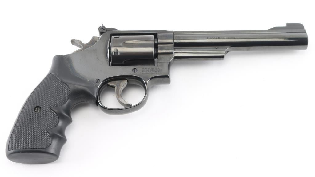 American made 6 shot revolver chambered for .357 magnum ammunition. It features a blued finish over a K target frame, a 6" barrel, black raised blade front sight, adjustable black rear sight, 6 shot fluted cylinder, and color case hardened hammer and trigger. Trigger is serrated, knurled hammer spur. Black rubber "checkered" finger groove grips. Bore and cylinders look great, bright. Metal finish looks great with only a faint drag line on the cylinder. Grips are fine. Condition is NRA Excellent. *Modern Firearm*