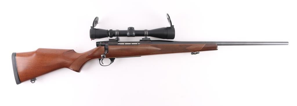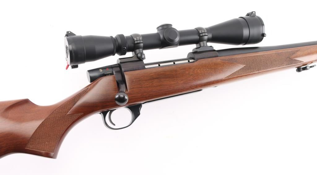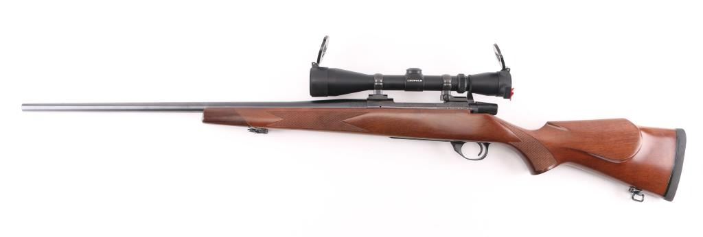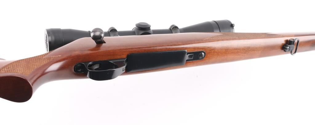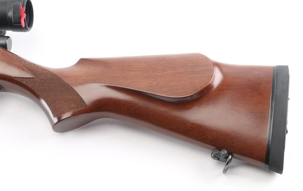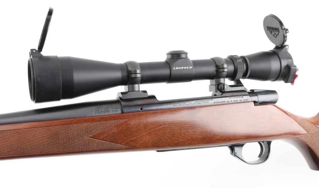 Made in Japan for Weatherby, Atascadero, CA. Bolt action rifle chambered for 257 Weatherby Magnum. Features blued finish, checkered wood stock with right handed cheekpiece, solid rubber butt pad, sling studs with detachable swivels, 24" barrel, no metallic sights, two piece Leupold base & rings, hinged floorplate, manual safety. Bore is very good condition. Retains 98% dark bluing, with handling marks. Stock is excellent condition. Mounts a near new condition Leupold VX-II 3-9x40mm scope with clear view. Condition is NRA Excellent - like new *** Modern Firearm ***