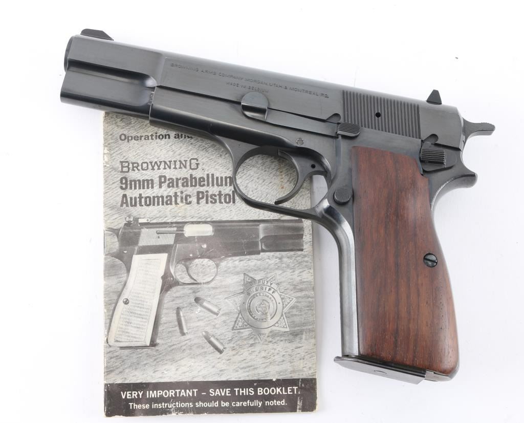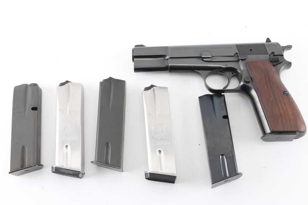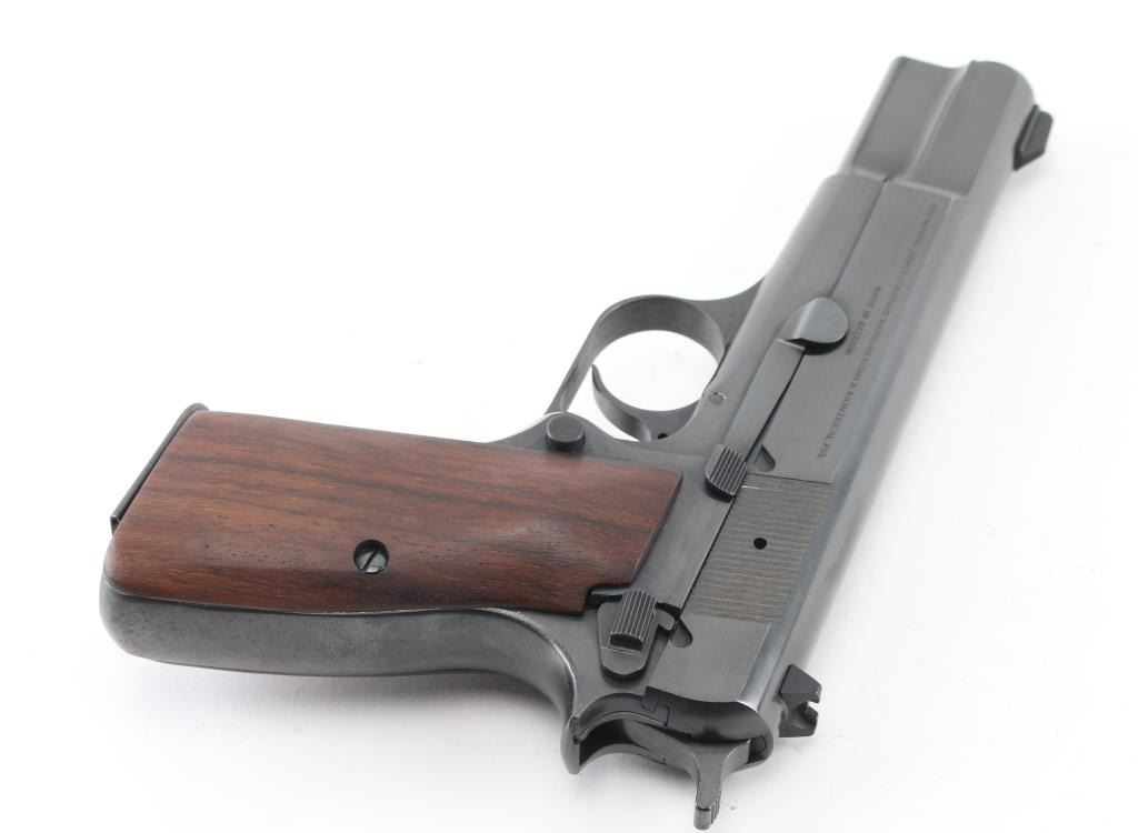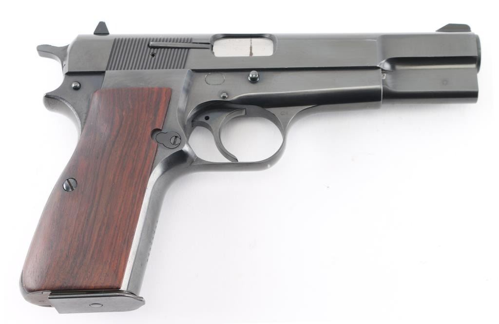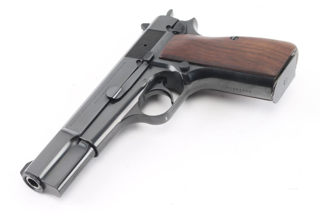 "C" series Belgian semiautomatic pistol chambered for 9x19mm Luger, manufactured circa 1975. Features 4.5" barrel, serrated spur hammer, fixed sights, blued finish, smooth wood contoured grips, single action trigger, frame mounted manual safety, magazine disconnect safety has been removed. Bore is very good condition. Retains 90% finish with handling marks, fading to patina on backstrap. Includes (1) magazine. Condition is NRA Very Good+ *** Modern Firearm ***